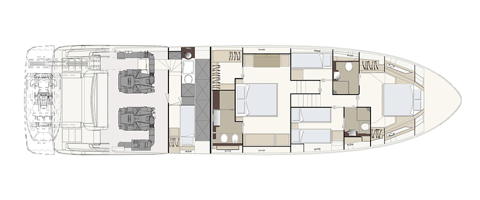 On the lower deck, the layout offers four guest cabins and three bathrooms, thoughtfully designed to provide comfort and privacy. The full-beam master suite amidships is spacious and finished with high-quality materials, while the forward VIP cabin and two twin guest cabins complete the accommodation for a total of eight berths.