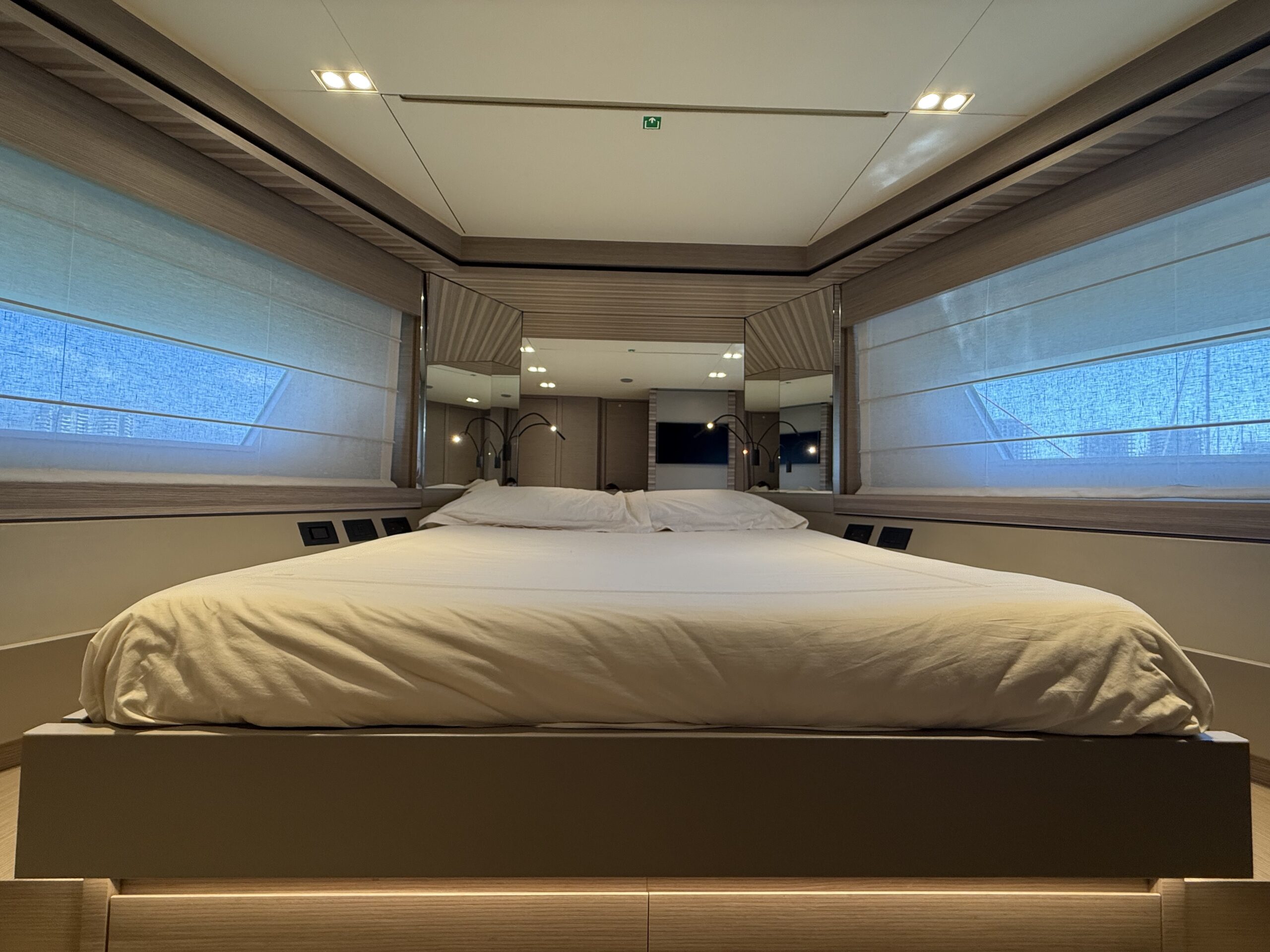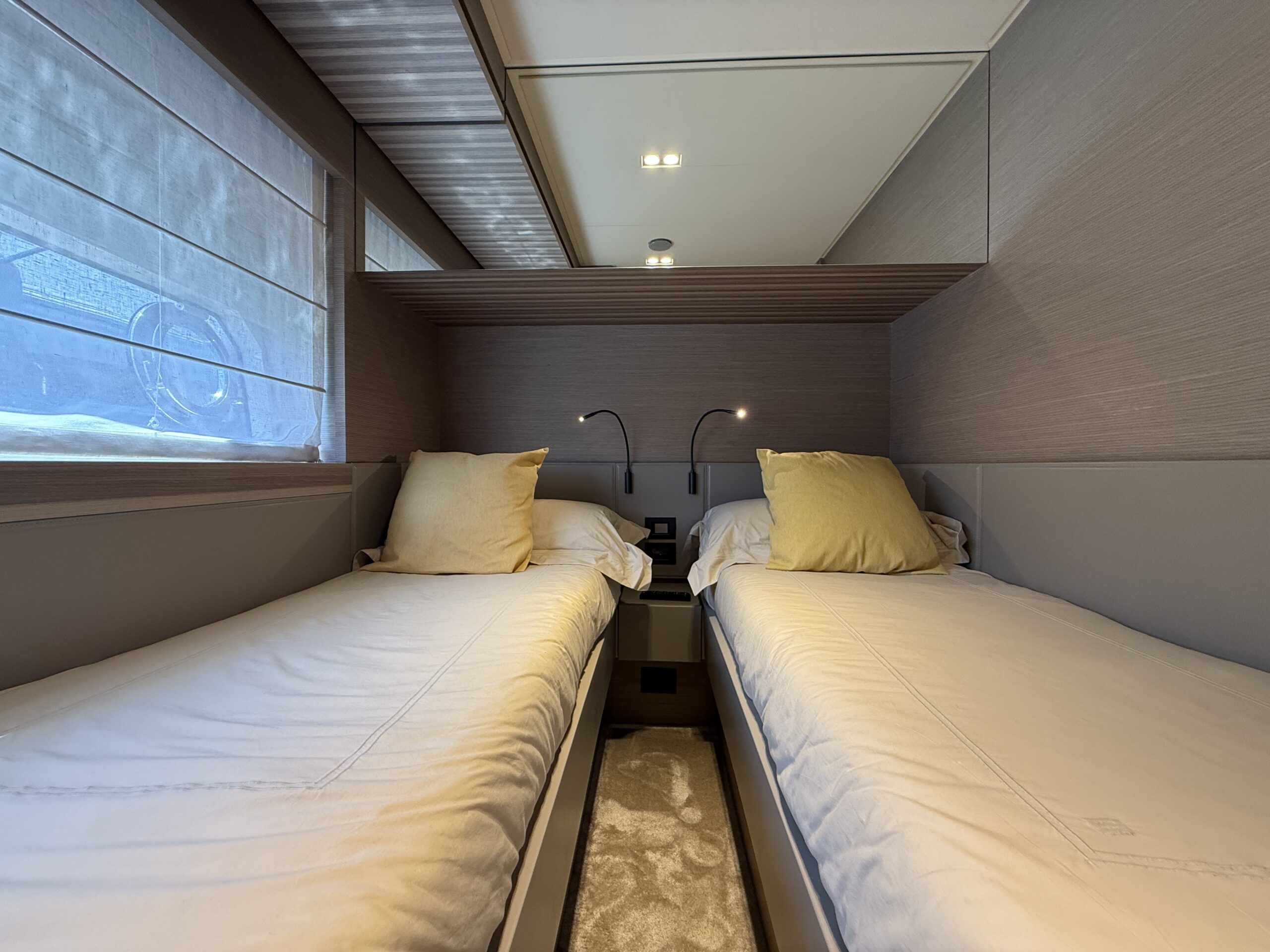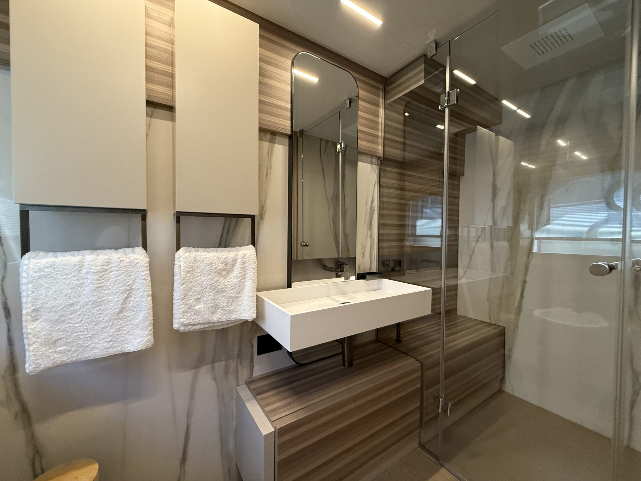 On the lower deck, the layout offers four guest cabins and three bathrooms, thoughtfully designed to provide comfort and privacy. The full-beam master suite amidships is spacious and finished with high-quality materials, while the forward VIP cabin and two twin guest cabins complete the accommodation for a total of eight berths.
