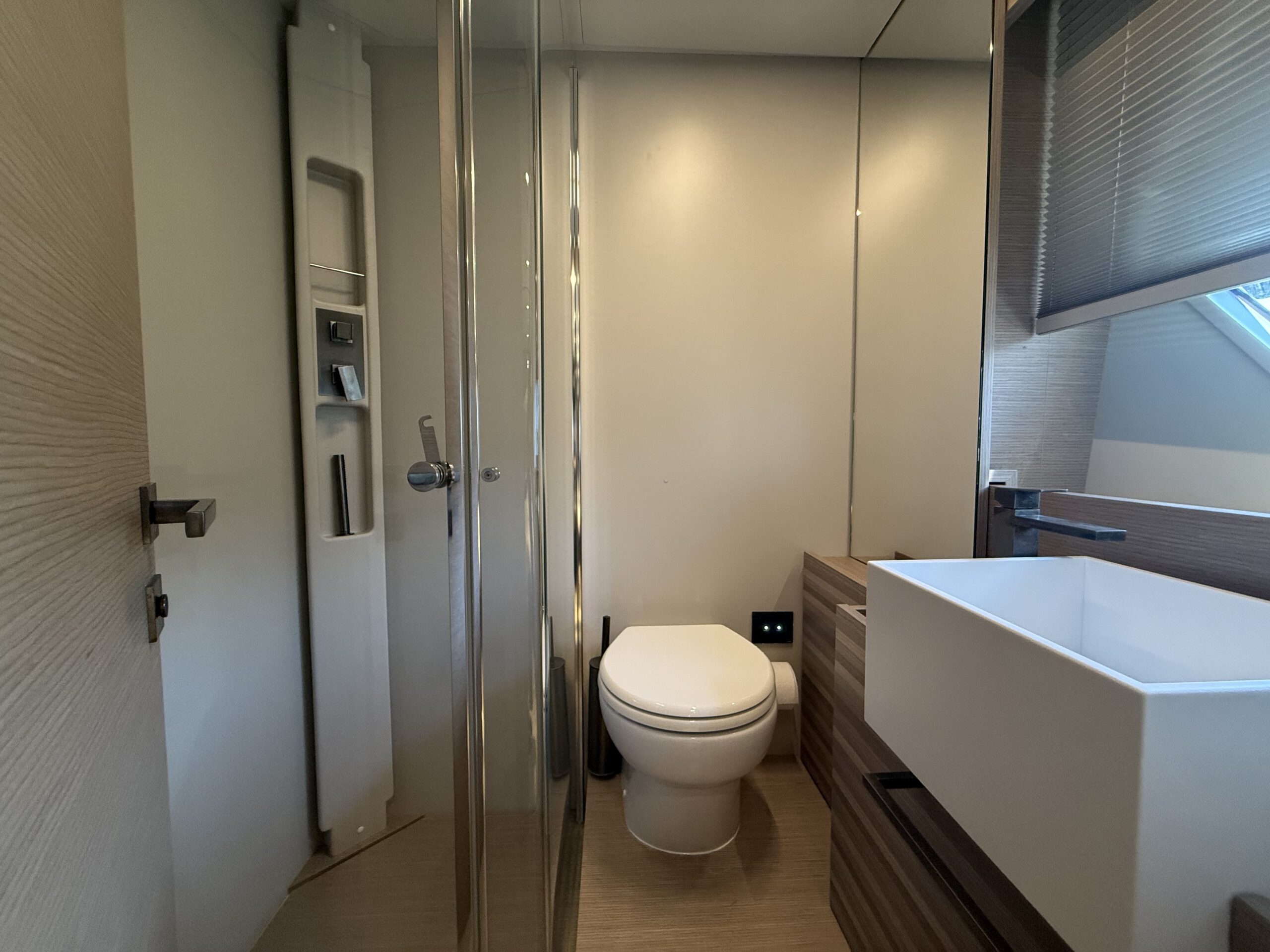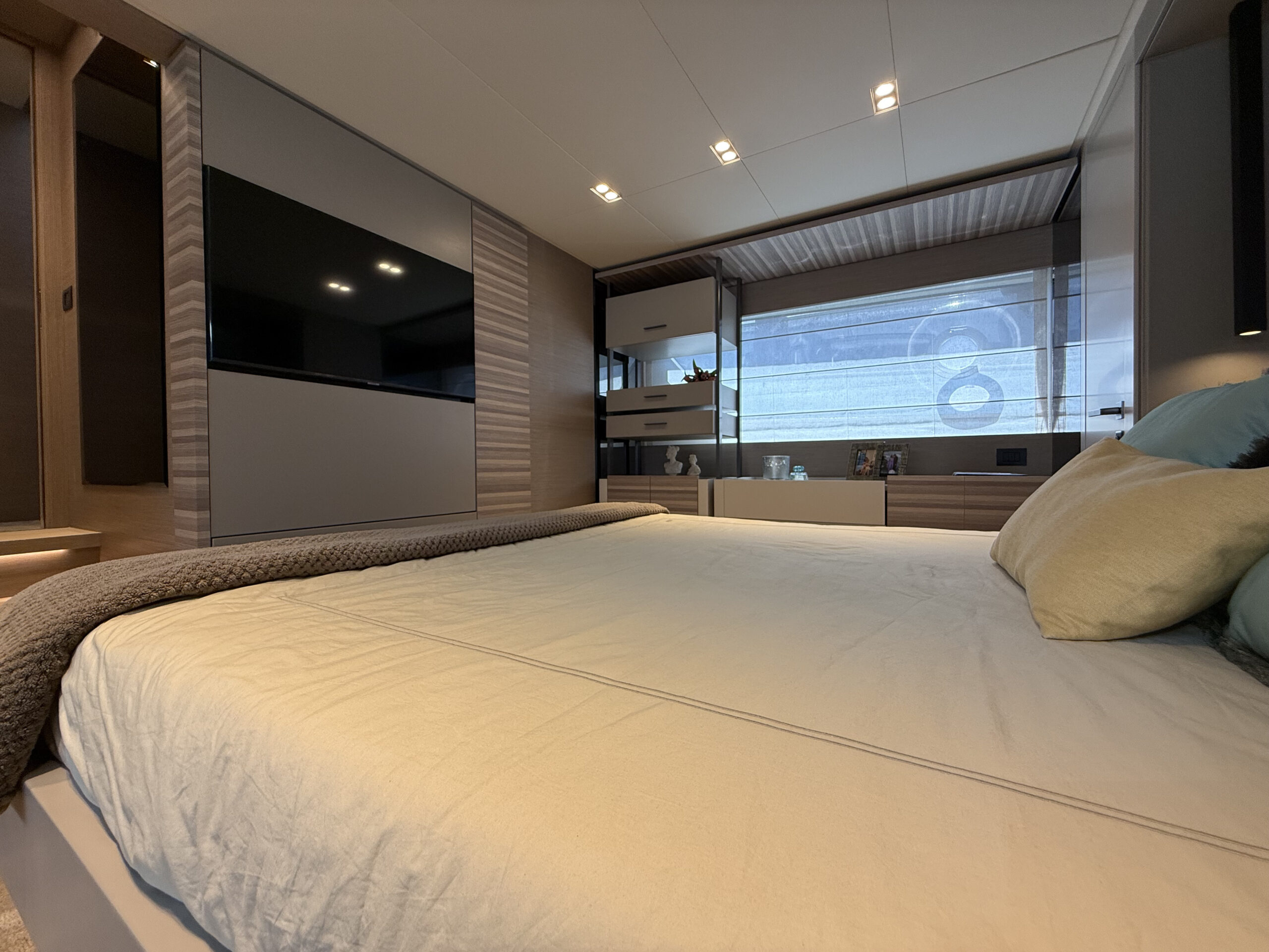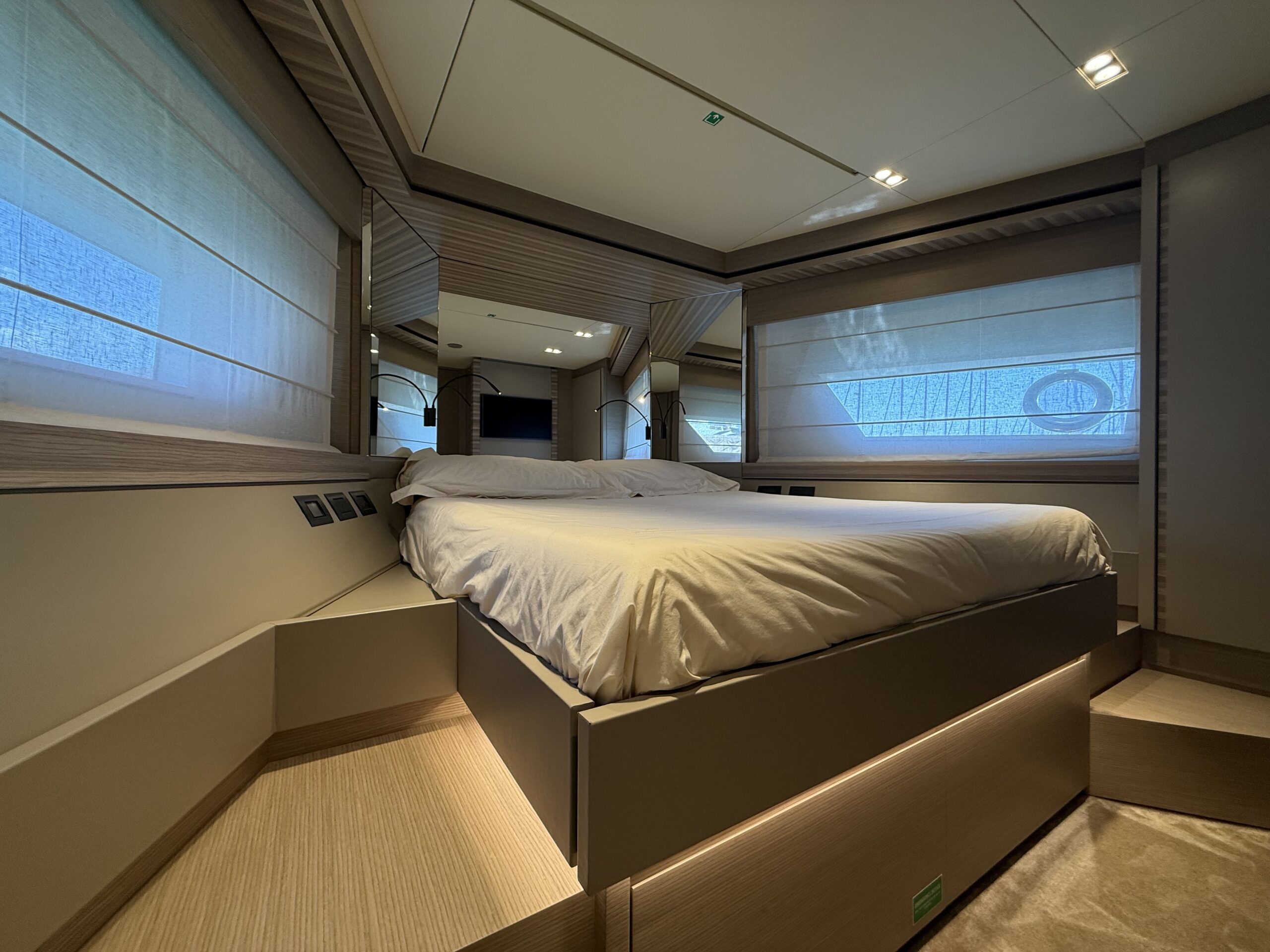On the lower deck, the layout offers four guest cabins and three bathrooms, thoughtfully designed to provide comfort and privacy. The full-beam master suite amidships is spacious and finished with high-quality materials, while the forward VIP cabin and two twin guest cabins complete the accommodation for a total of eight berths.