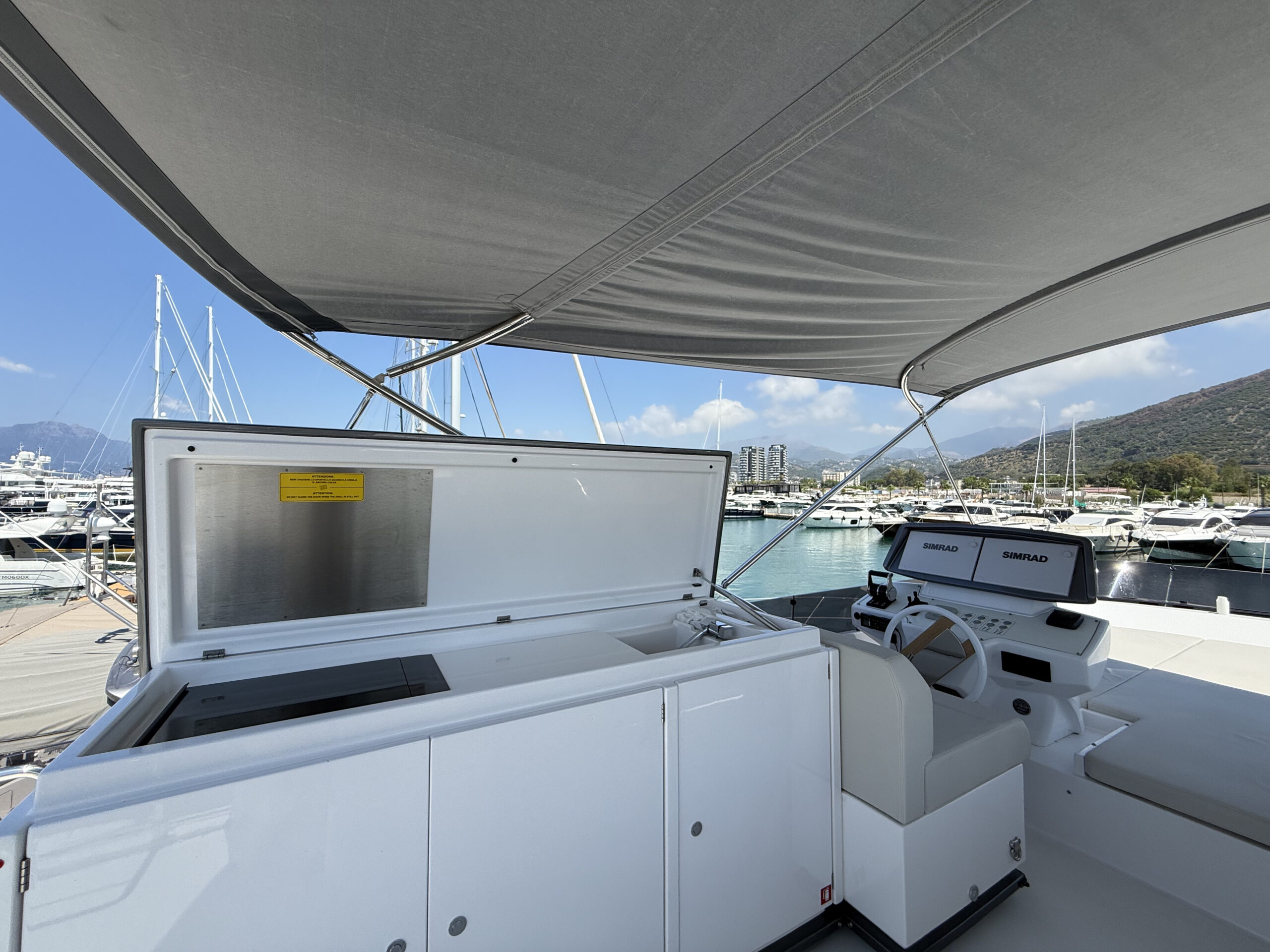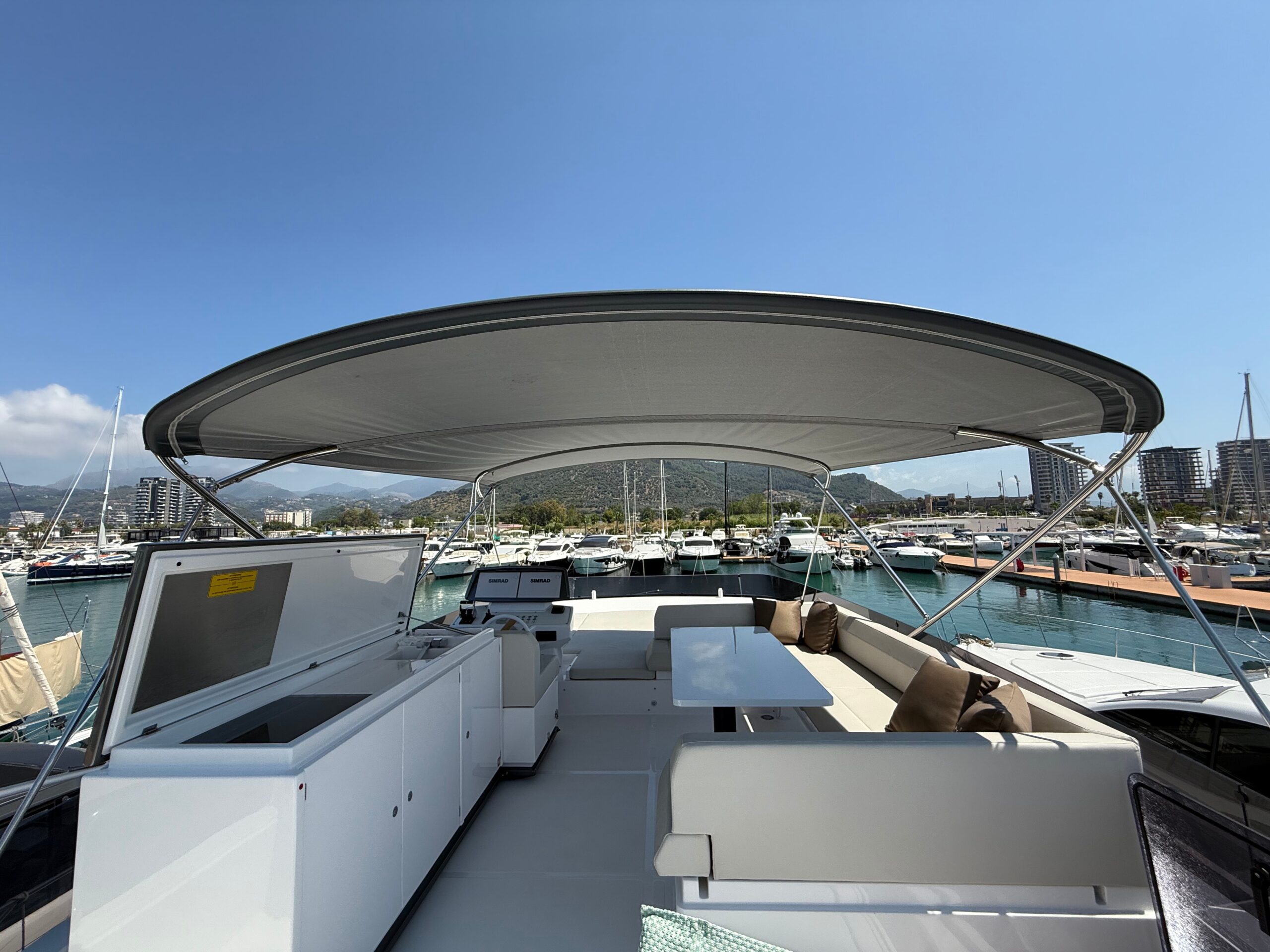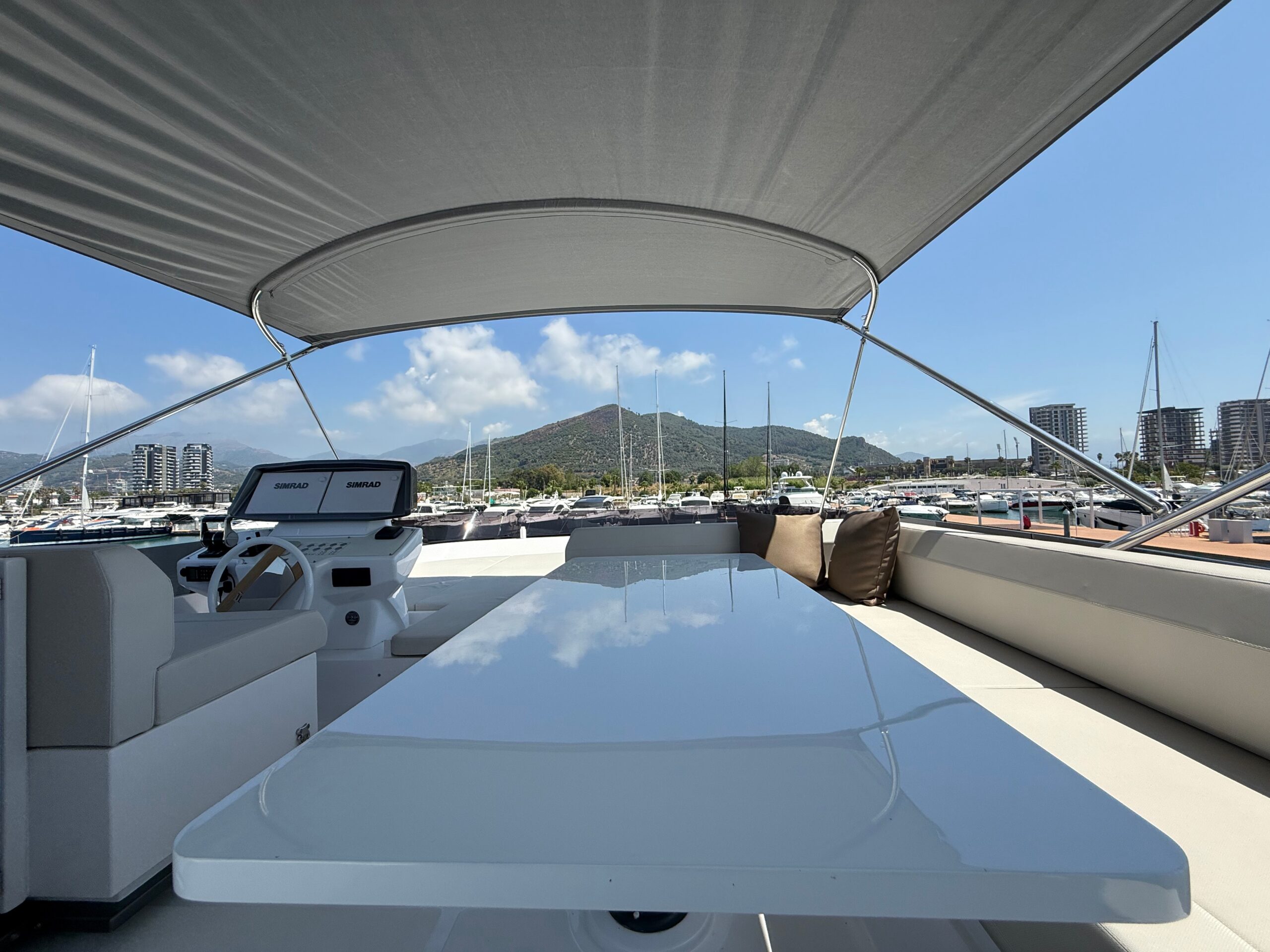 The flybridge provides a welcoming, private space to unwind or entertain, with a privileged panoramic view.