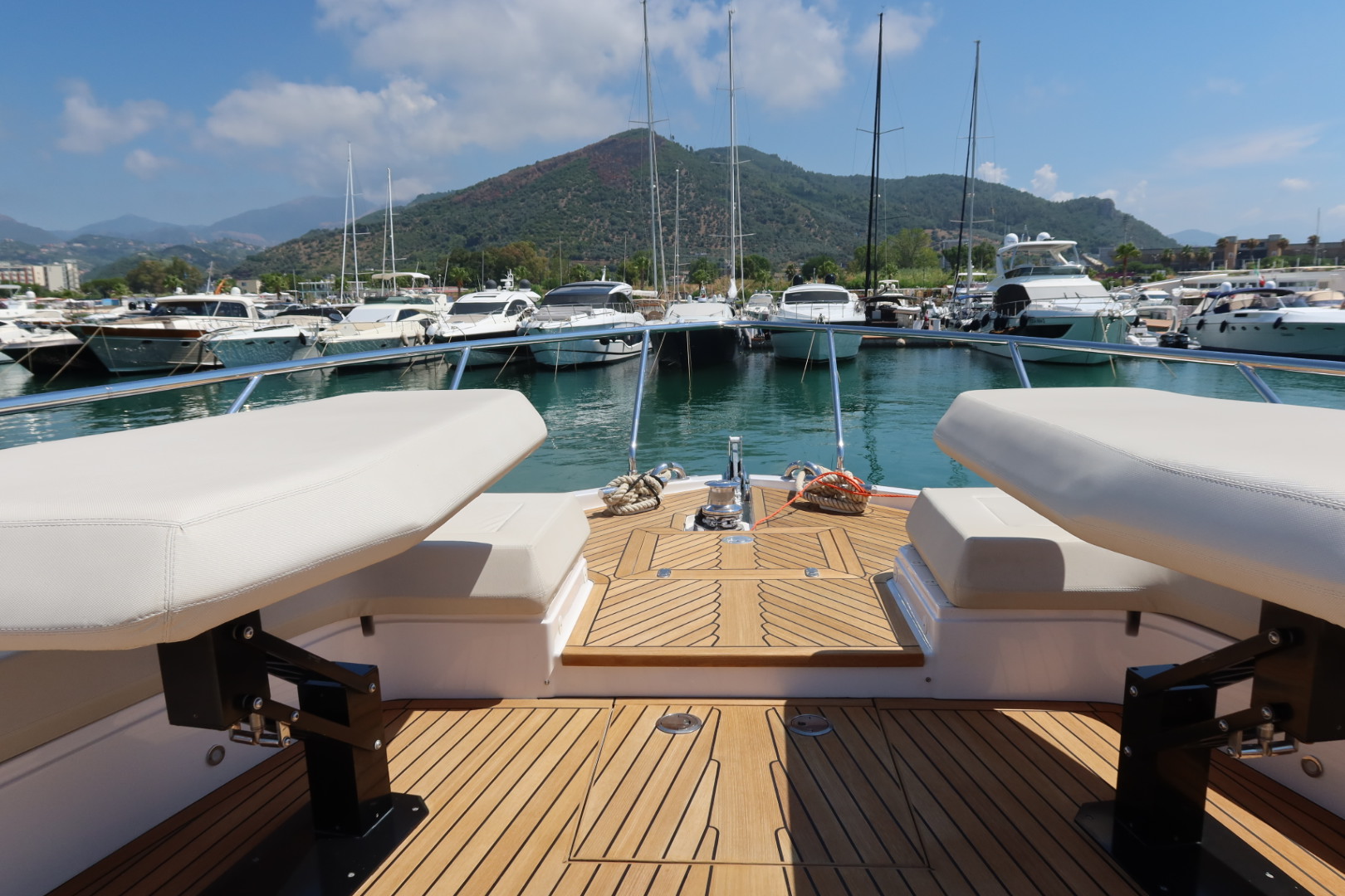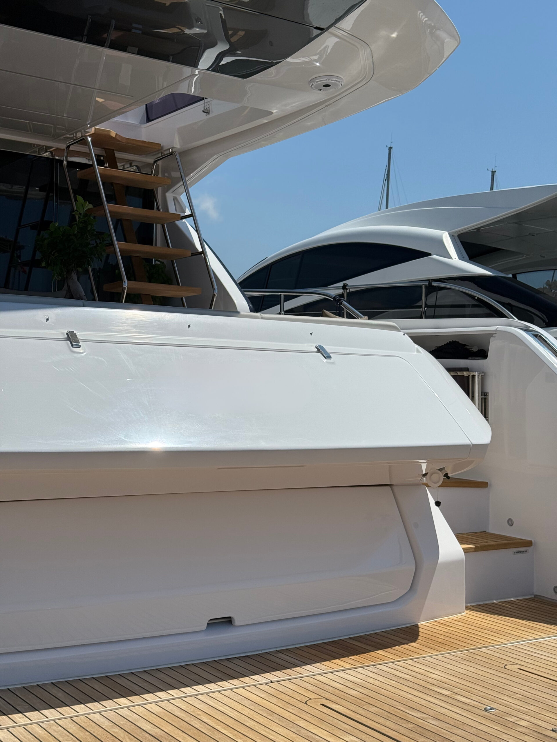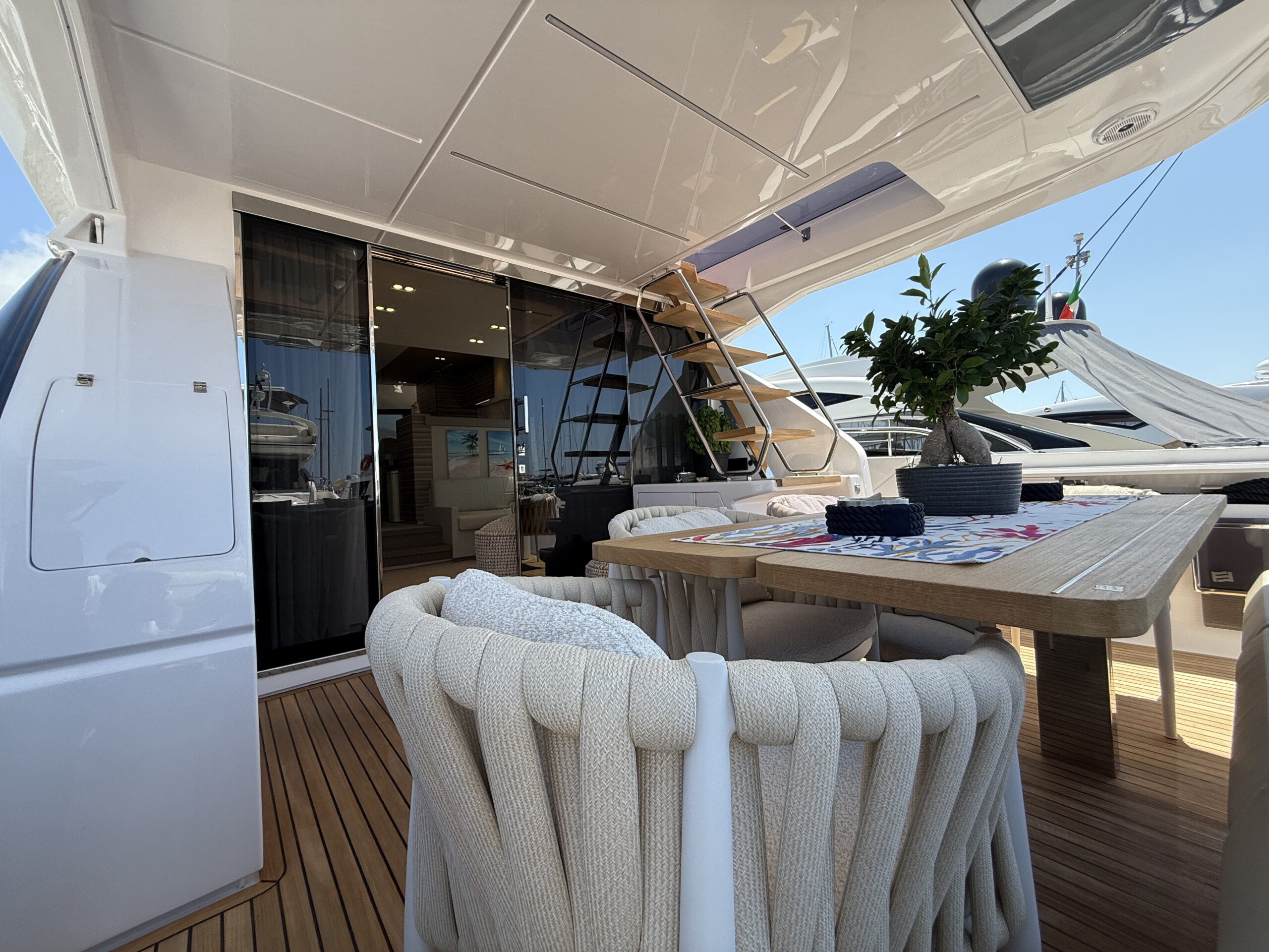 Outside, the cockpit functions as an elegant open-air lounge, ideal for alfresco dinners or sunset aperitifs, with direct access to the generous teak-finished swim platform, perfect for enjoying the sea up close or handling the tender and water toys with ease.
