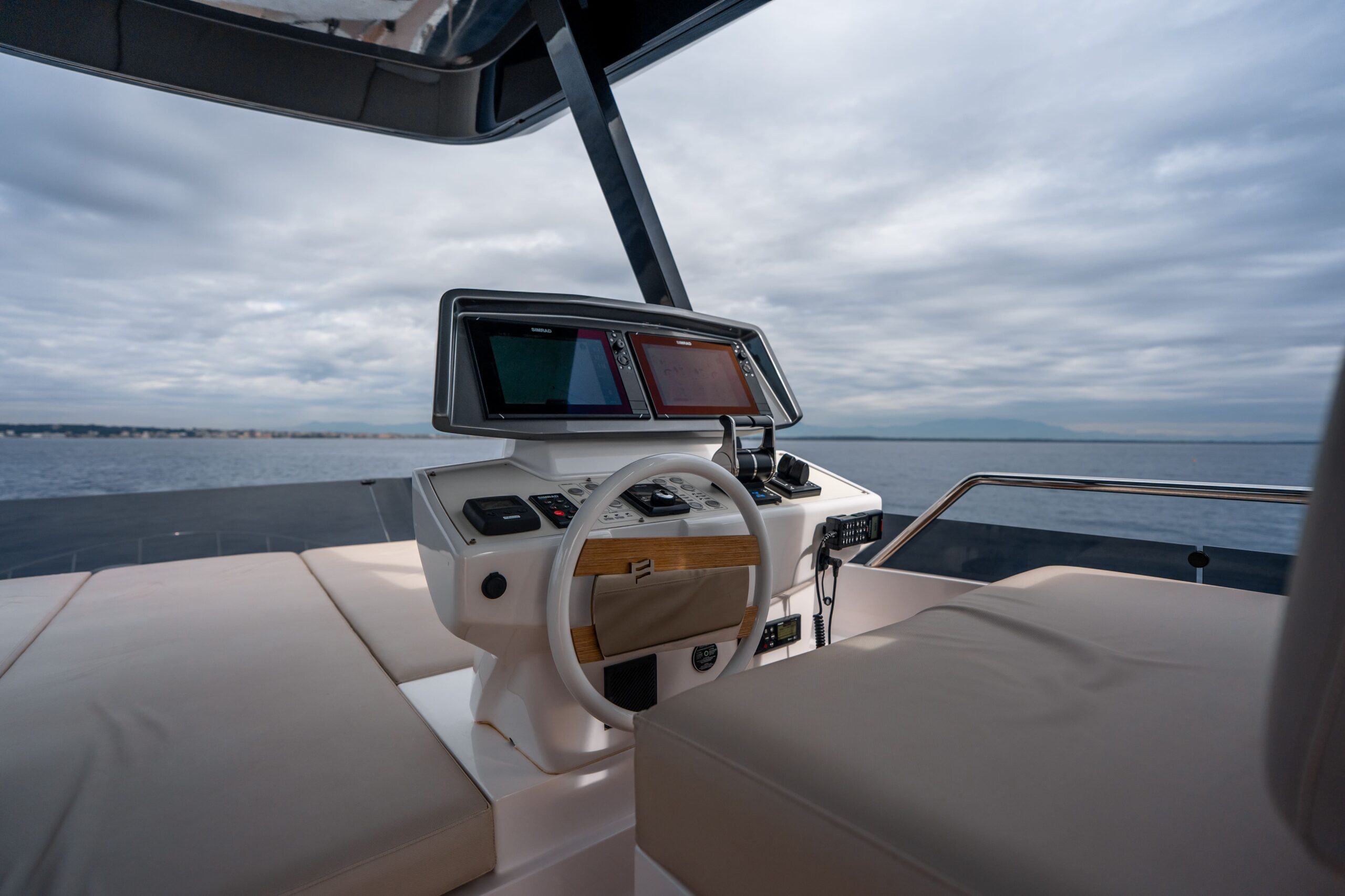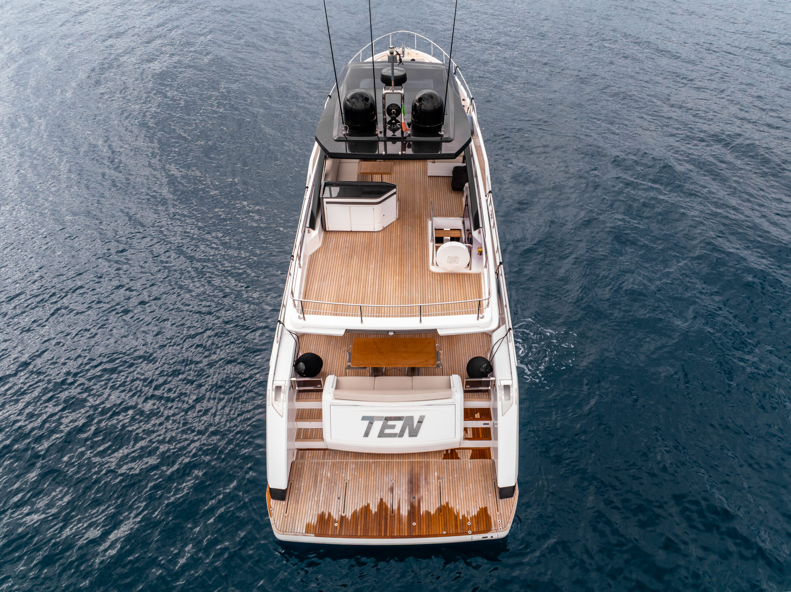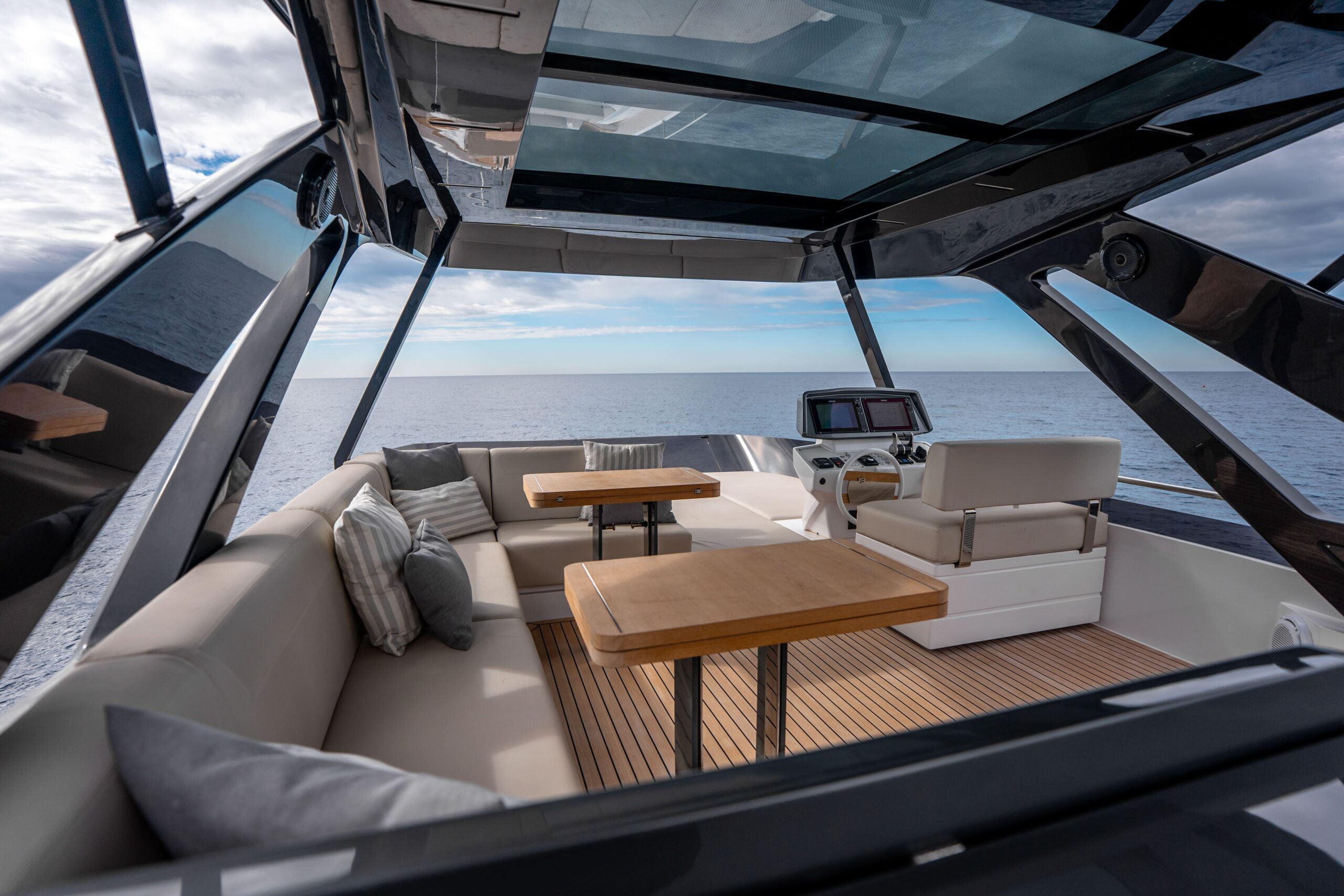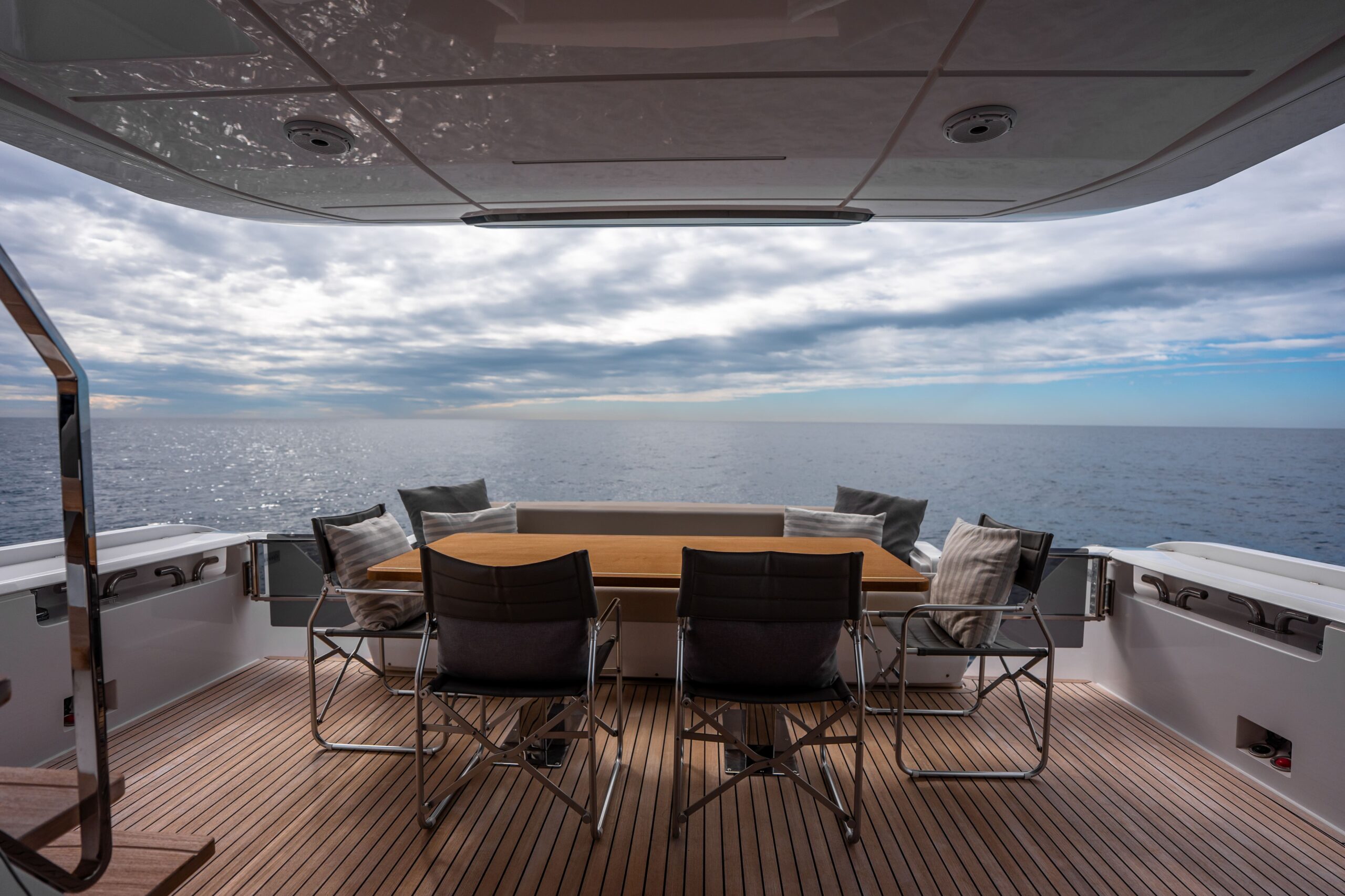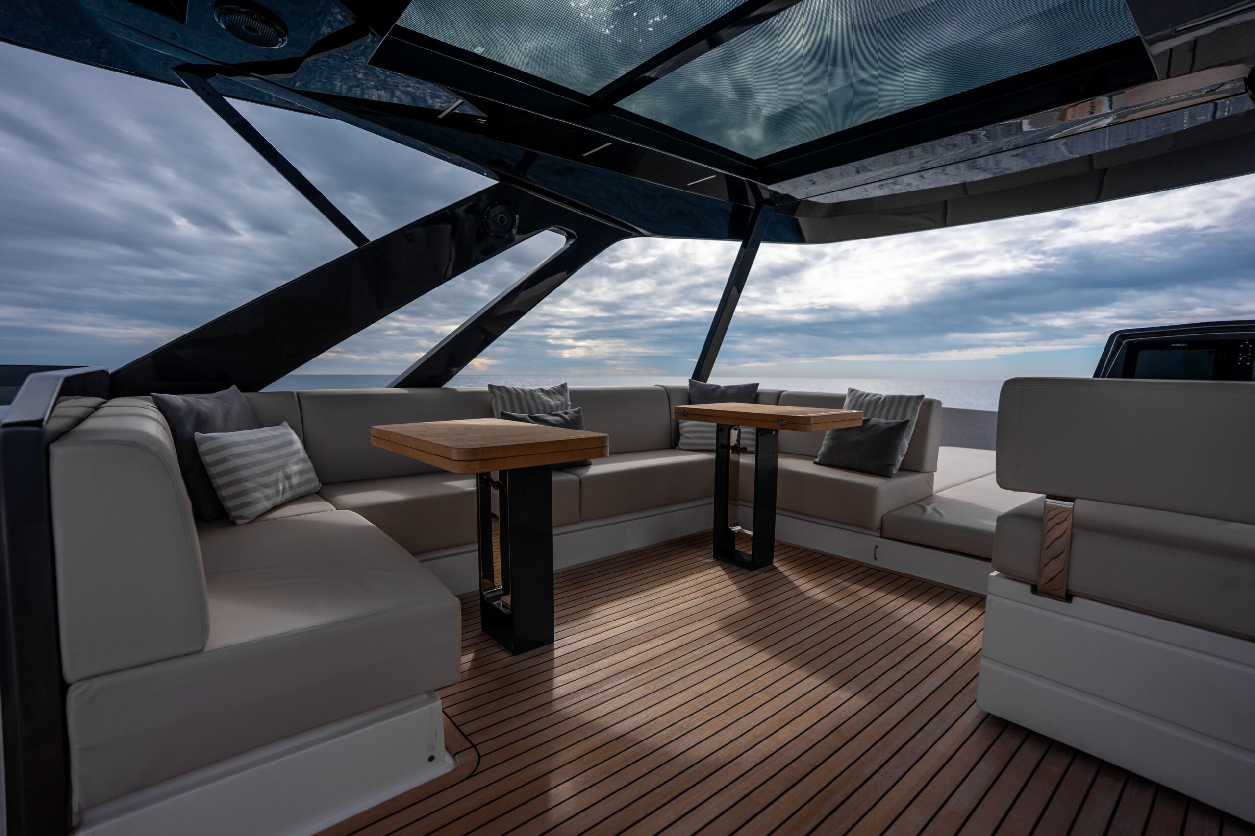 The flybridge offers a refined relaxation area shaded by a glass hard top, and features a teak dining table, grill, refrigerator, and a large aft sunpad. The cockpit serves as a tranquil lounge space, connecting the salon to the tender lift platform, which not only facilitates tender handling but also transforms into a spacious beach area. At the bow, a generous dining area with teak table is complemented by a wide sunbathing zone, perfect for enjoying the open air in comfort.