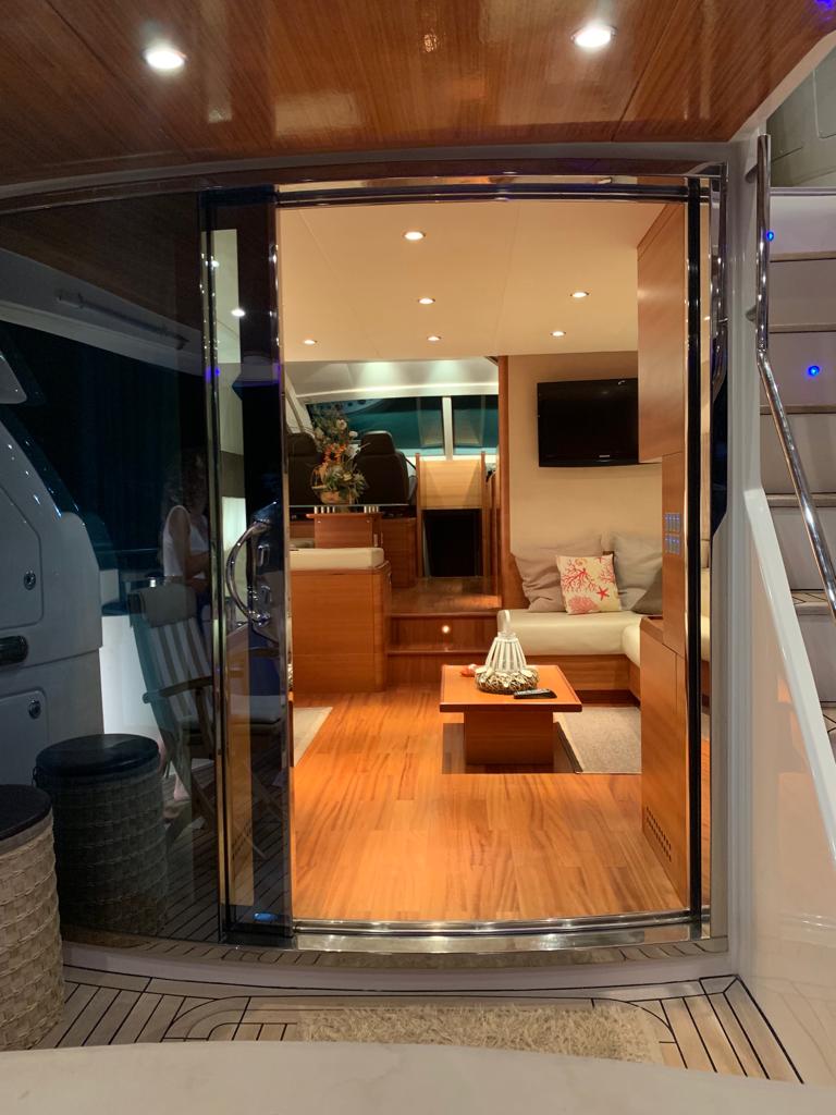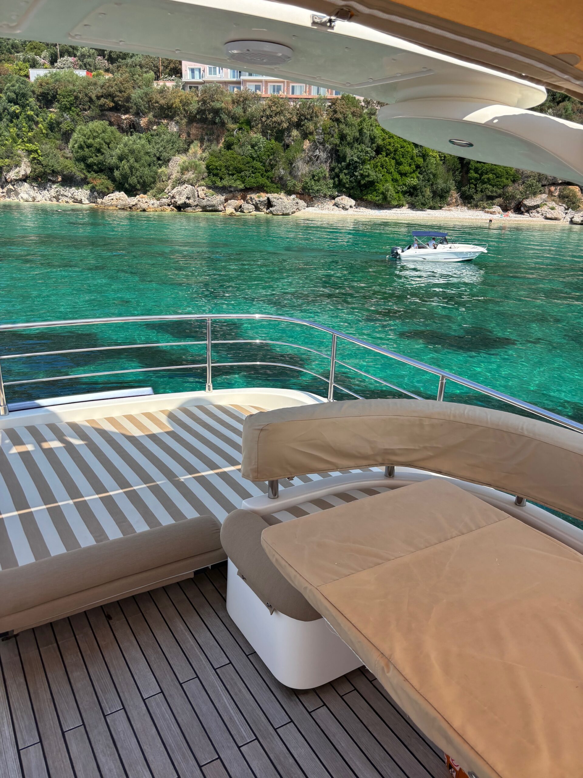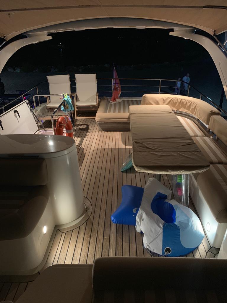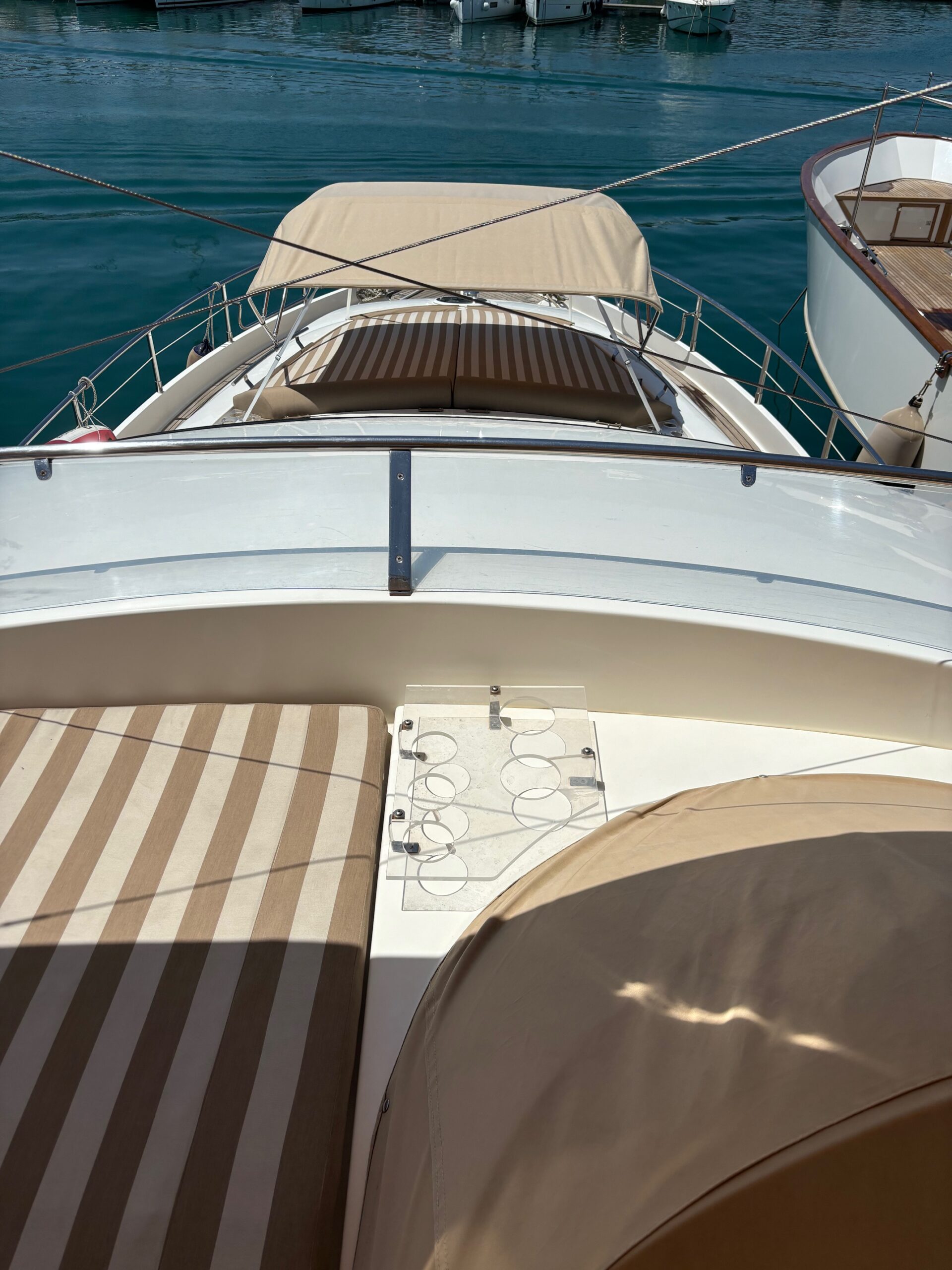 Sul flybridge, al posto del tender e della gruetta, è stato creato un ampio spazio relax con lettino prendisole doppio, tavolino e due sdraio, protetti da una battagliola in acciaio.