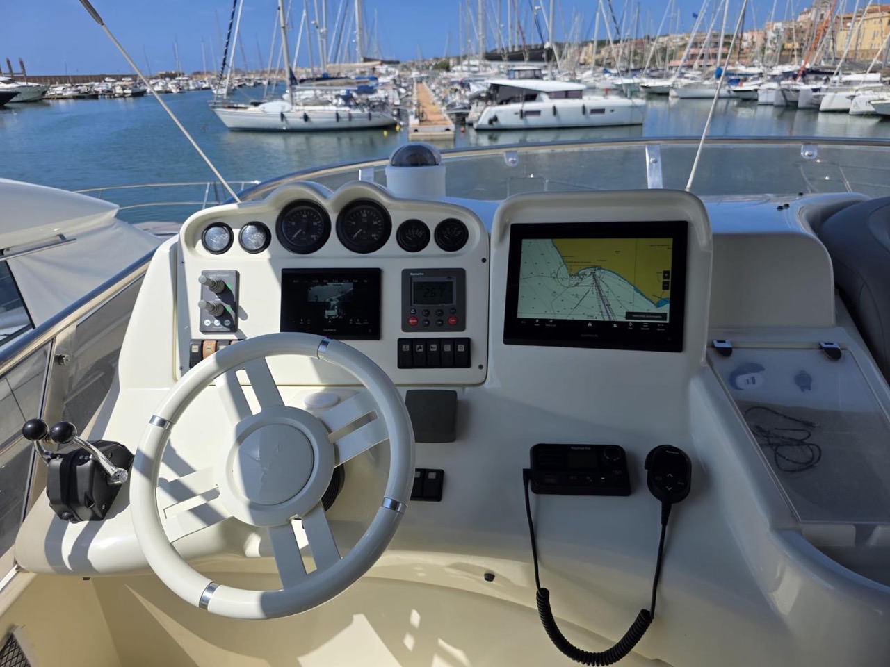 La parte elettronica non è da meno: un sistema Garmin completo, sia per la zona interna che per il flybridge, è stato integrato con l'interfaccia Caterpillar per consentire un monitoraggio dettagliato dei dati del motore direttamente sul plotter, offrendo il massimo controllo in ogni situazione di navigazione.