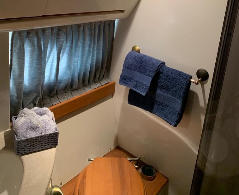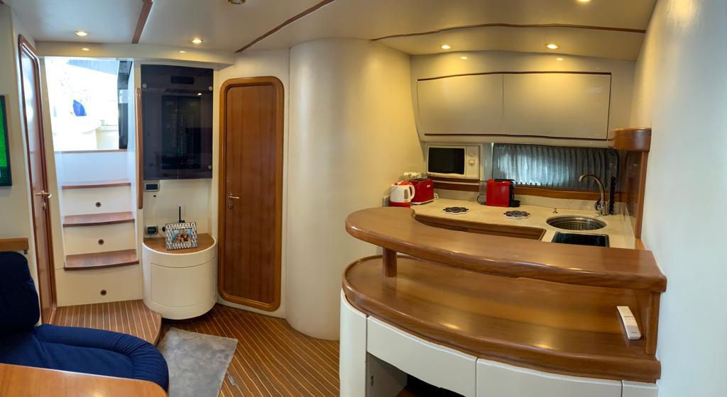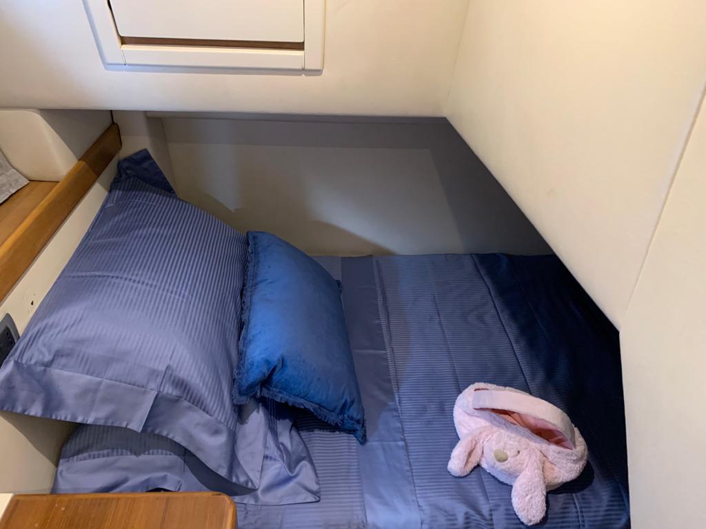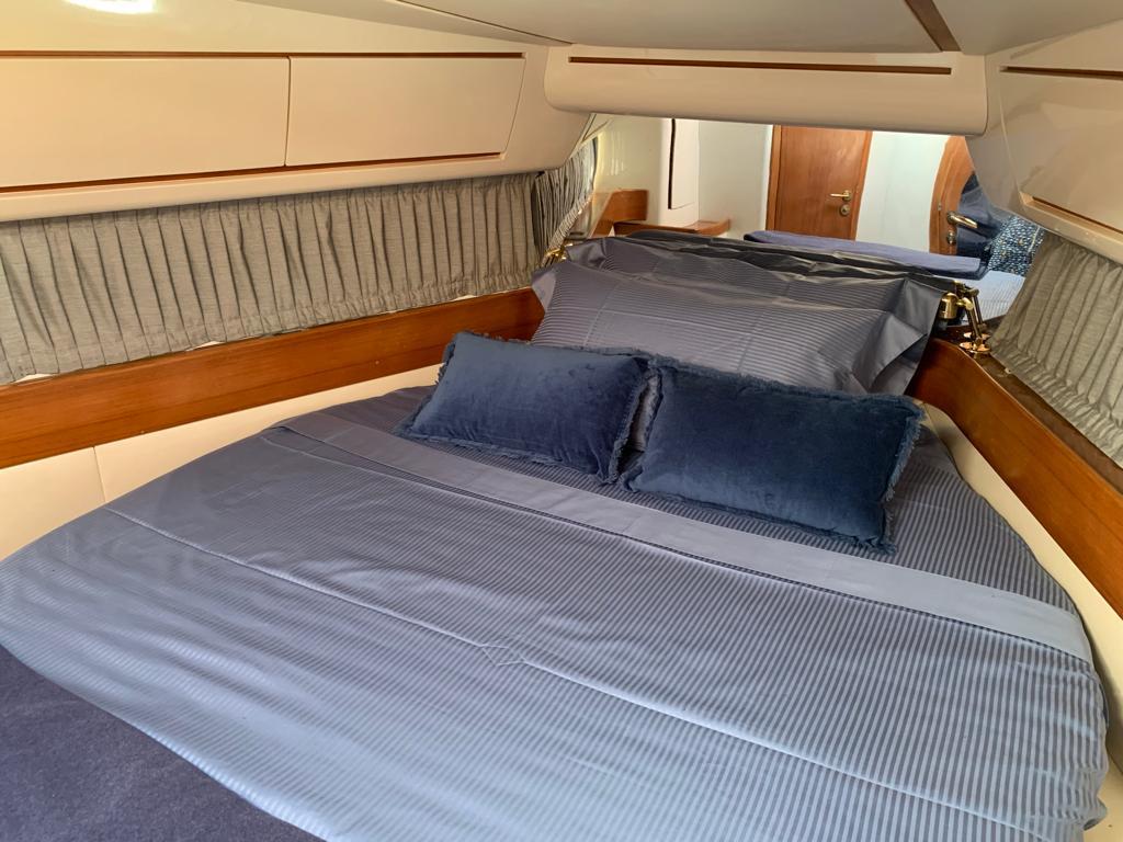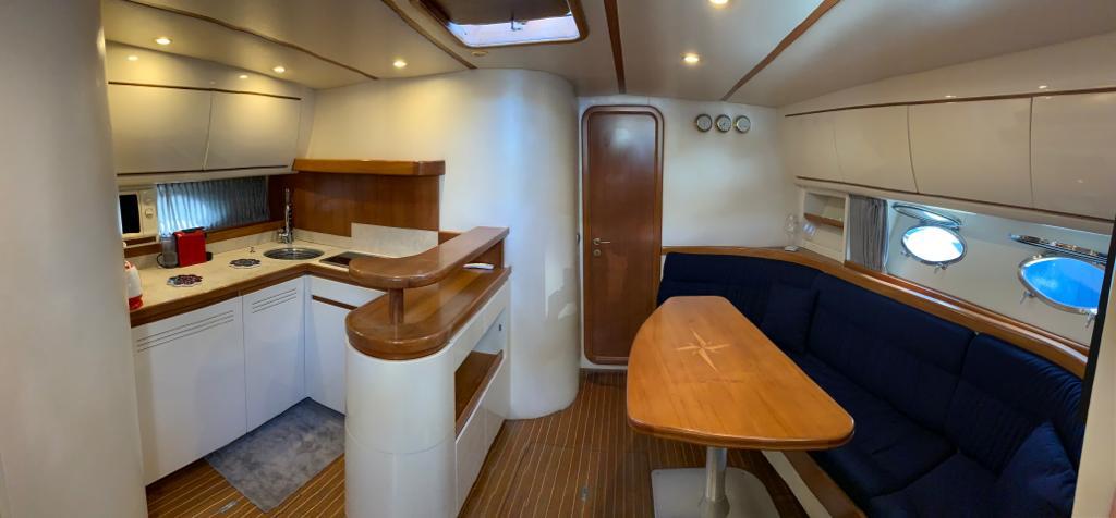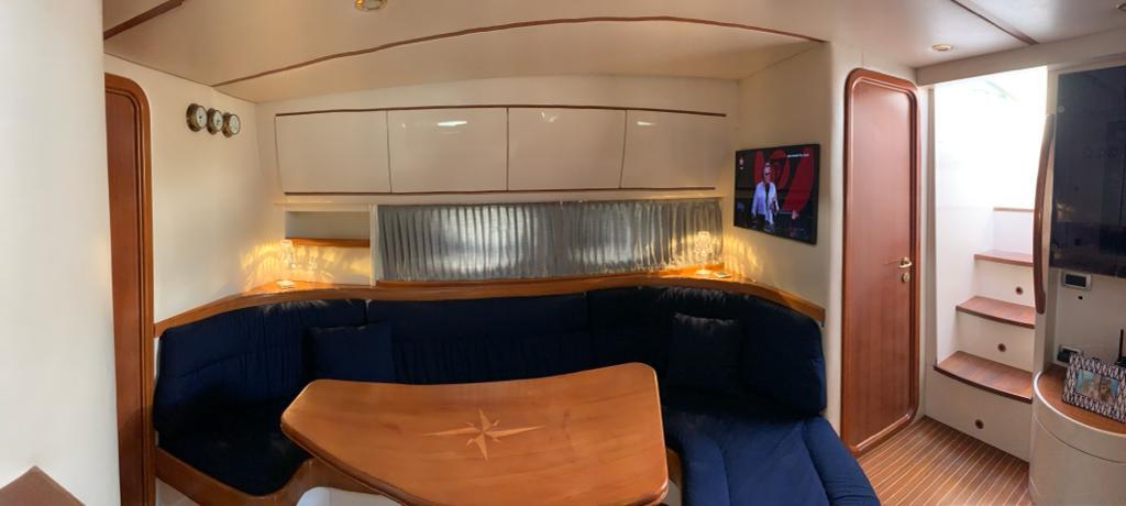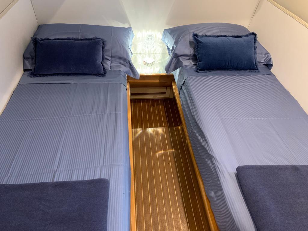 Gli interni offrono una disposizione funzionale e confortevole: la cabina armatoriale a prua dispone di letto matrimoniale e bagno privato con box doccia. Sul lato sinistro si trova una cabina ospiti con due letti in piano e bagno dedicato con doccia, mentre a dritta è presente una terza cabina con letto matrimoniale alla francese e bagno privato.