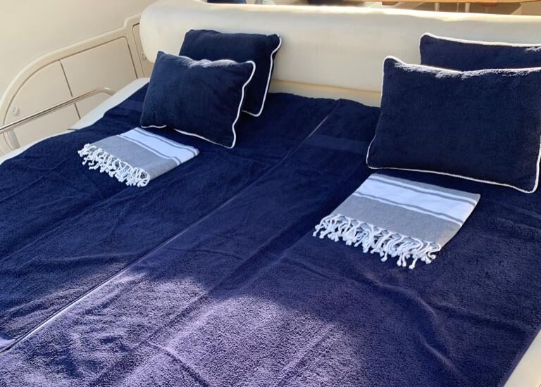 Nel 2022 sono stati completamente rinnovati la tappezzeria interna, le tende, i materassi e tutta la biancheria di bordo, inclusi guanciali, plaid e coordinati per il bagno. Nel 2023 è stata eseguita la pulizia dei serbatoi del gasolio con contestuale sostituzione di sensori e indicatori di livello, oltre al rinnovo delle prese a mare e del boiler. Nel 2024 sono stati sostituiti i crystal, levigato e trattato il teak esterno, inclusa la plancetta di poppa, e rinnovato il certificato di sicurezza.
