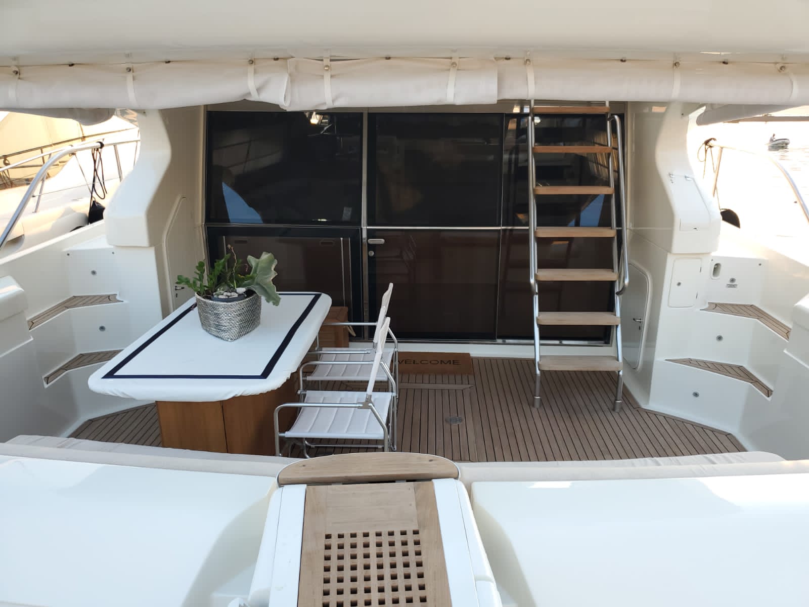 All’esterno, gli ampi volumi del flybridge invitano alla convivialità: zona pranzo, cucina con piastra, lavello, frigorifero e un robusto bimini in acciaio inox rendono questo spazio ideale per vivere il mare in ogni momento della giornata. A prua, un’ampia area prendisole; a poppa, un accogliente pozzetto arredato con tavolo in teak, in perfetta continuità con il salone e la comoda spiaggetta di poppa.