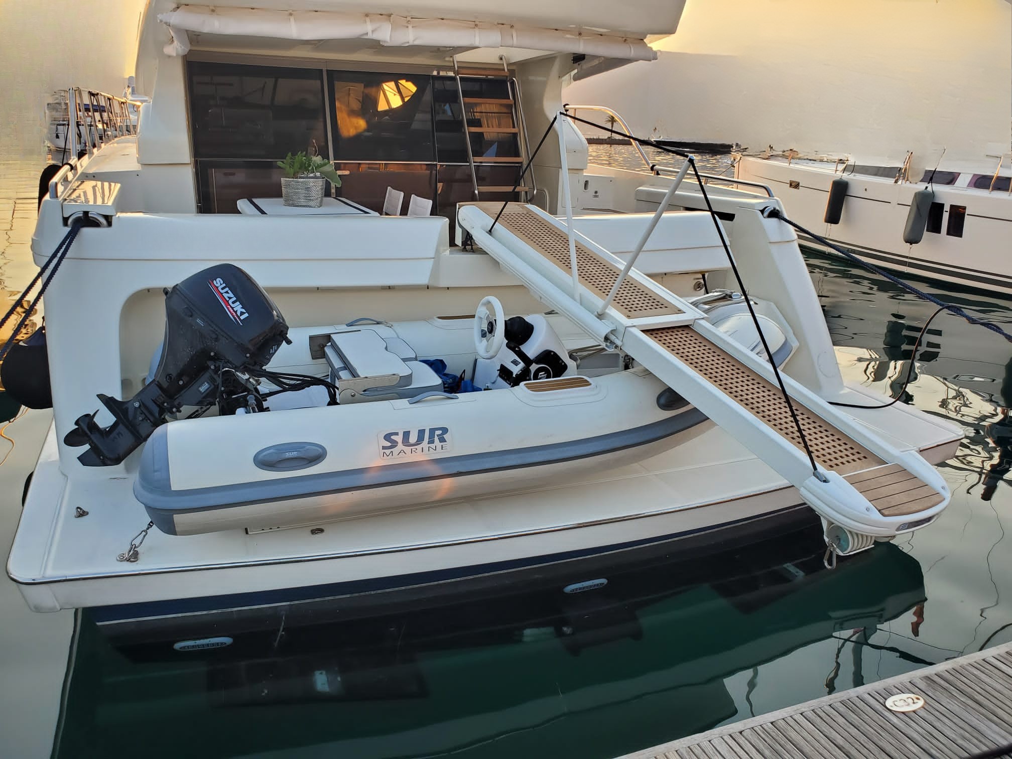La passerella elettroidraulica con sollevamento tender integrato garantisce praticità durante le operazioni di alaggio e varo.