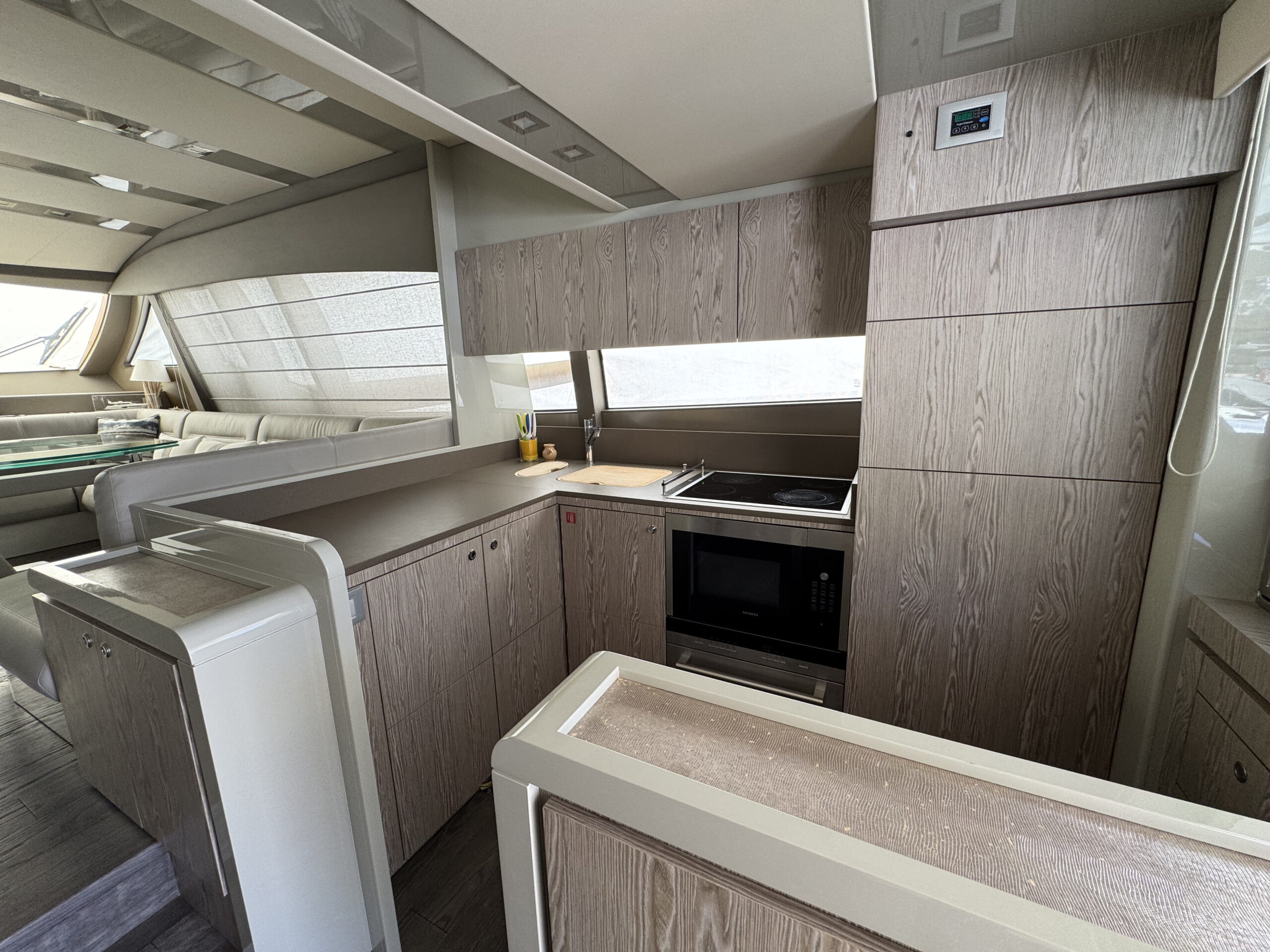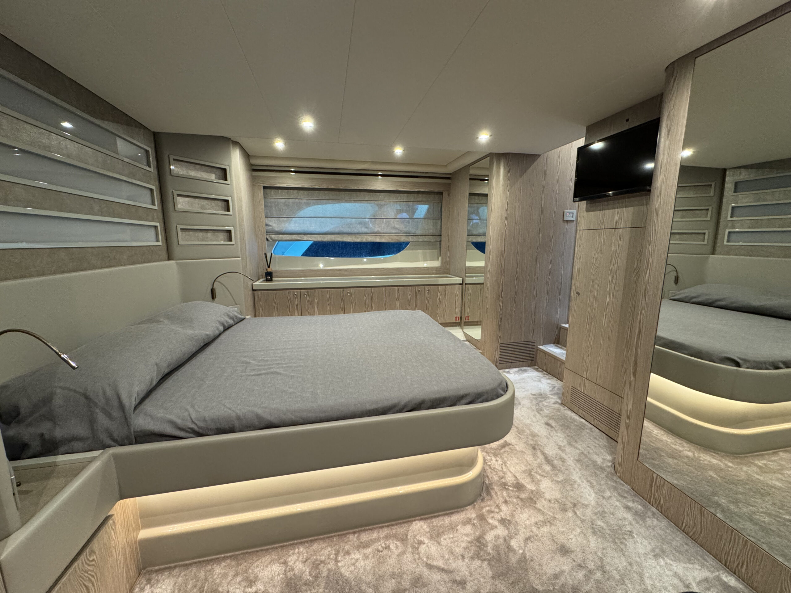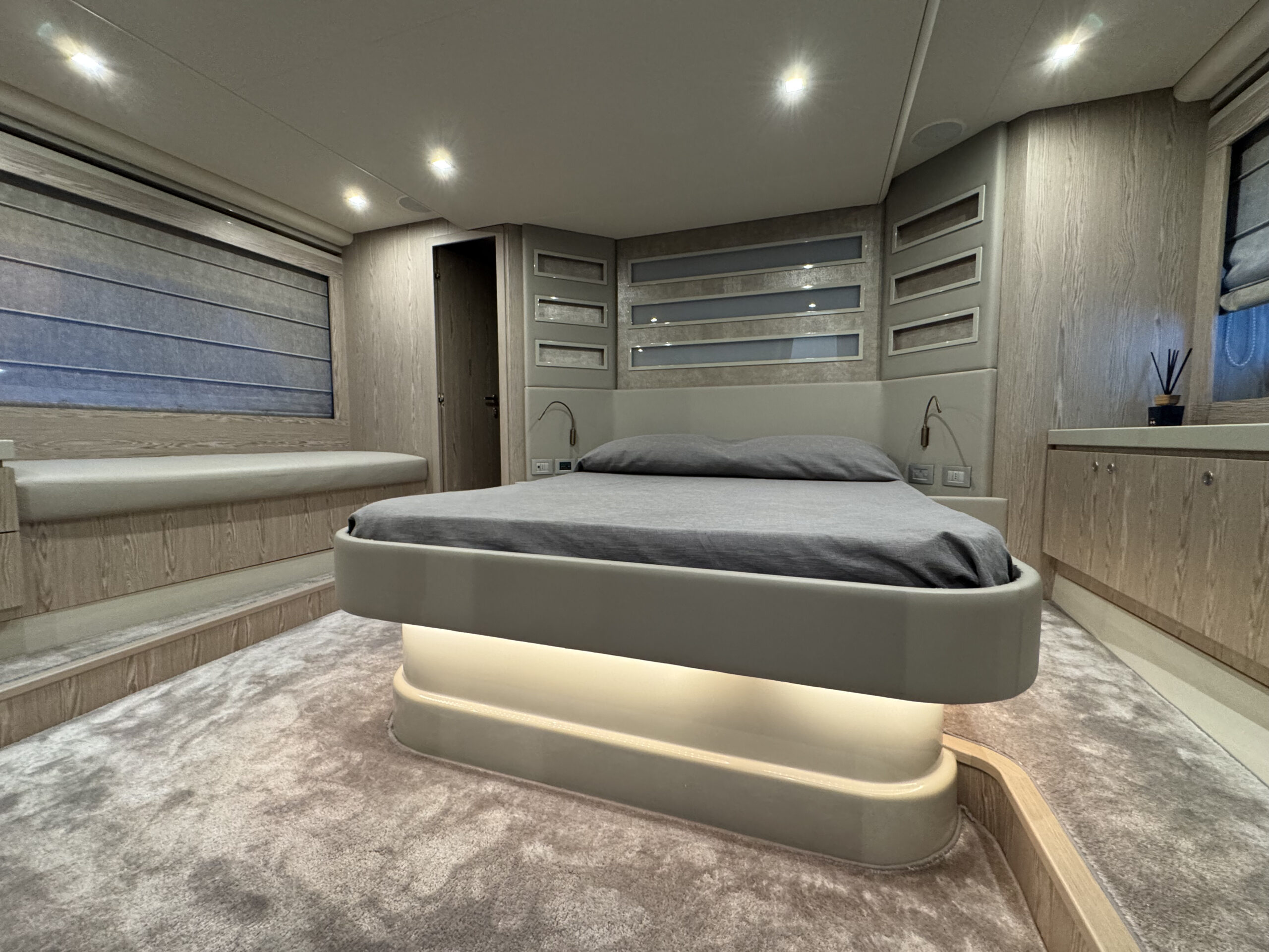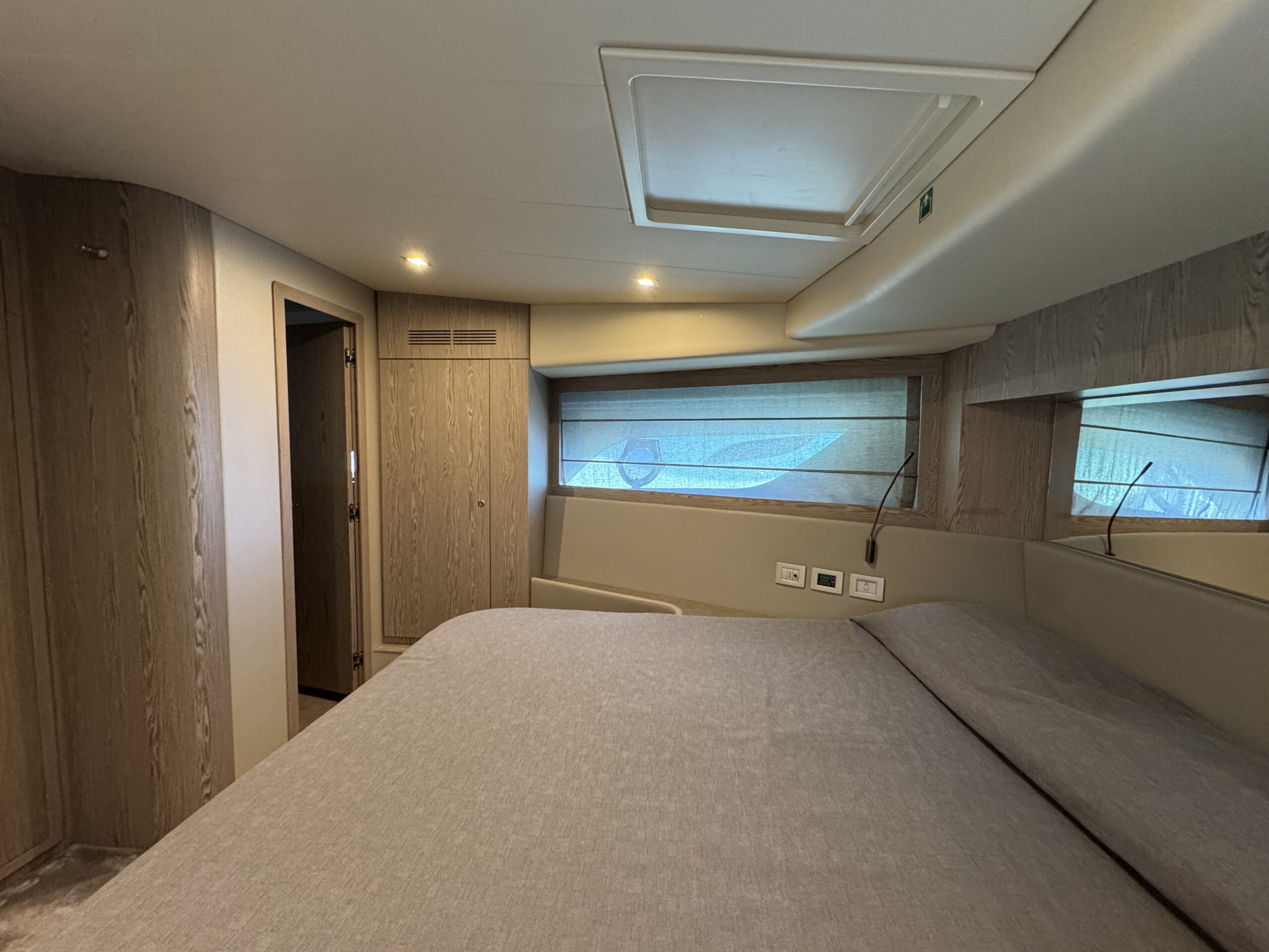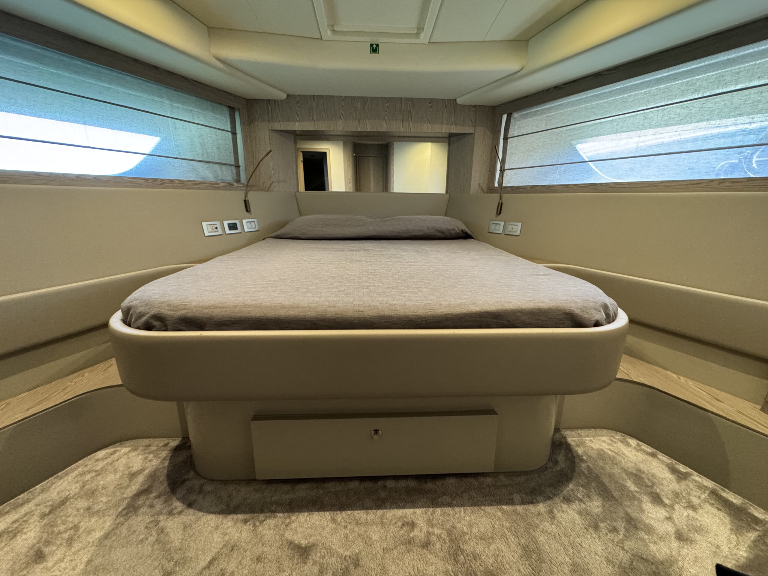 La configurazione del main deck è completamente open space, con una zona lounge ampia e luminosa e una cucina in posizione strategica, capace di servire agevolmente sia la dinette interna sia l’area pranzo esterna. Il parabrezza avanzato contribuisce a massimizzare lo spazio vivibile, aumentando la percezione di apertura e continuità tra gli ambienti.