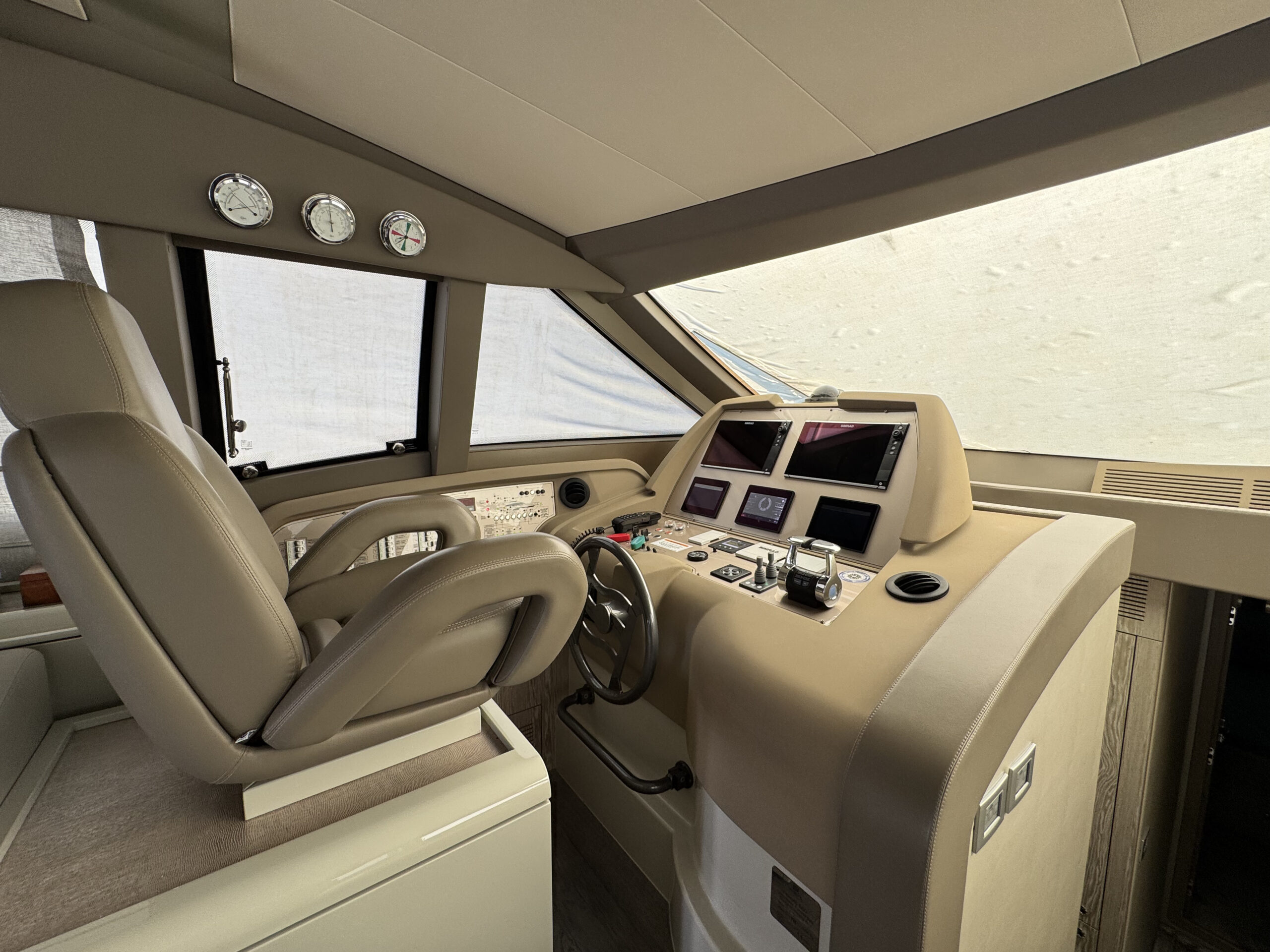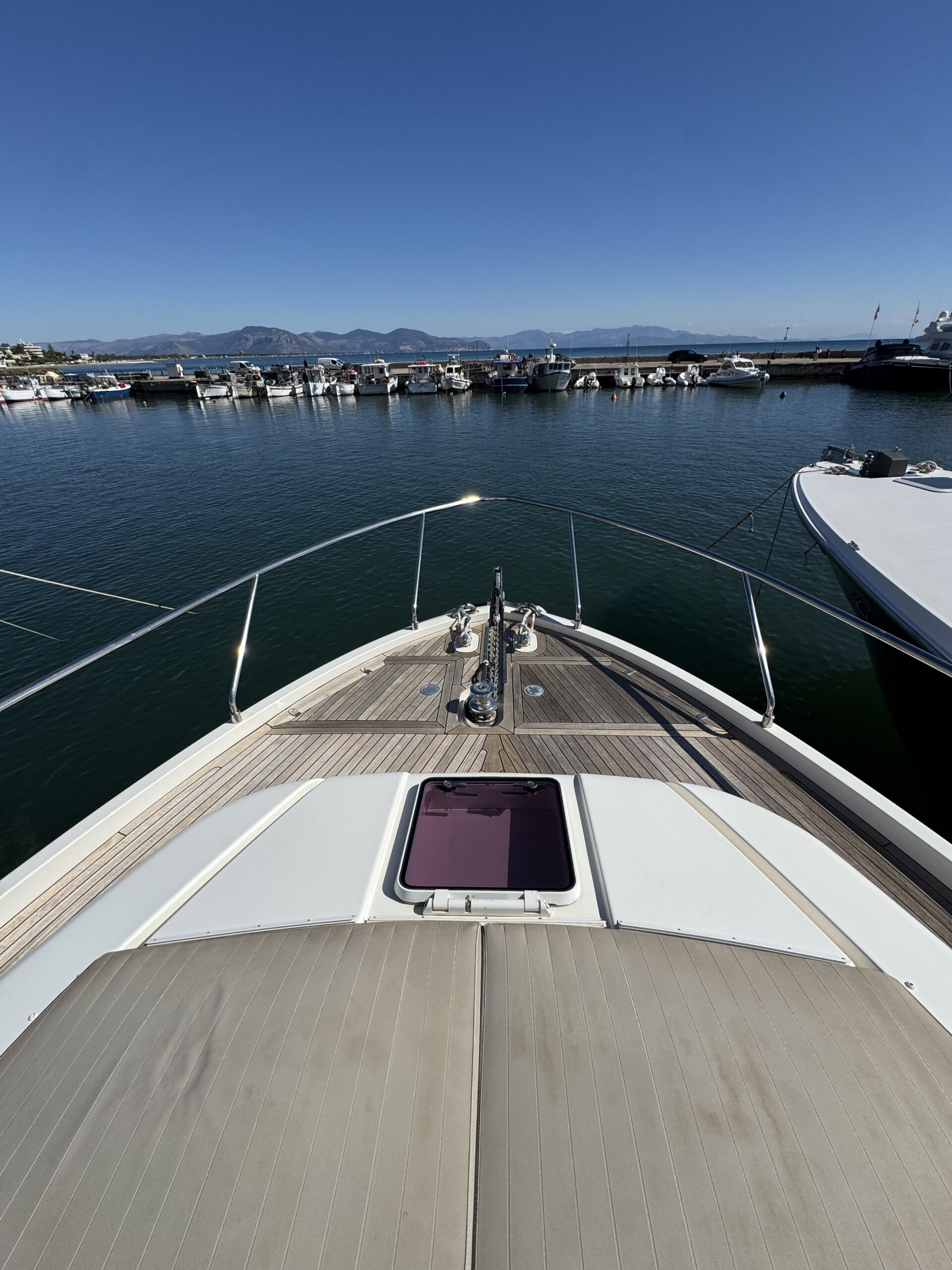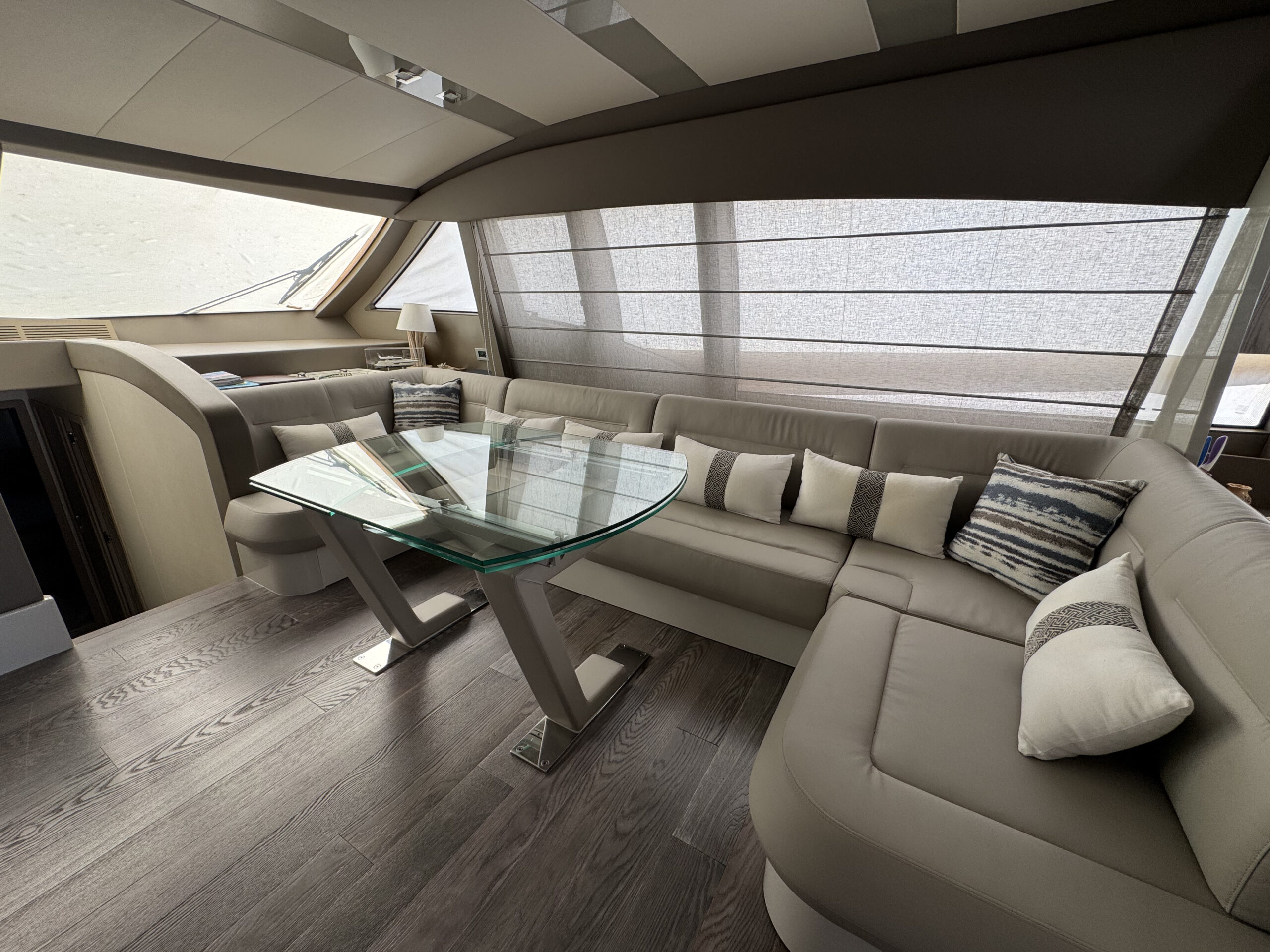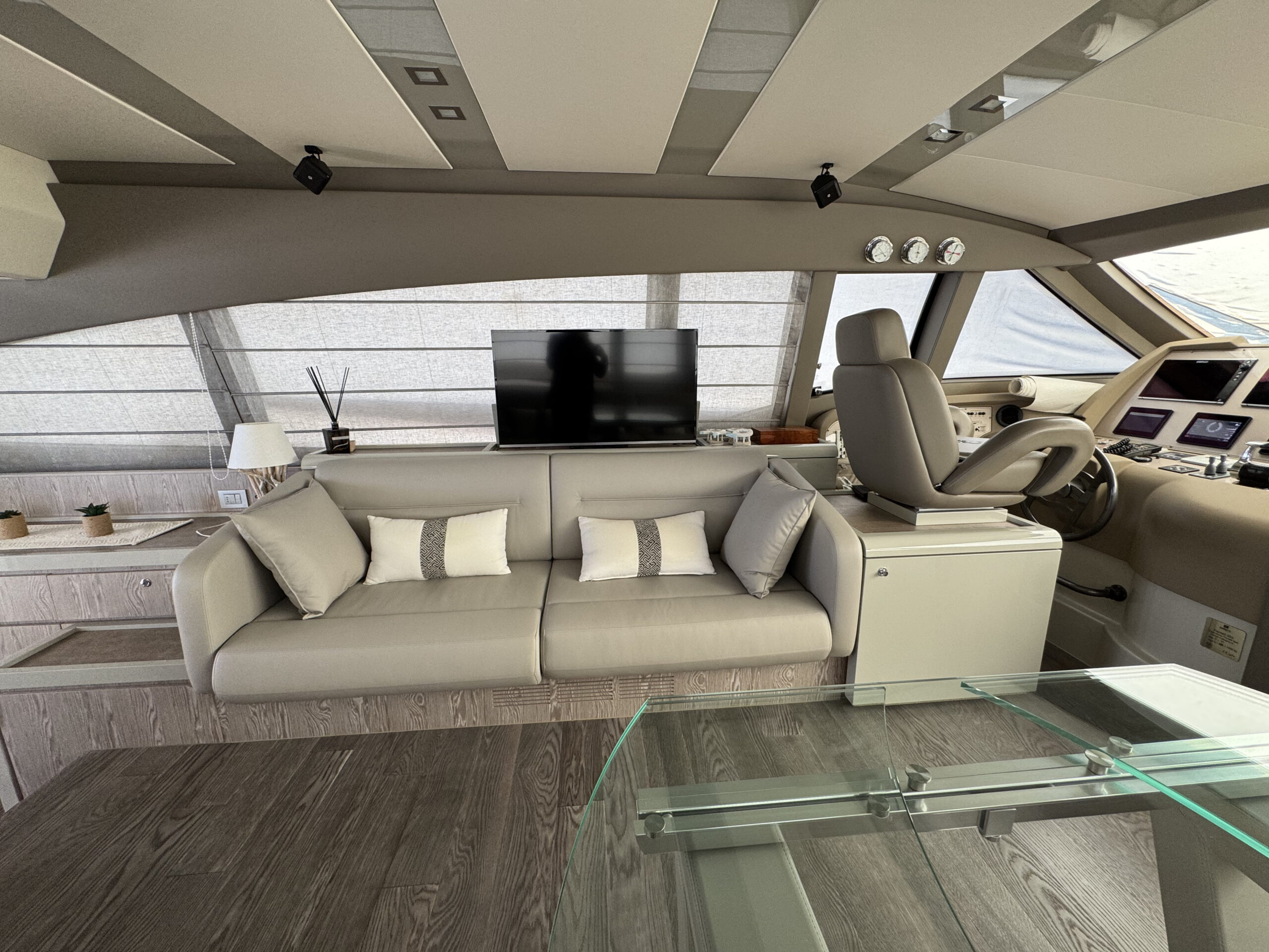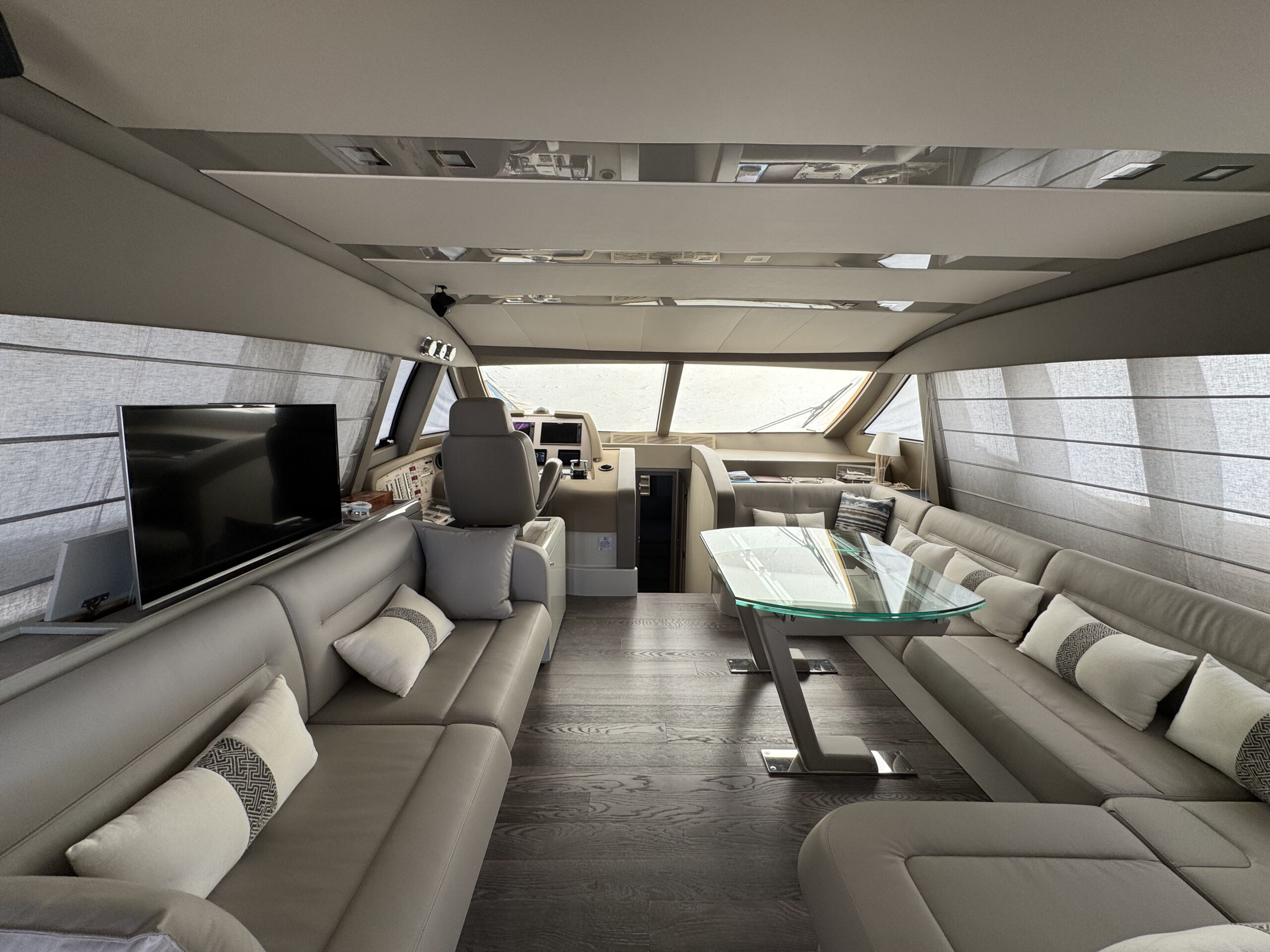La configurazione del main deck è completamente open space, con una zona lounge ampia e luminosa e una cucina in posizione strategica, capace di servire agevolmente sia la dinette interna sia l’area pranzo esterna. Il parabrezza avanzato contribuisce a massimizzare lo spazio vivibile, aumentando la percezione di apertura e continuità tra gli ambienti.