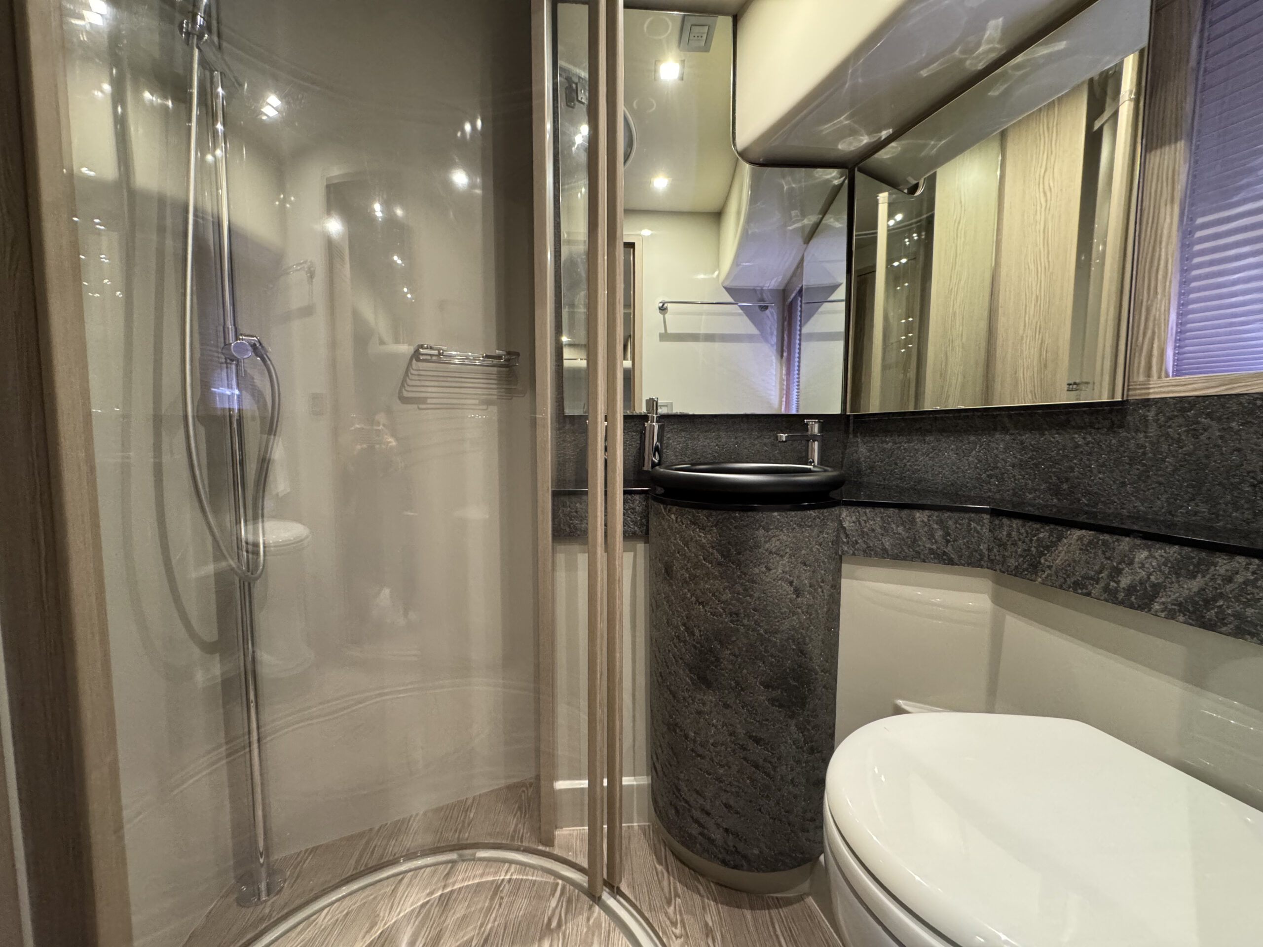 Sottocoperta, la zona ospiti accoglie tre cabine ospiti: una cabina armatoriale full-beam a centro barca, con bagno privato e ampie finestrature panoramiche, una cabina VIP a prua, anch’essa con bagno en-suite e una cabina doppia con letti in piano, servita da un terzo bagno utilizzabile anche come day head..