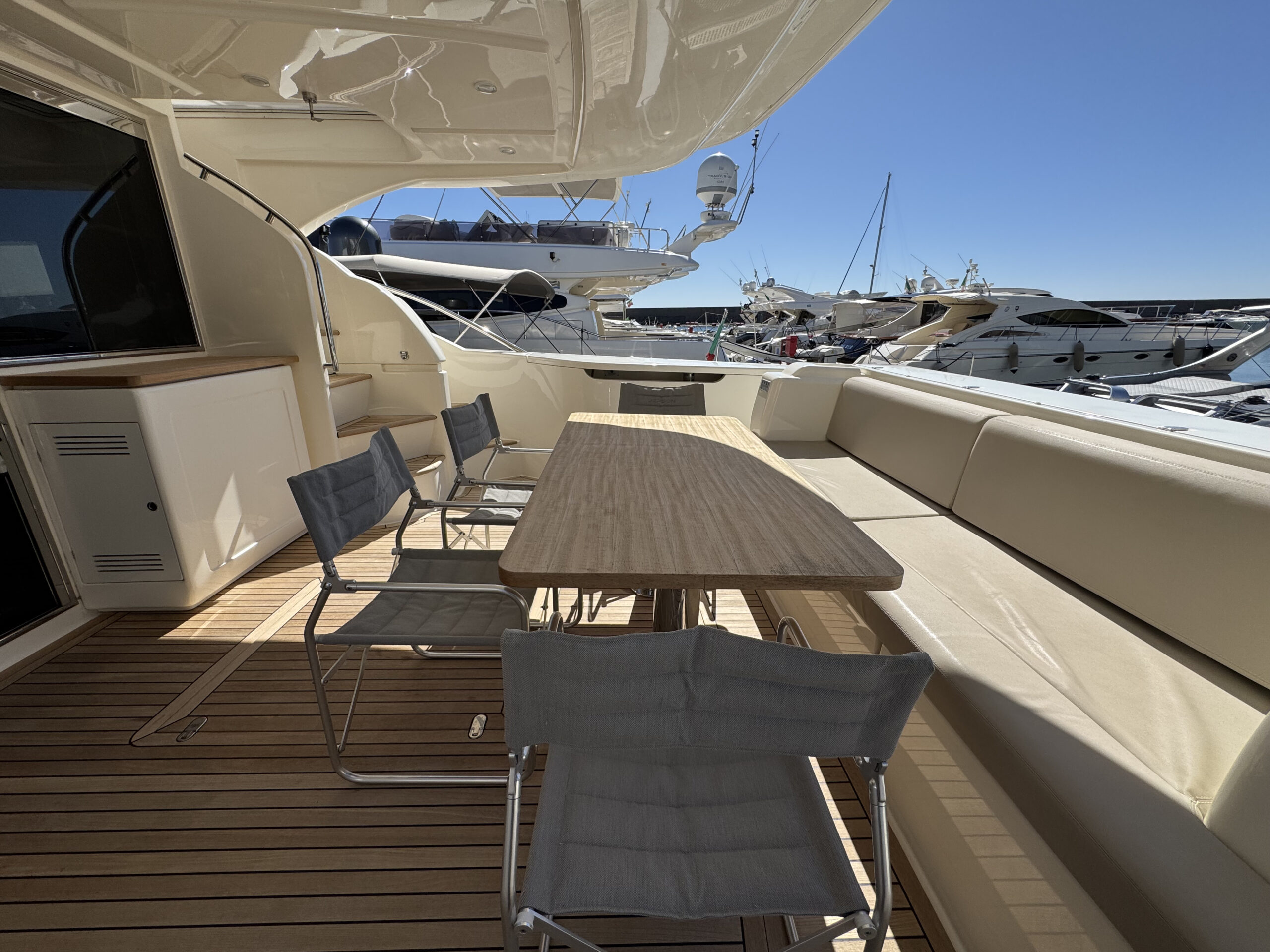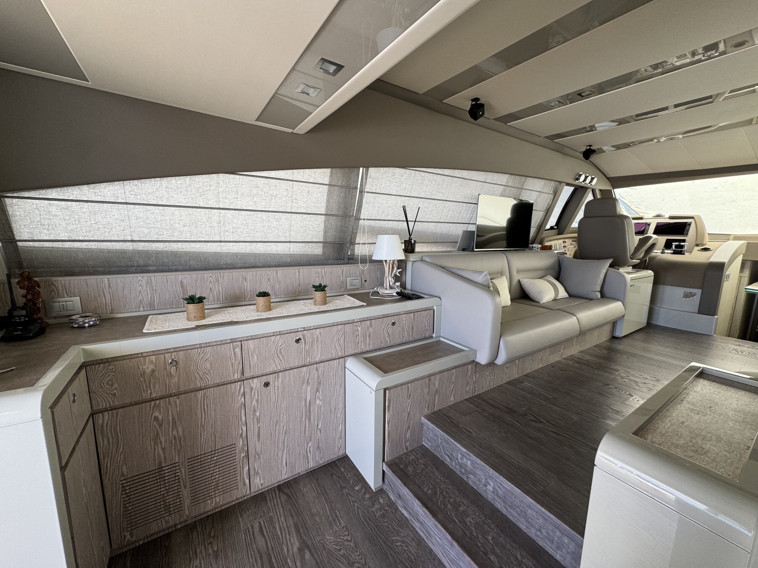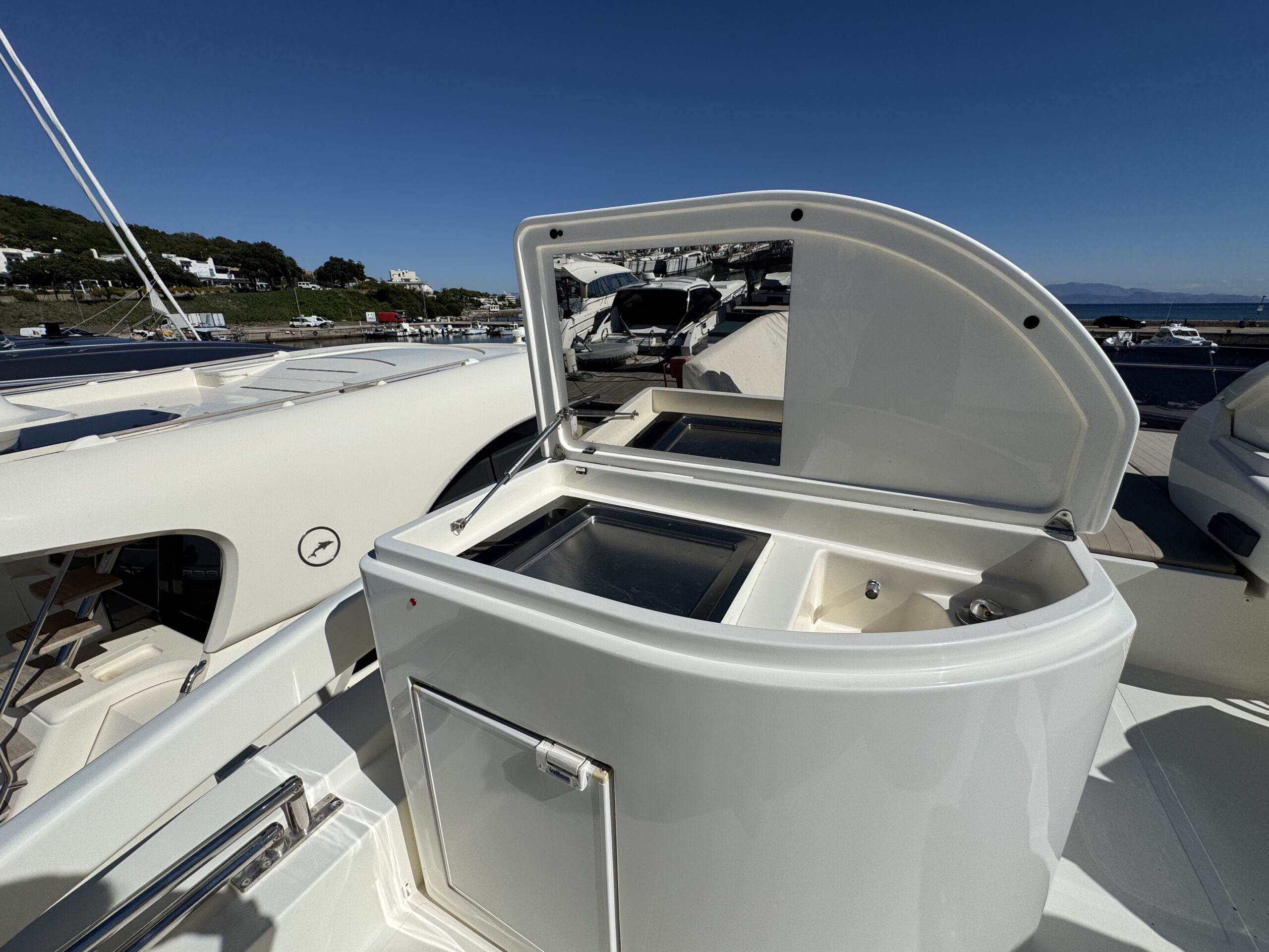 Il flybridge, spazioso e ben organizzato, ospita una seconda postazione di guida, un’area prendisole generosa e un mobile attrezzato con piastra e lavello, perfetto per momenti di convivialità all’aperto.