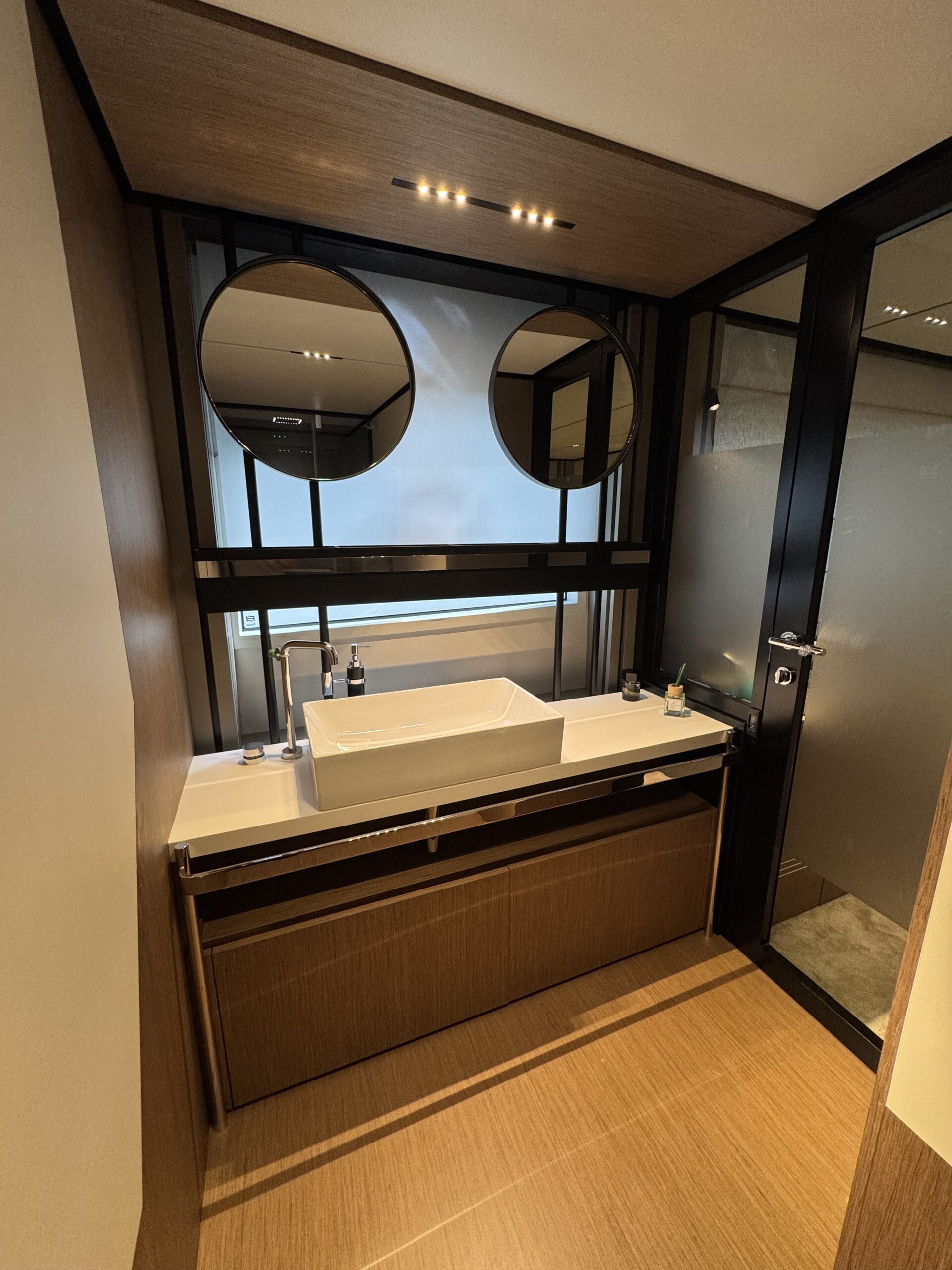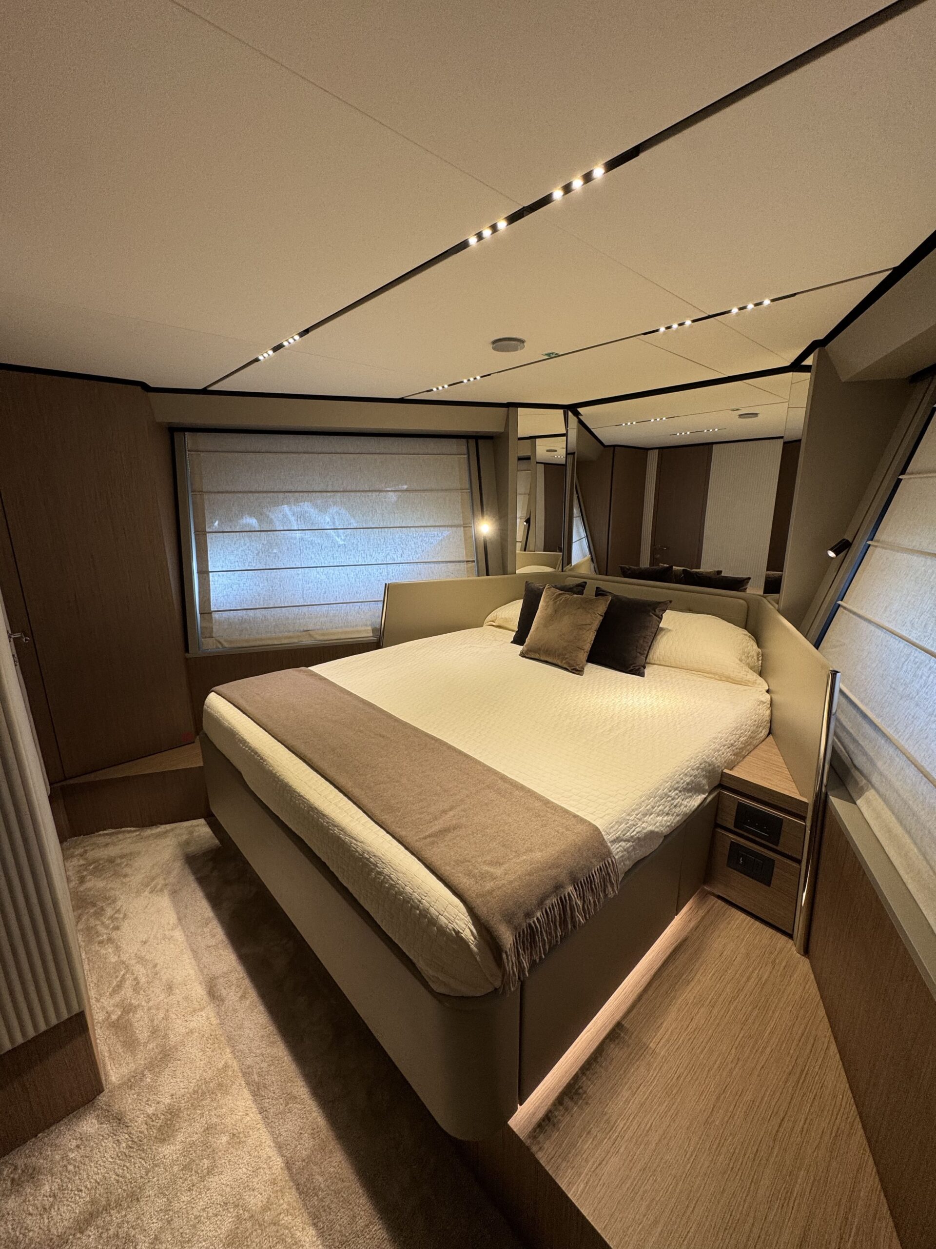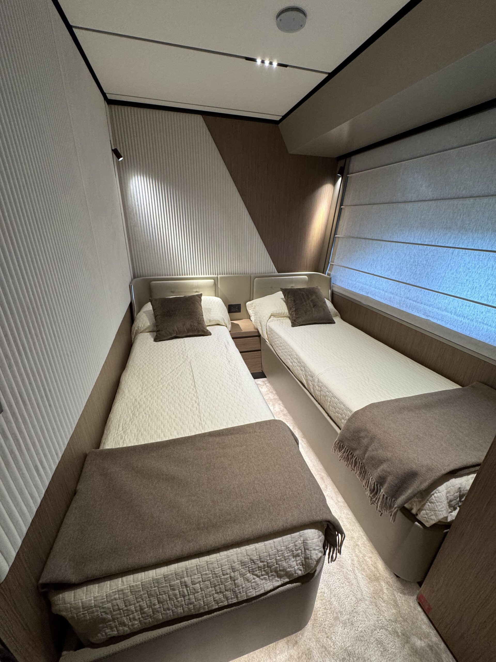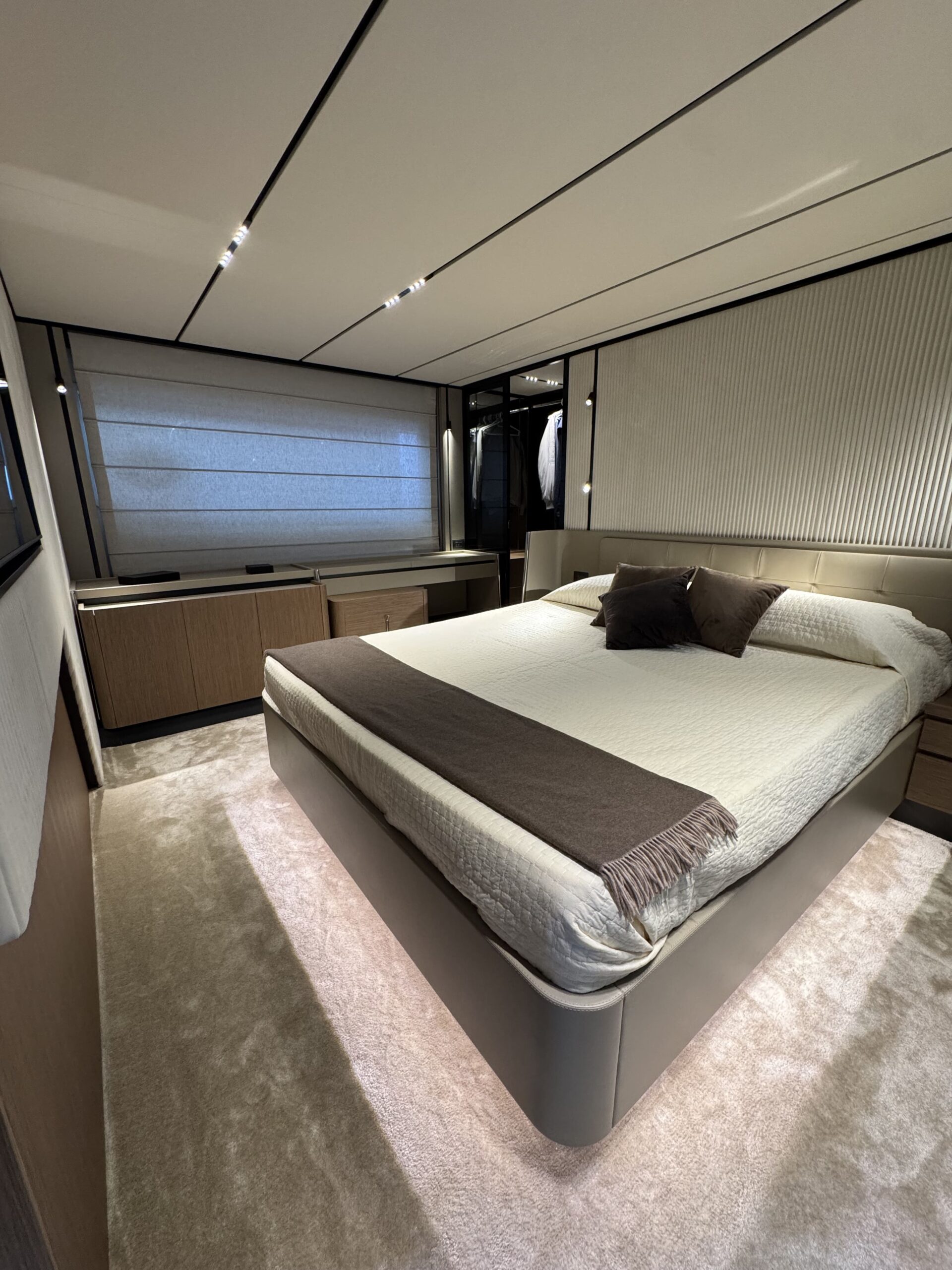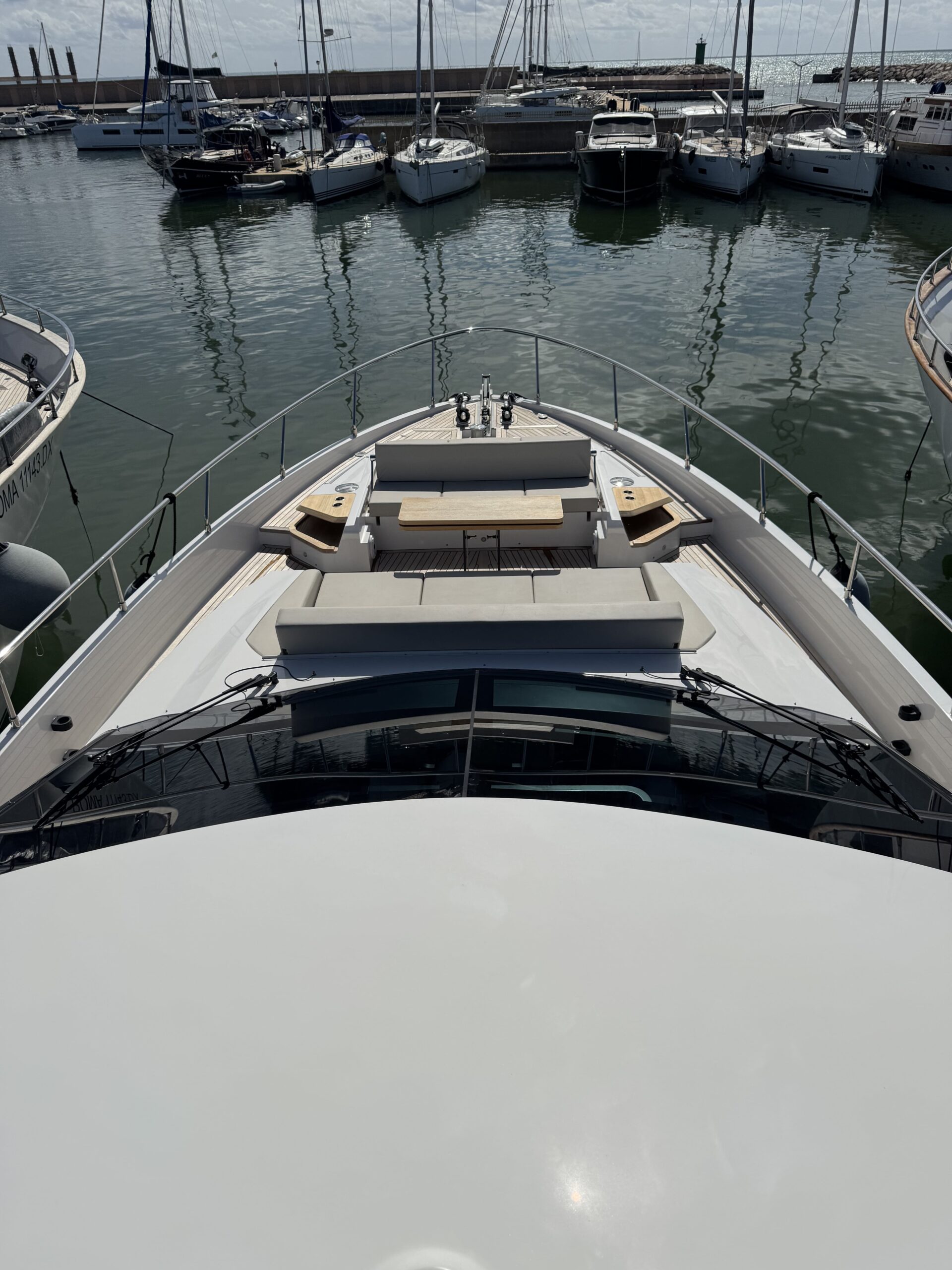 A prua, l'ampia dinette con tavolo in teak si affianca ad un generoso prendisole, perfetto per godersi il sole e il mare in totale relax e armonia con l'ambiente circostante.Dal punto di vista tecnico, il Ferretti Yachts 720 è equipaggiato con motori MAN V12 da 1.400 cavalli che assicurano una velocità di crociera di 24 nodi e una velocità massima di 28 nodi.