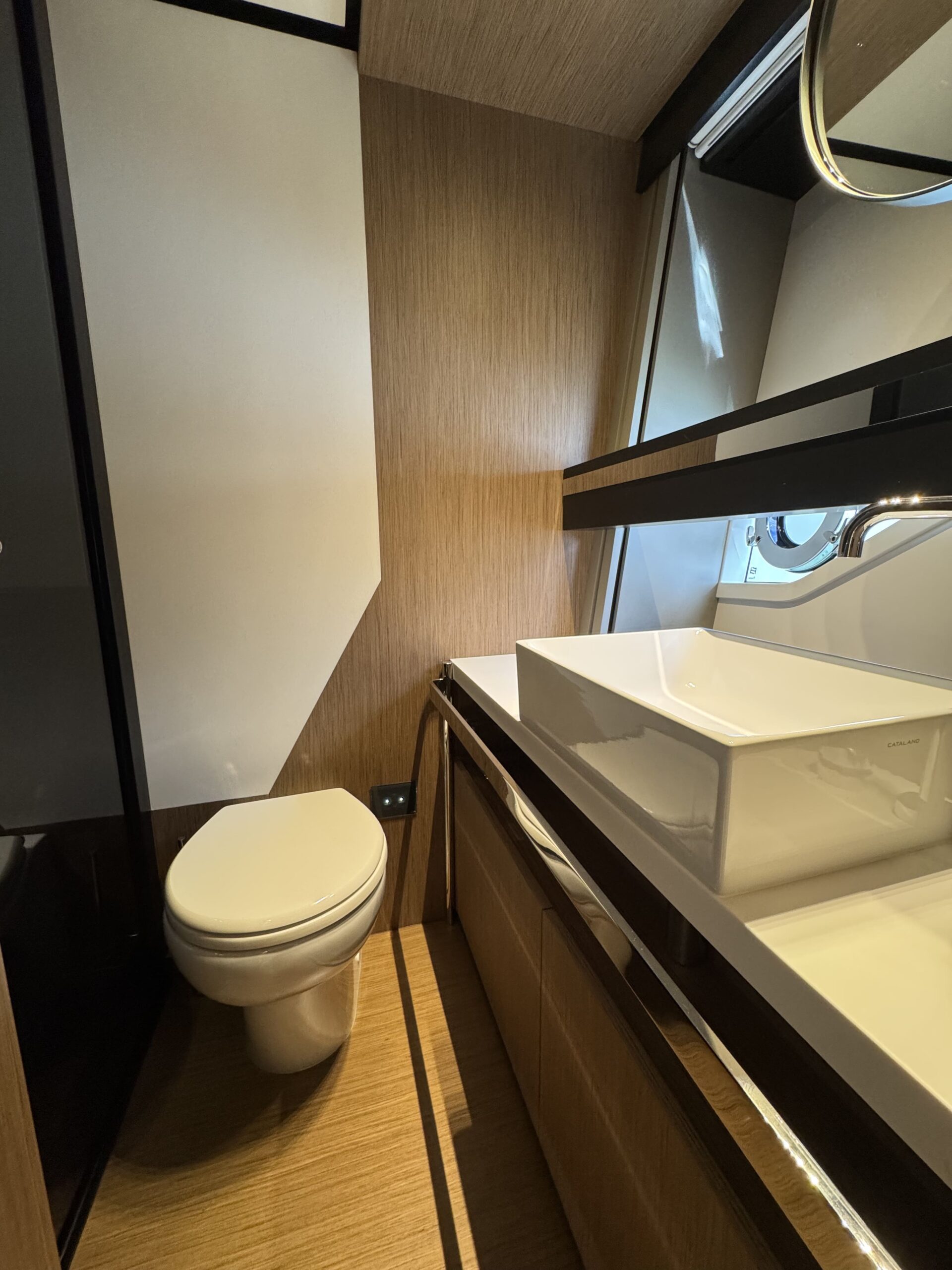 Un impianto Hi-Fi potenziato con sistema party music diffuso tra salone, pozzetto e flybridge garantisce un'esperienza sonora immersa e personalizzabile, mentre la TV da 50" a scomparsa e un'infrastruttura internet avanzata permettono di godere di un intrattenimento completo e di rimanere sempre connessi, anche in mare aperto.
