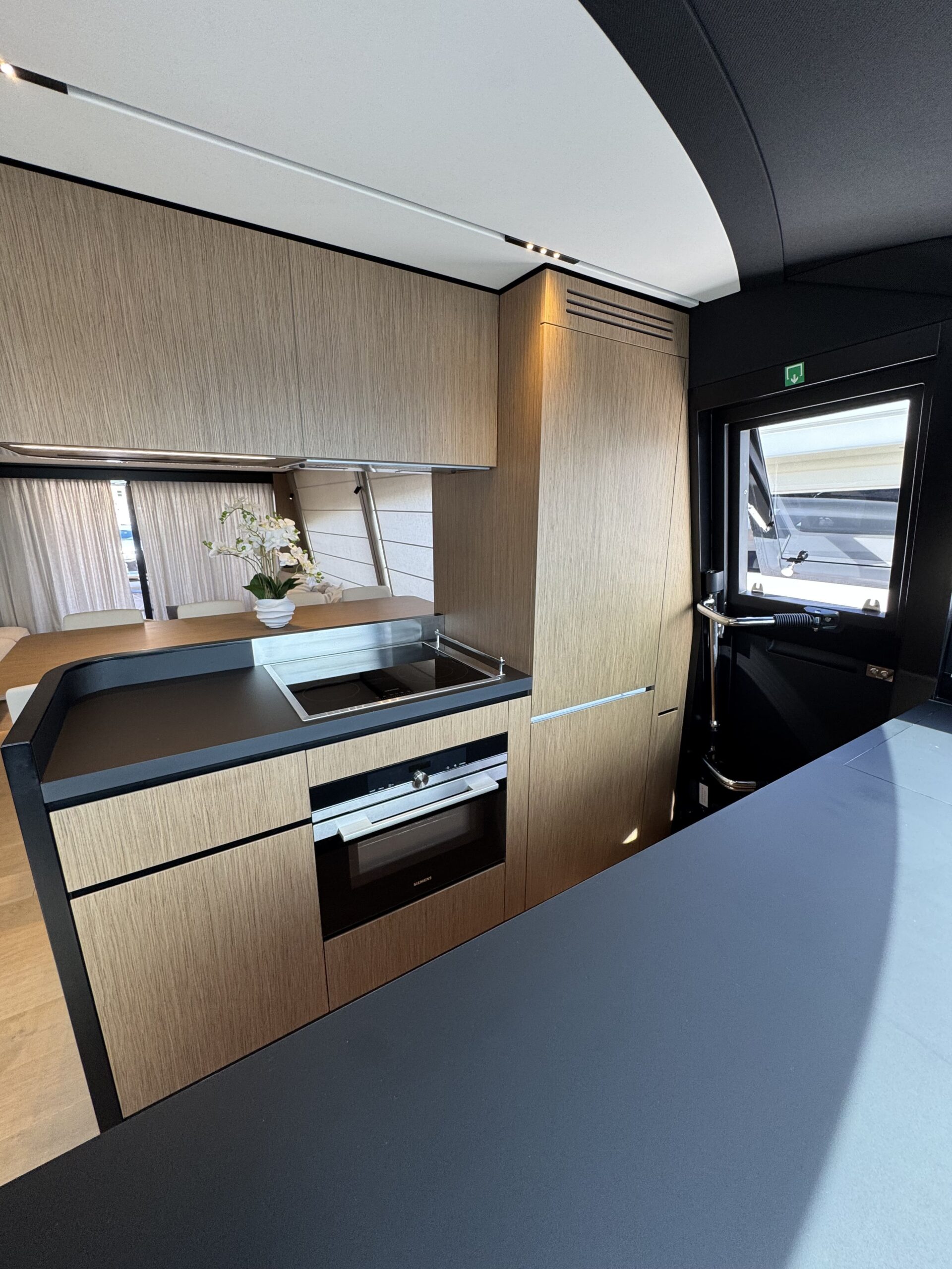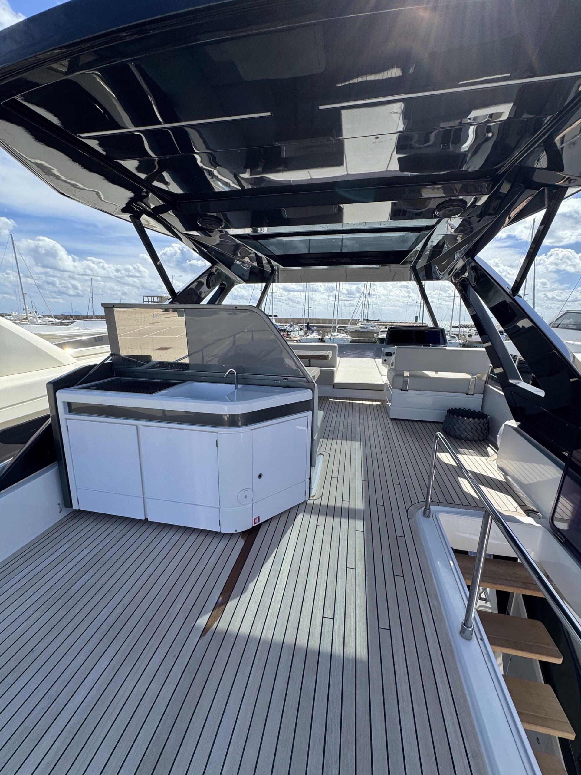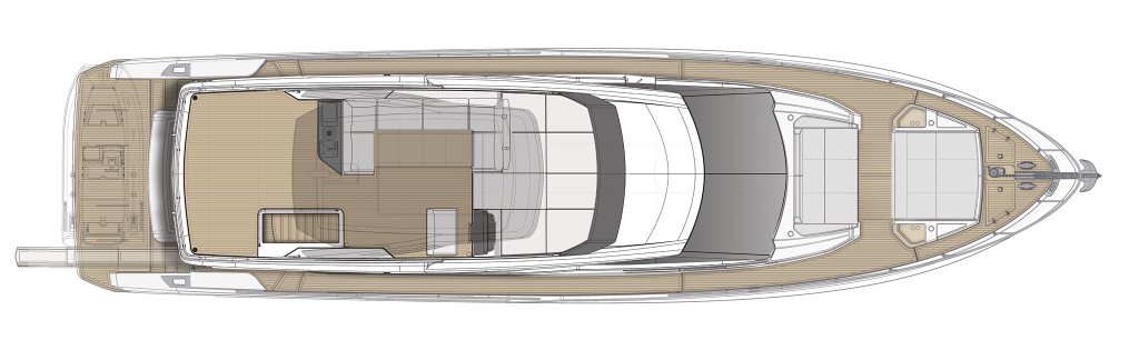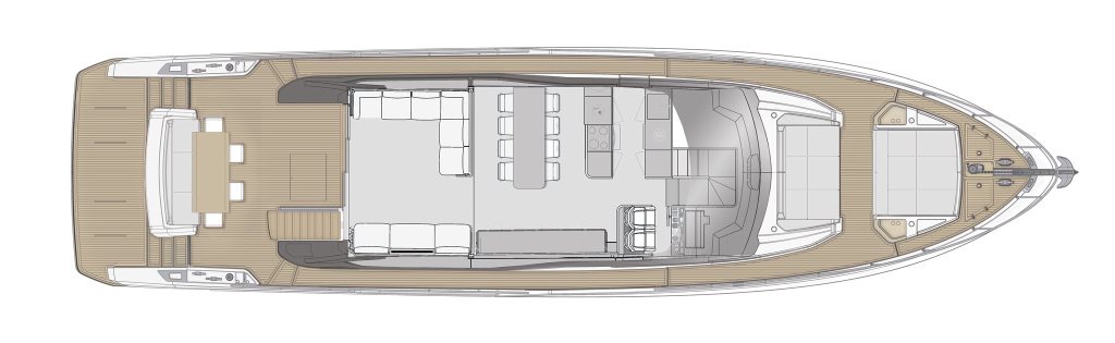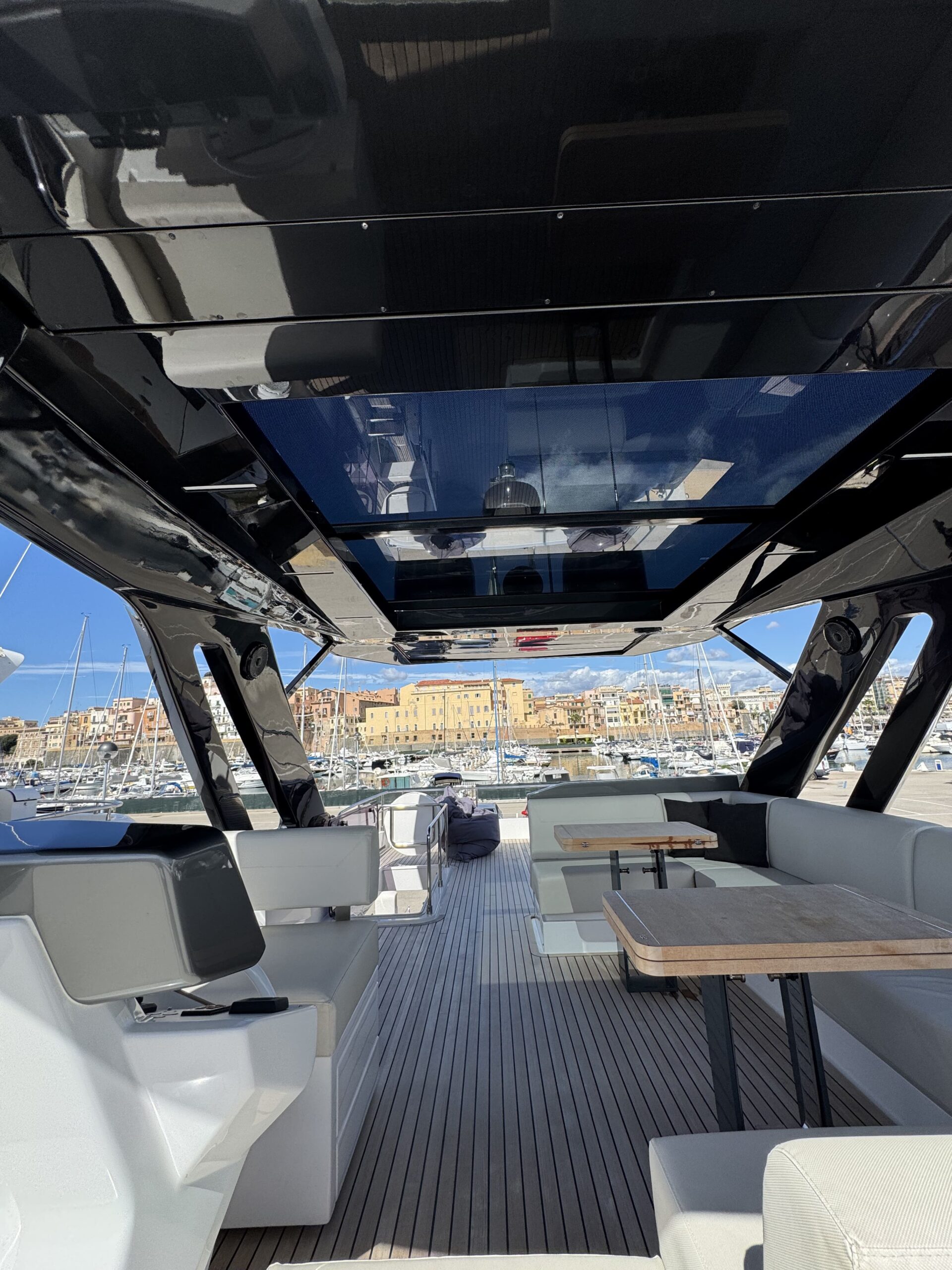 Il flybridge offre un'area relax protetta da un elegante hard top in vetro, arricchita da un tavolo in teak, grill, frigorifero e un ampio prendisole, per vivere l'aria aperto con il massimo comfort. Il pozzetto rappresenta un'oasi di tranquillità e convivialità, con la piattaforma tender lift che rende semplici e agili le manovre con il tender.