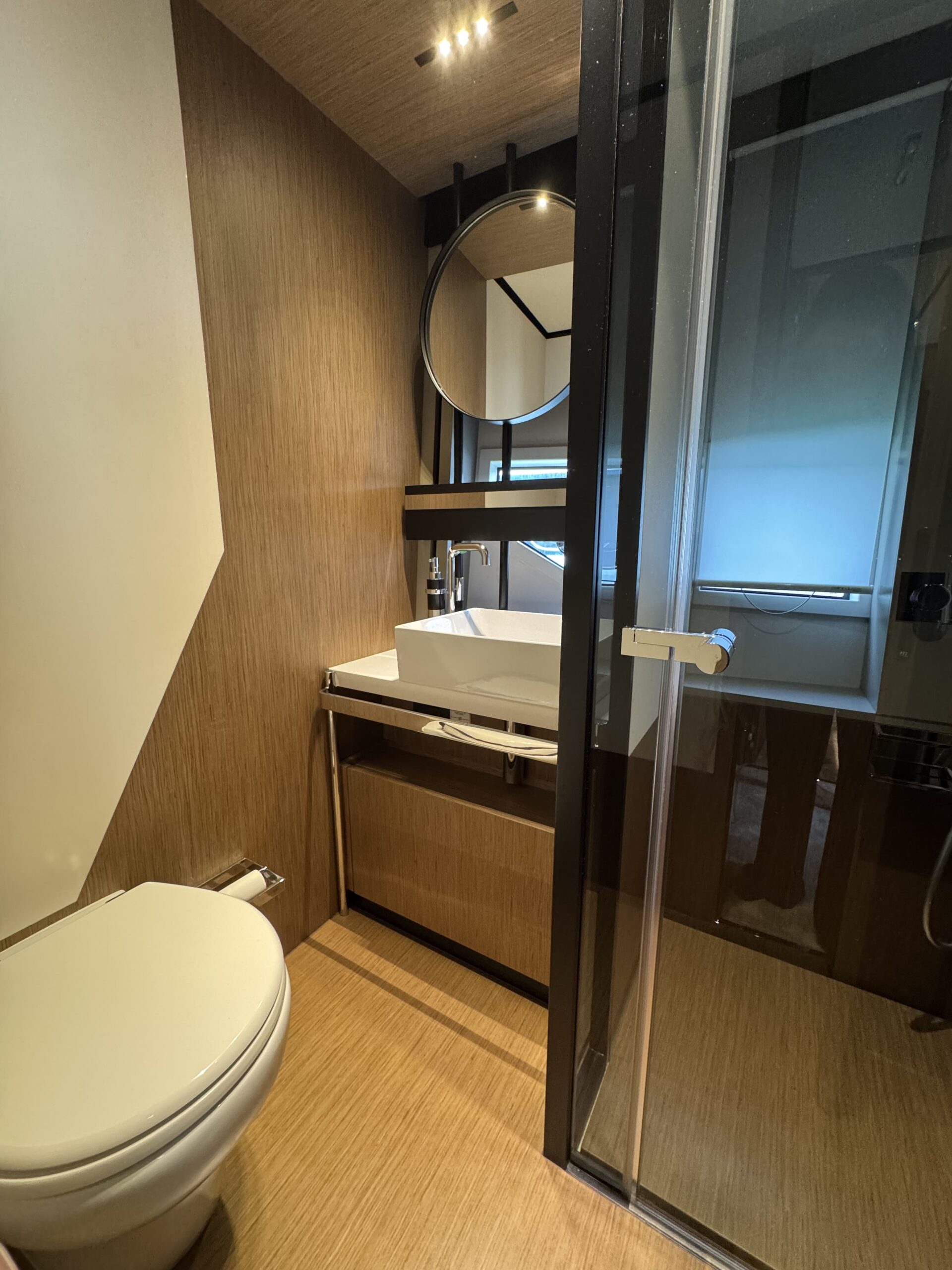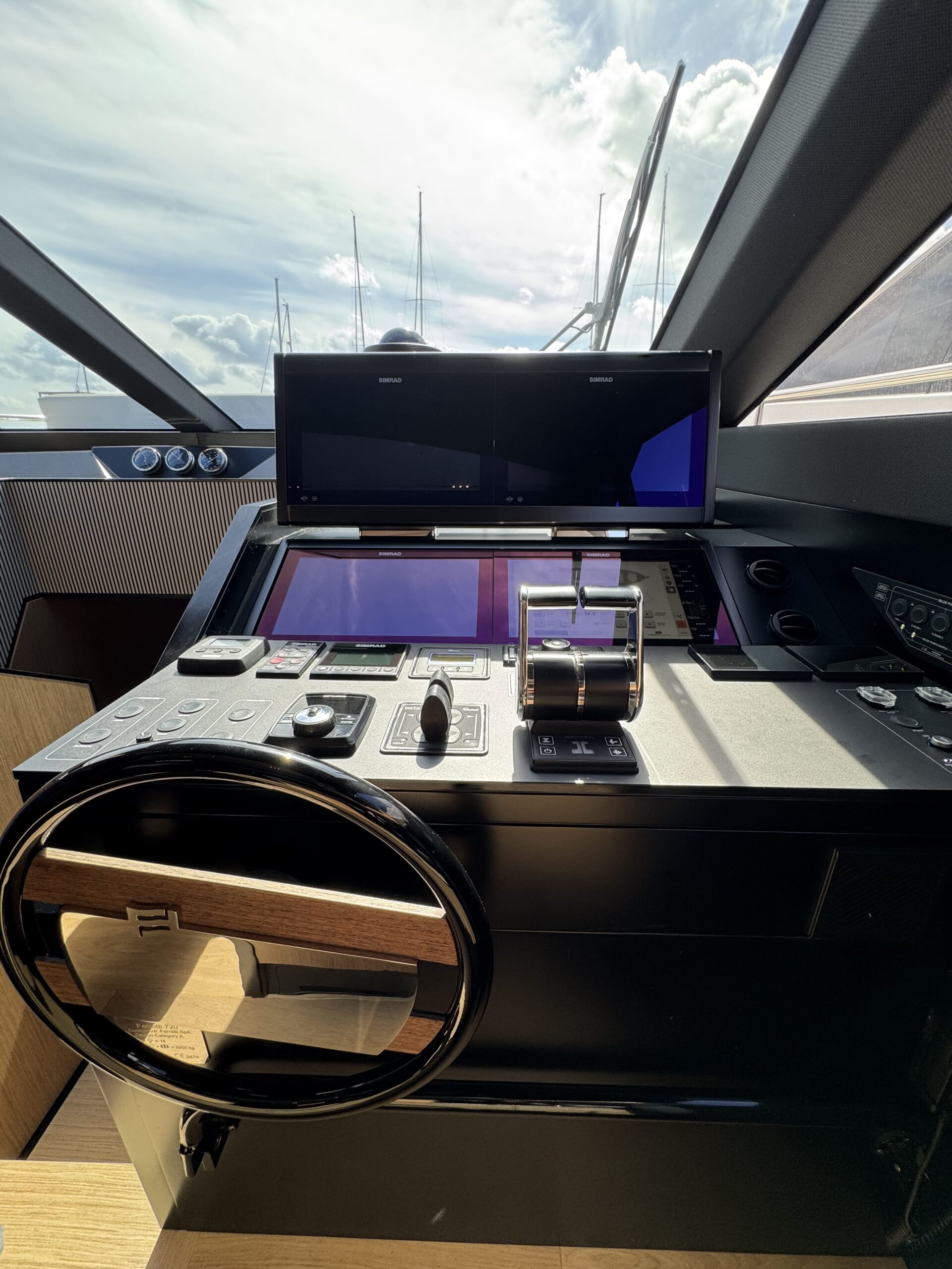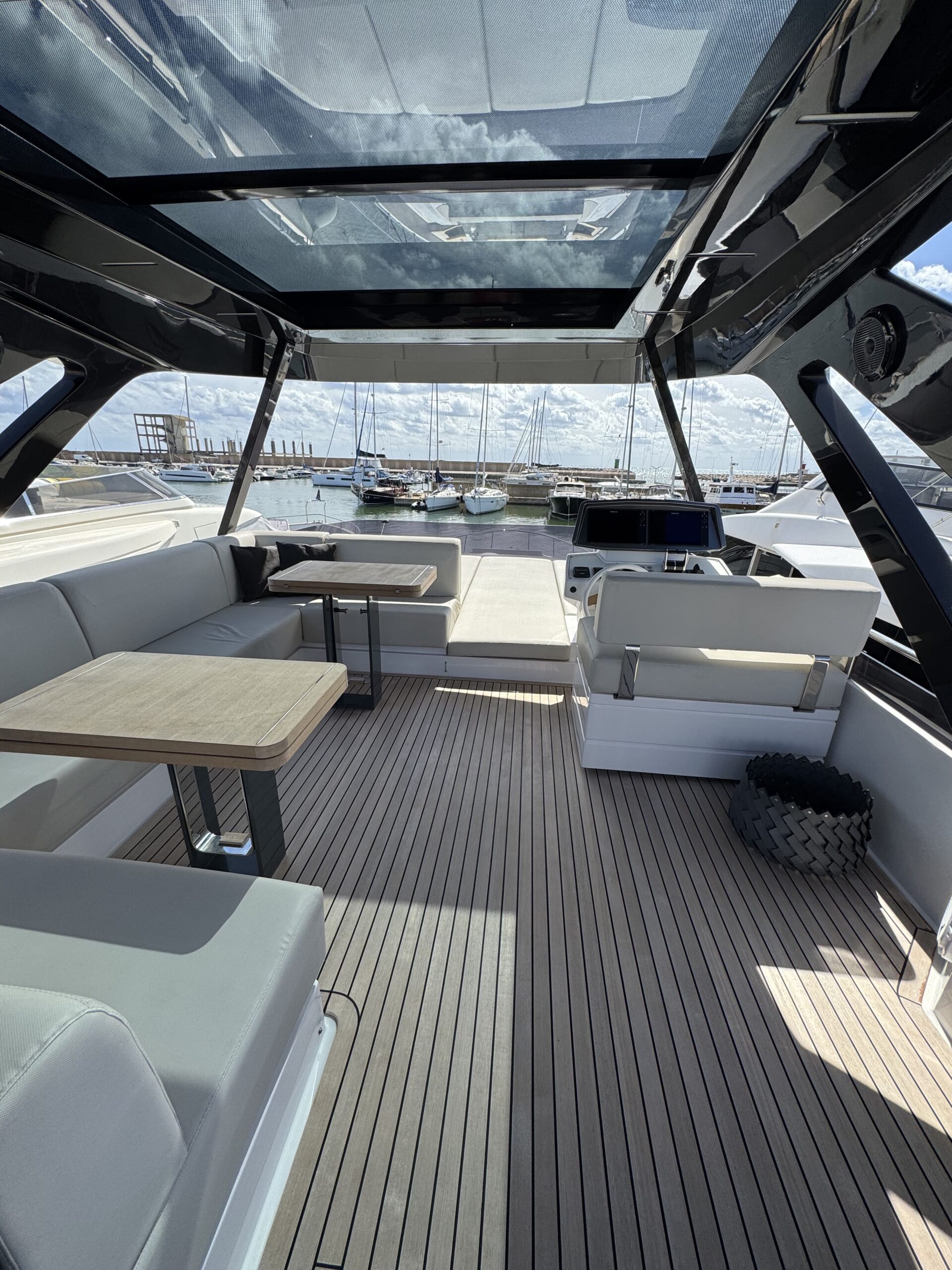 Il flybridge offre un'area relax protetta da un elegante hard top in vetro, arricchita da un tavolo in teak, grill, frigorifero e un ampio prendisole, per vivere l'aria aperto con il massimo comfort. Il pozzetto rappresenta un'oasi di tranquillità e convivialità, con la piattaforma tender lift che rende semplici e agili le manovre con il tender.