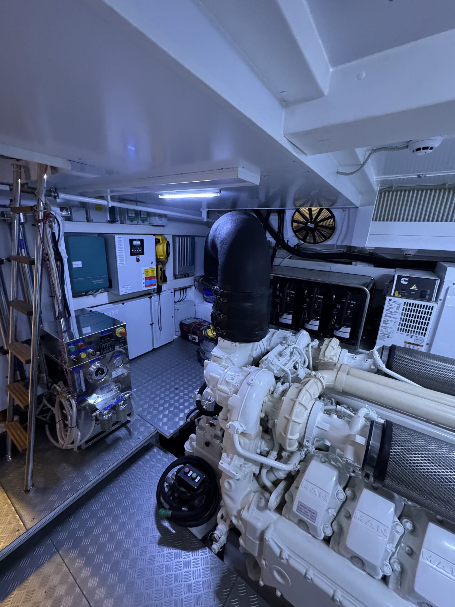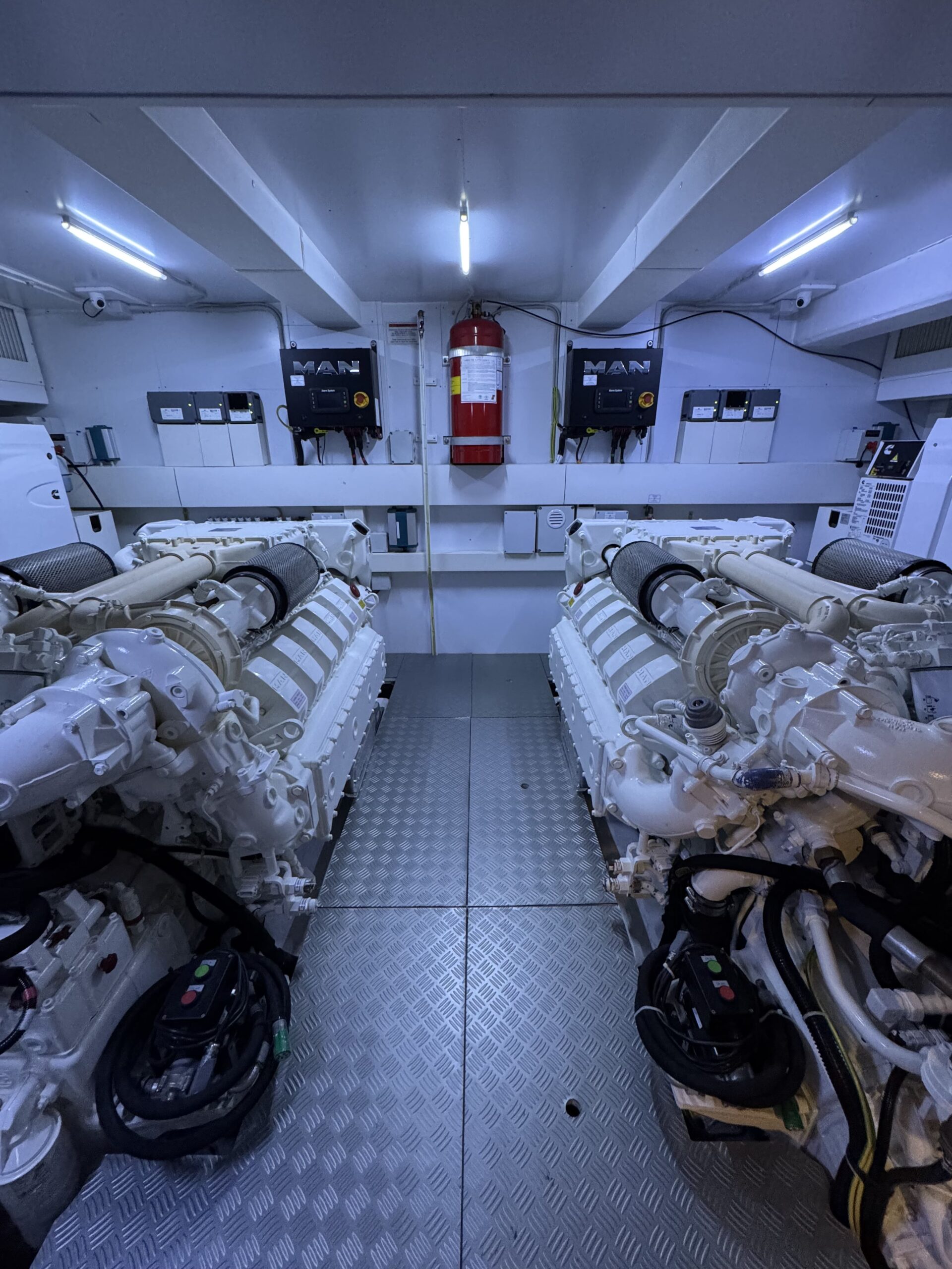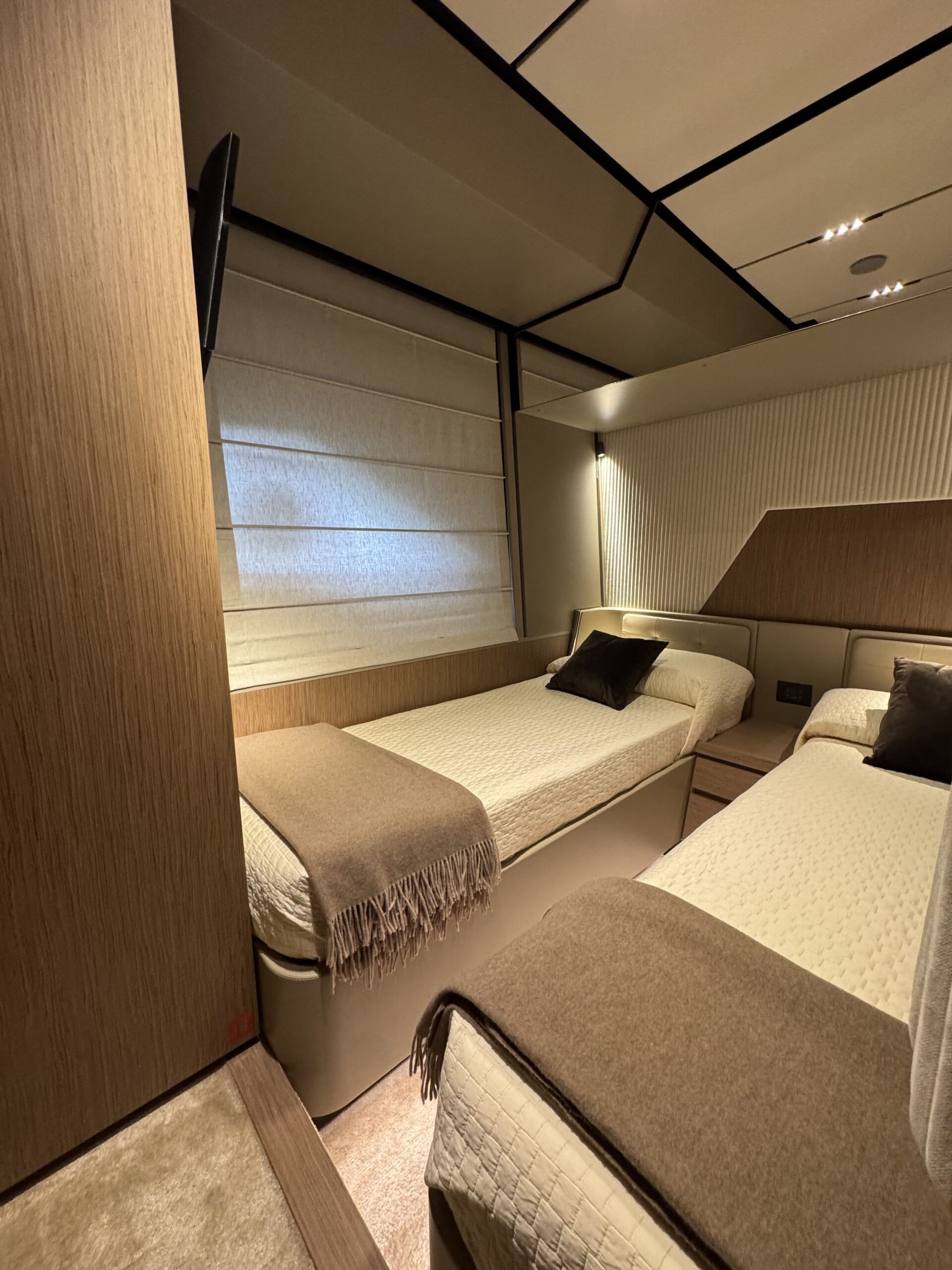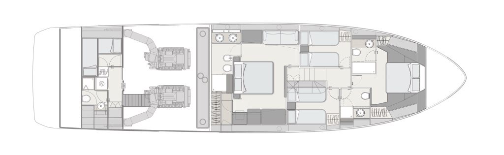 La navigazione è resa ancora più fluida e stabile dai doppi stabilizzatori giroscopici Seakeeper NG9 e NG6, per un comfort assoluto in ogni condizione di mare.