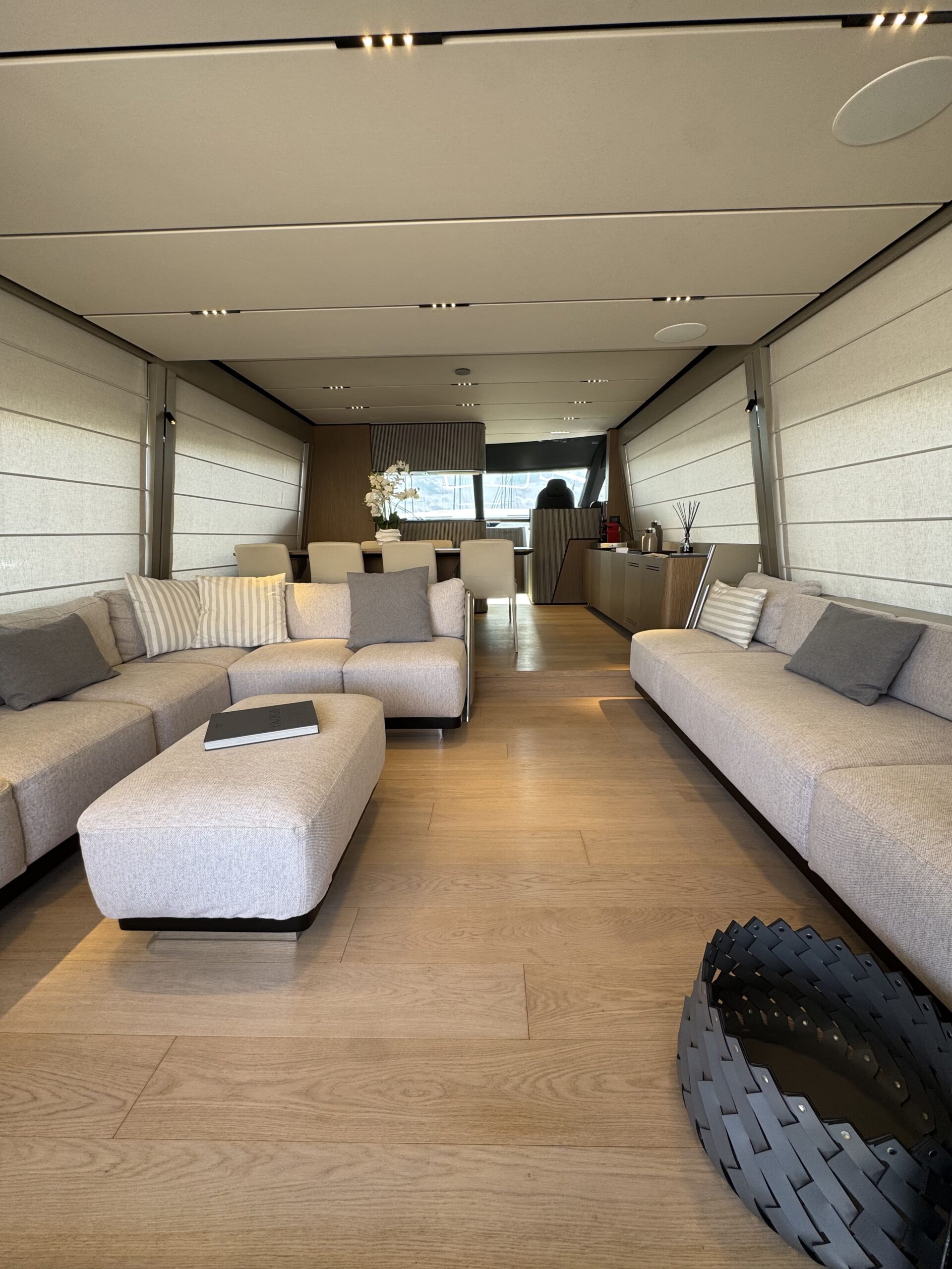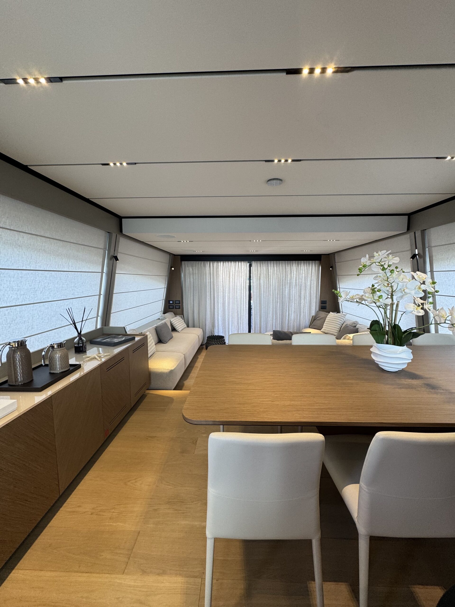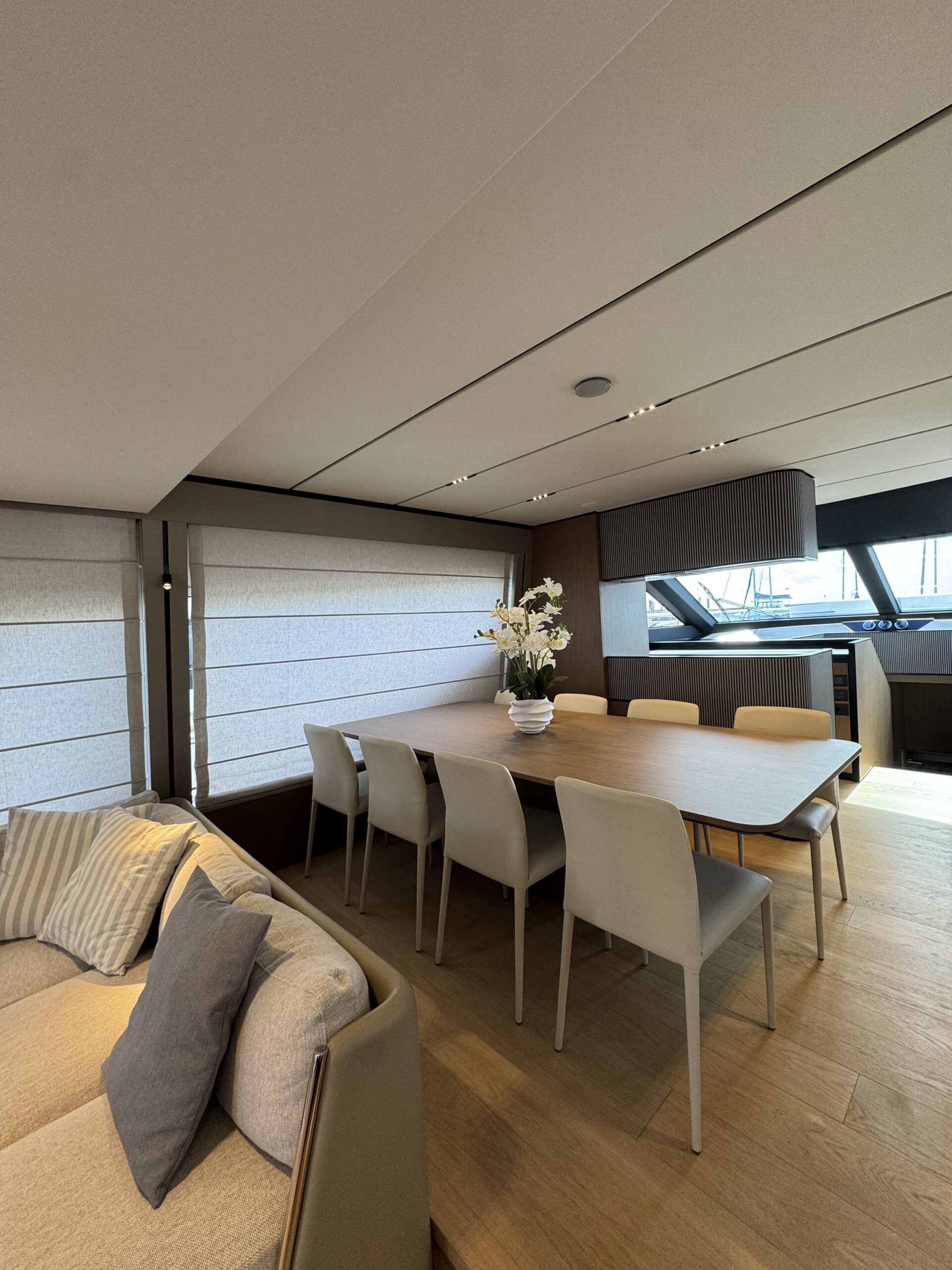 L'atmosfera sofisticata del main deck, impreziosita da parquet vintage white e tendaggi Zimmer+Rhode motorizzati, accoglie gli ospiti in un luminoso salone ampio, seguita da una zona dining valorizzata da un ampio tavolo in legno, perfetto per momenti di convivialità in navigazione o all'ancora.