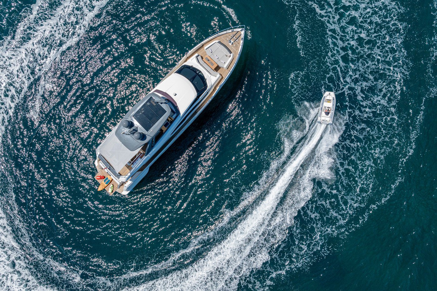 Il flybridge si distingue per la sua ampiezza e versatilità: qui trovano posto una seconda plancia, un angolo bar attrezzato e comode aree relax ideali per prendere il sole o sorseggiare un drink con vista panoramica.