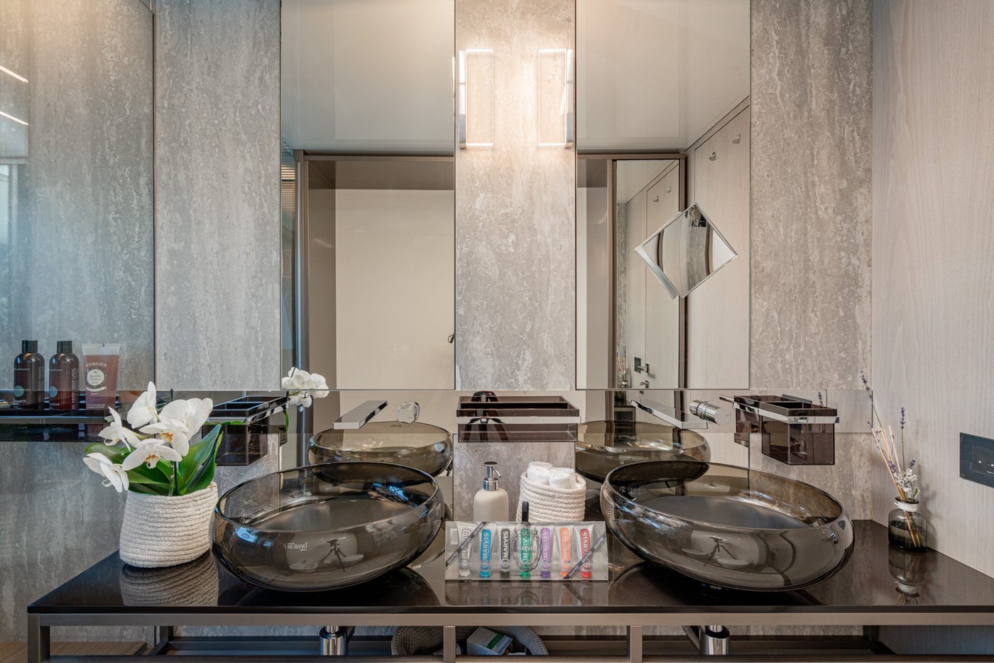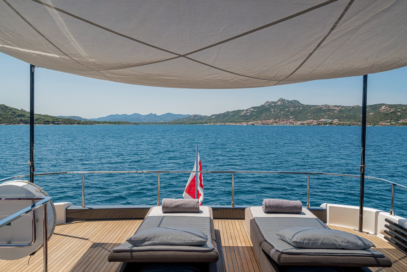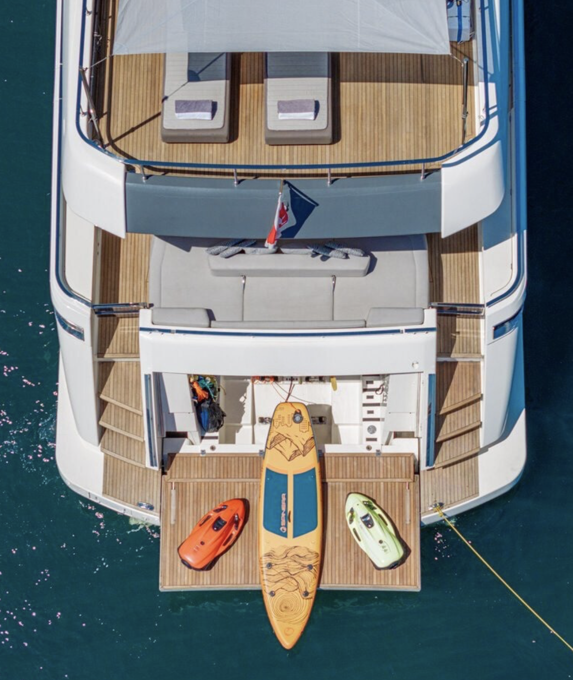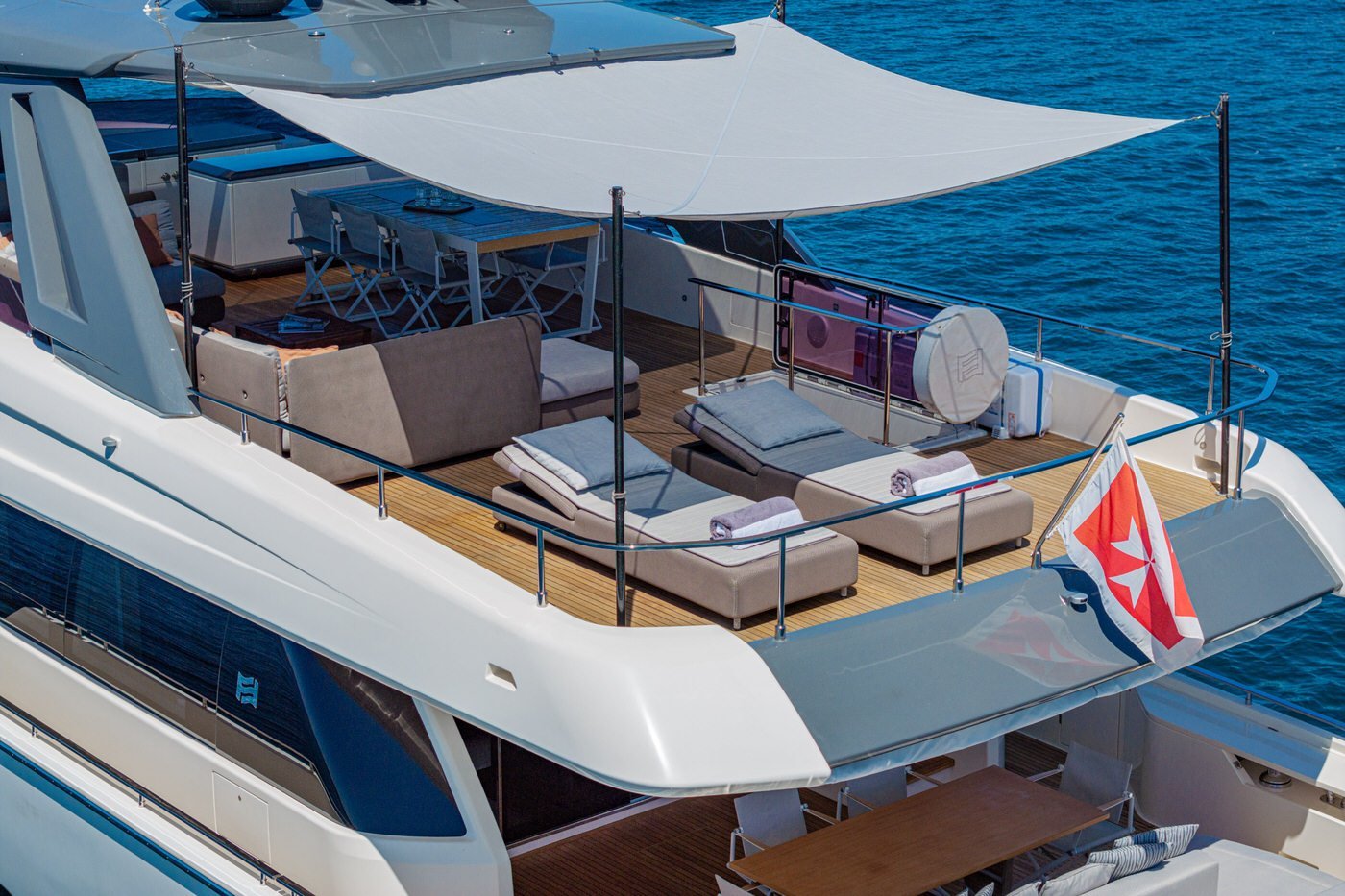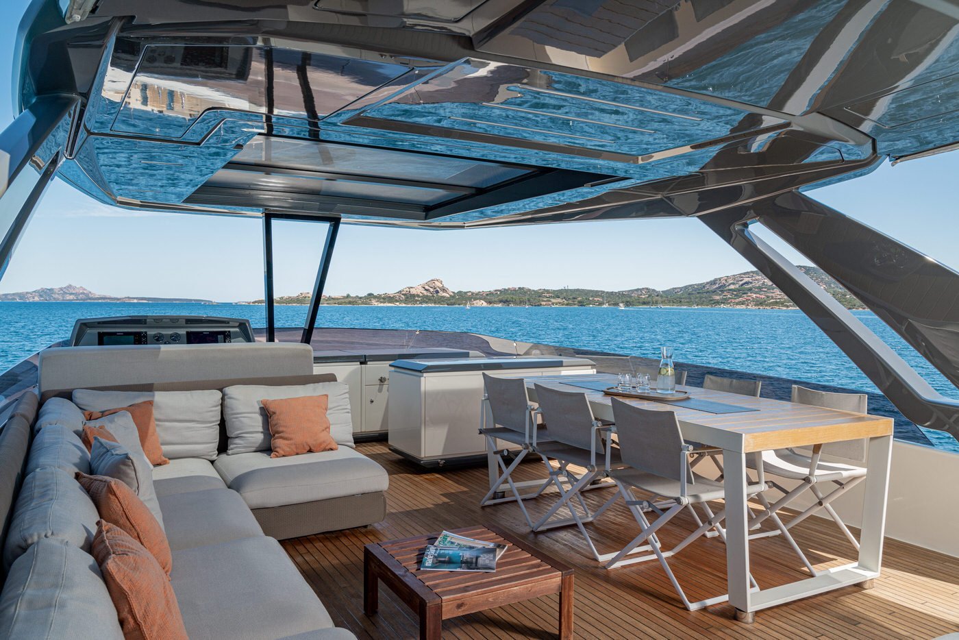 La poppa, infine, si apre verso il mare trasformandosi in un elegante beach club, grazie al portellone abbattibile che crea una piattaforma a livello dell'acqua: un vero salotto sull'oceano.