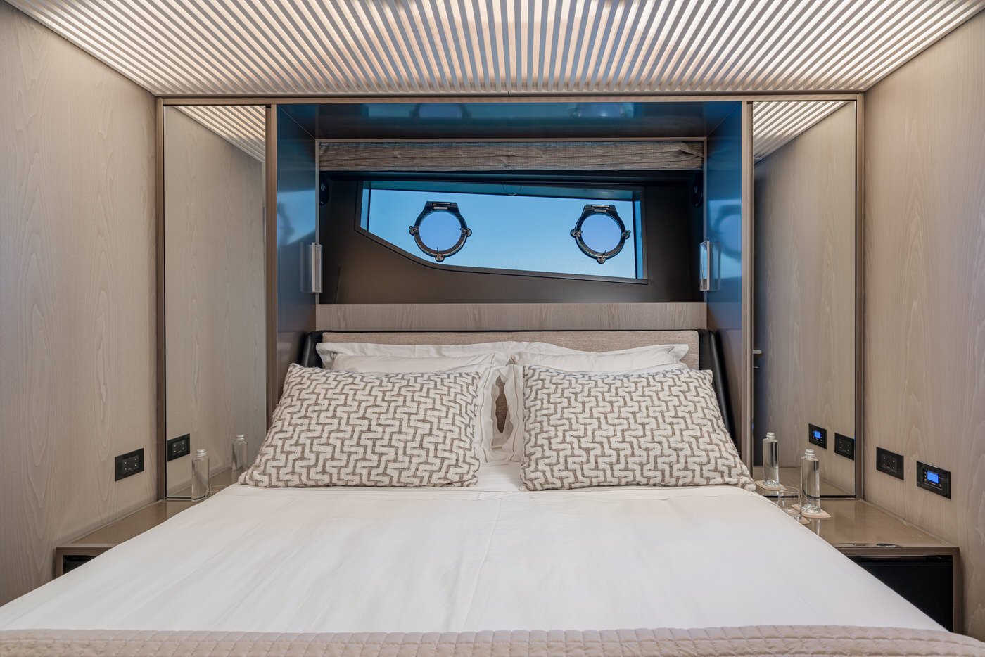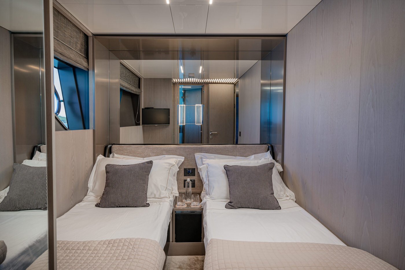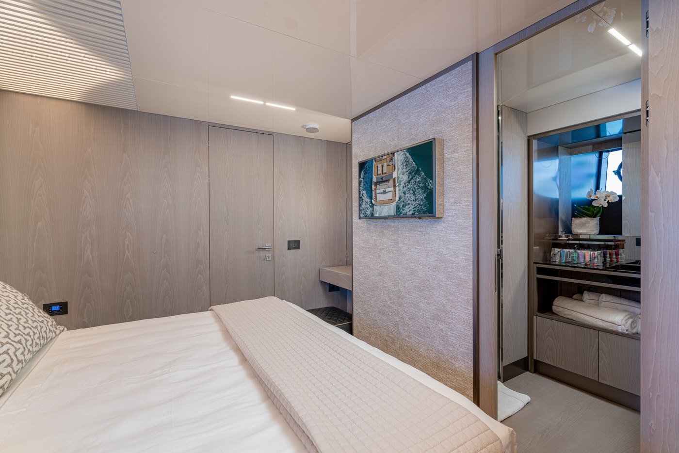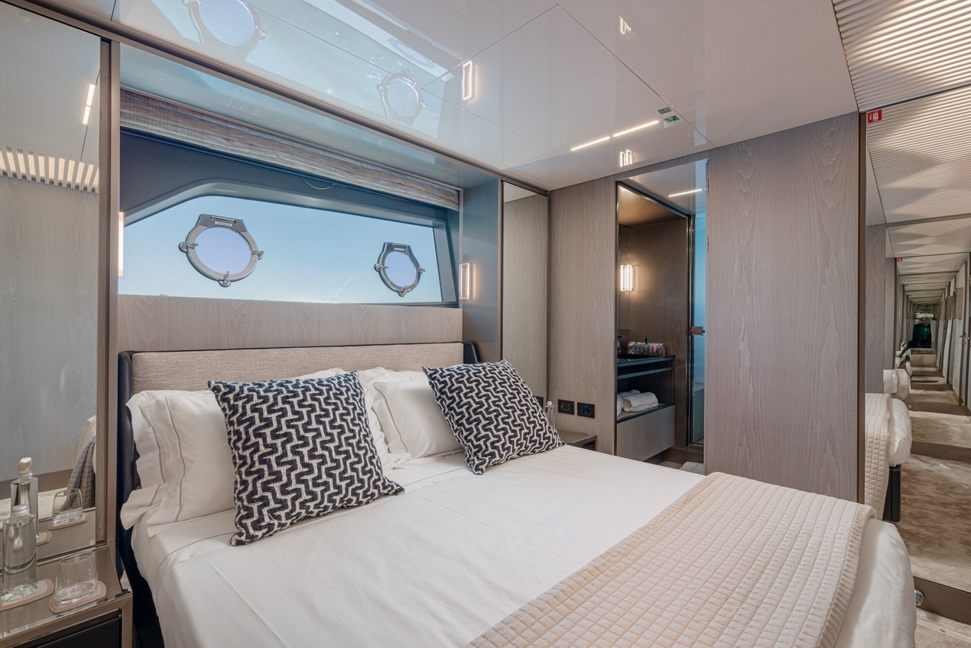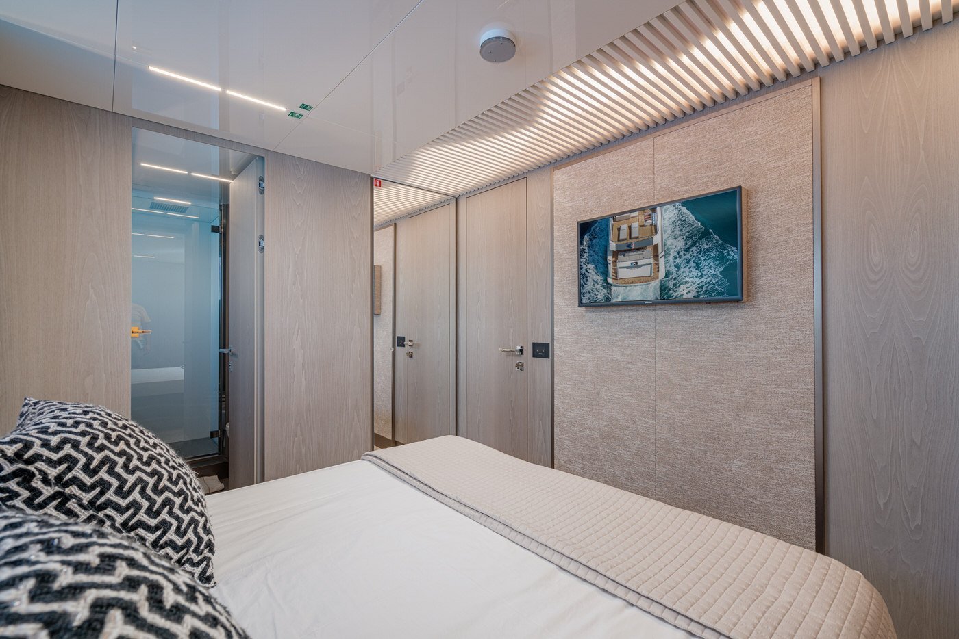 La zona ospiti comprende quattro cabine, tutte con bagno en-suite: una cabina armatoriale a tutto baglio a centro barca, due cabine VIP e una con letti singoli in piano.