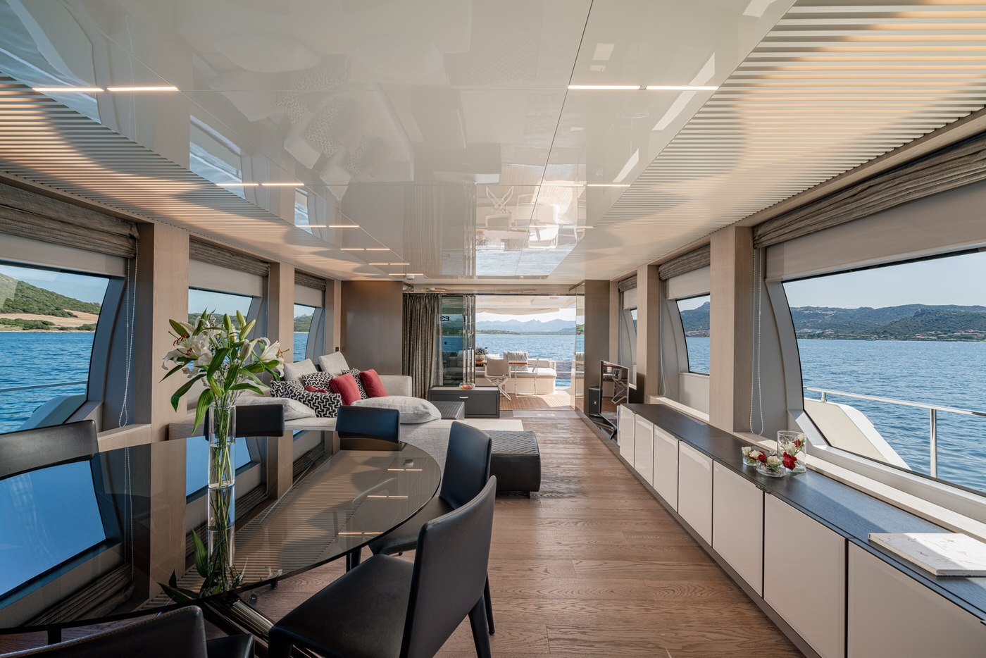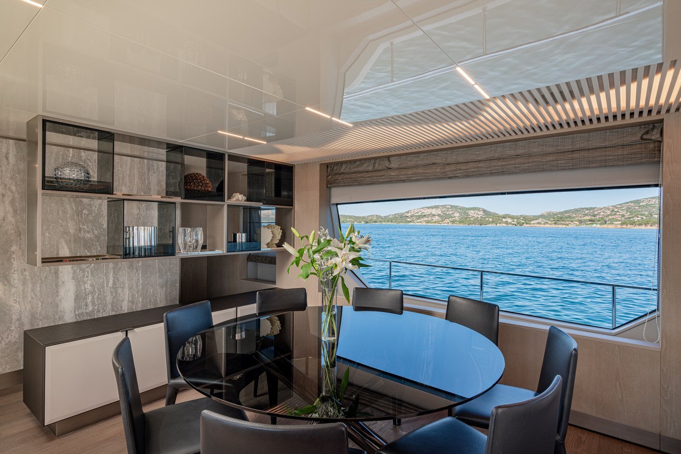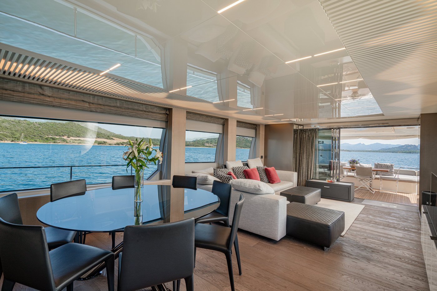 All'interno, gli spazi sono distribuiti con intelligenza e attenzione al dettaglio. Il main deck accoglie un salone luminoso e raffinato, circondato da vetrate a tutta altezza che offrono una vista continua sul mare. La zona pranzo, situata a prua del salone, è impreziosita da un tavolo rotondo in cristallo, perfetto per cene eleganti e momenti conviviali. La cucina è completamente attrezzata con elettrodomestici di ultima generazione, mentre la plancia è dotata di strumentazione Simrad touchscreen, in linea con l'approccio tecnologico e funzionale dell'imbarcazione. A disposizione degli ospiti anche un bagno di giorno, comodo e discreto.