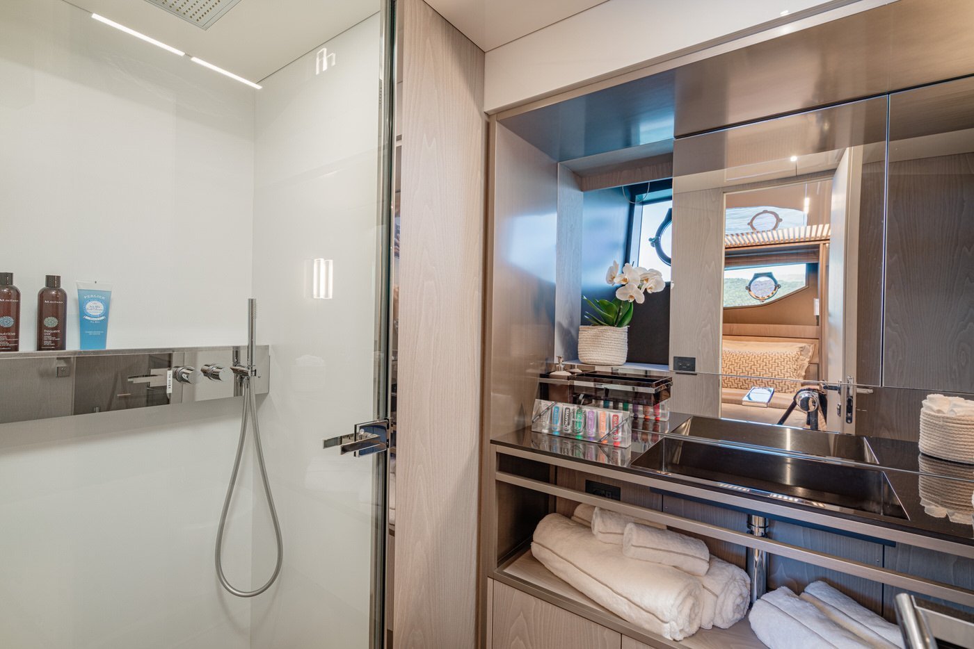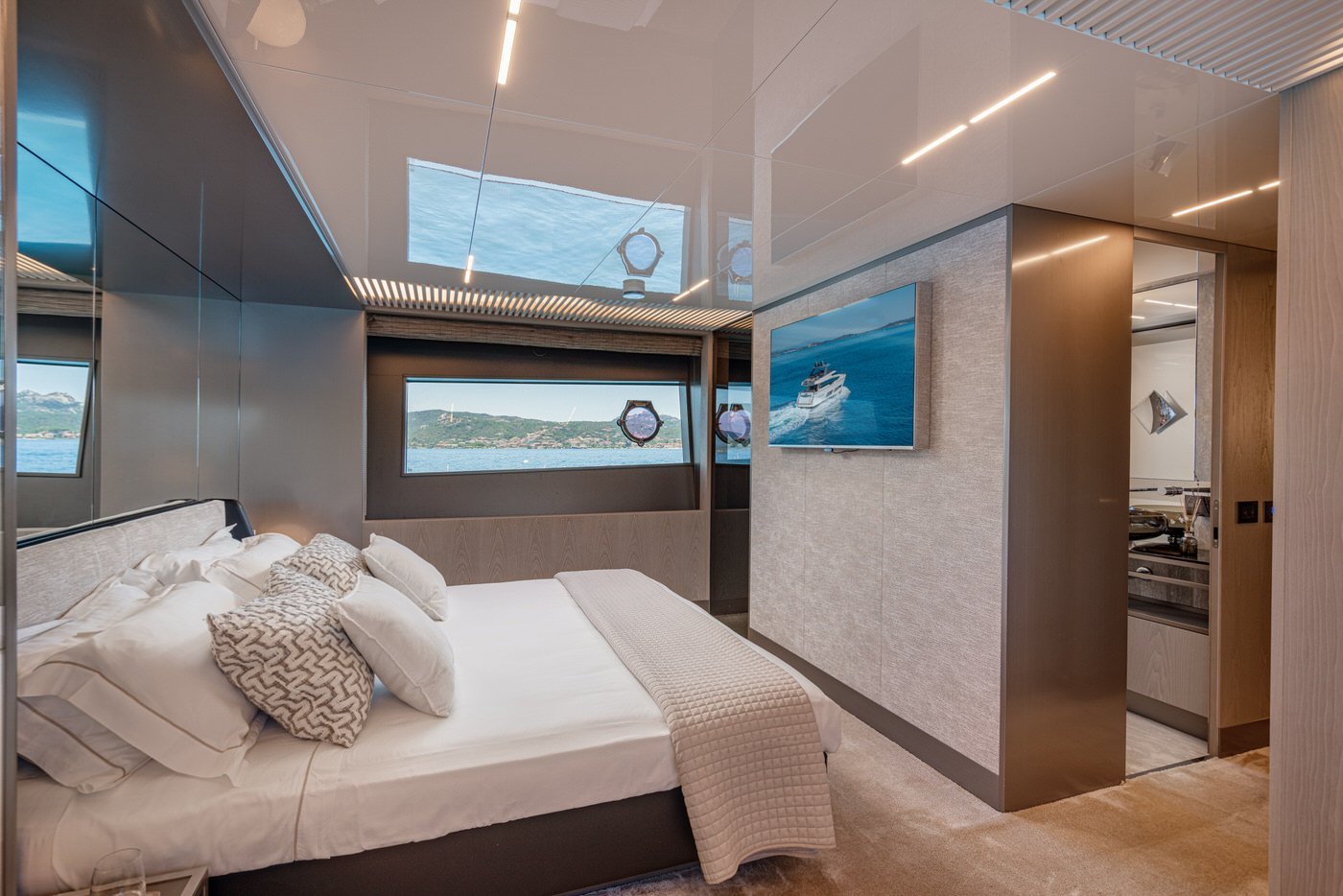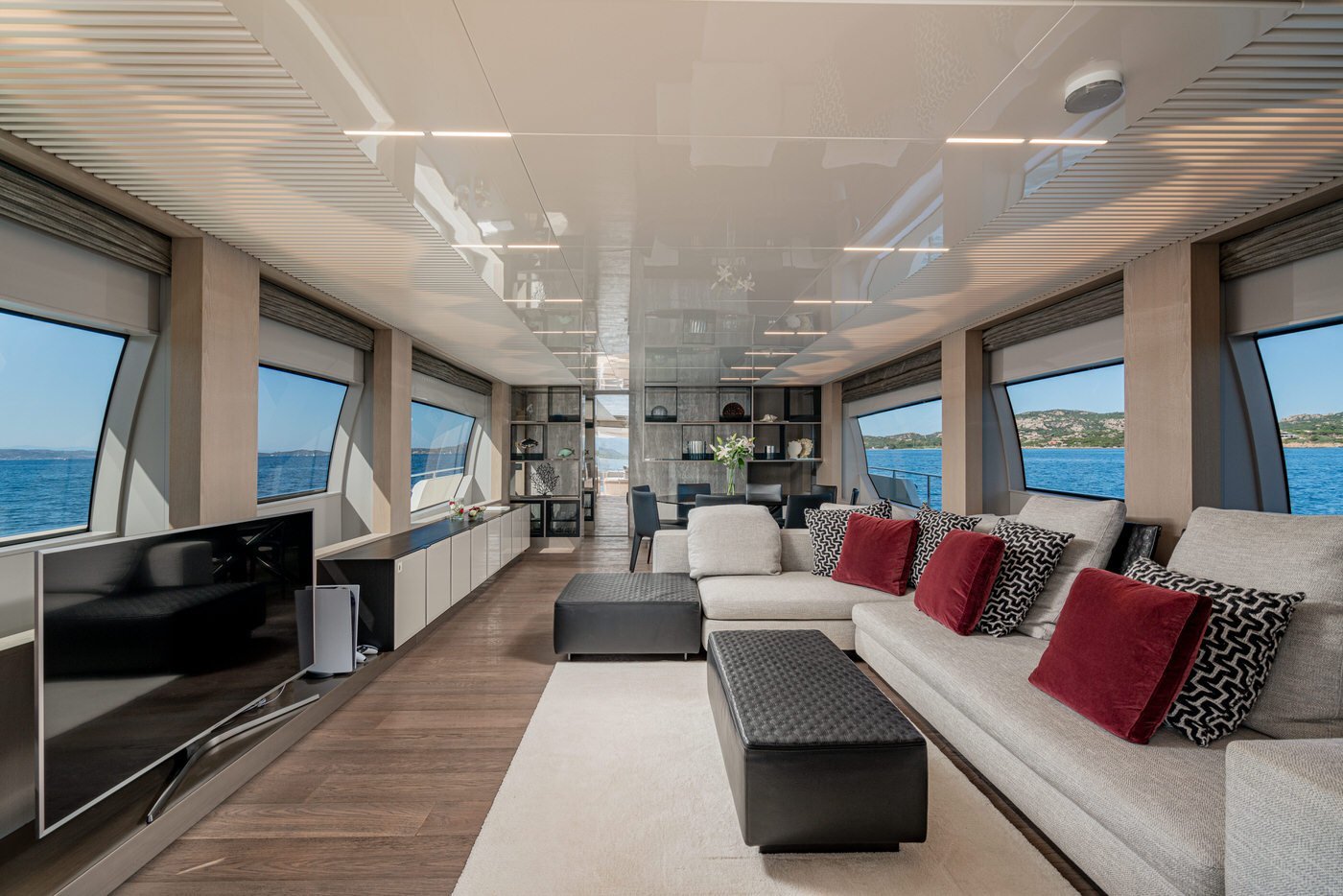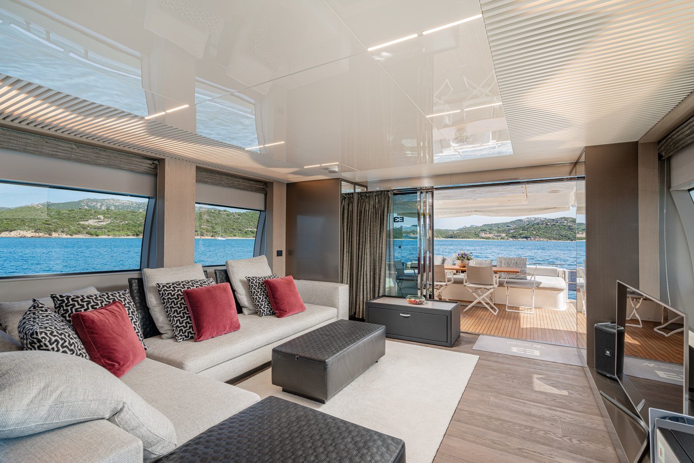 All'interno, gli spazi sono distribuiti con intelligenza e attenzione al dettaglio. Il main deck accoglie un salone luminoso e raffinato, circondato da vetrate a tutta altezza che offrono una vista continua sul mare. La zona pranzo, situata a prua del salone, è impreziosita da un tavolo rotondo in cristallo, perfetto per cene eleganti e momenti conviviali. La cucina è completamente attrezzata con elettrodomestici di ultima generazione, mentre la plancia è dotata di strumentazione Simrad touchscreen, in linea con l'approccio tecnologico e funzionale dell'imbarcazione. A disposizione degli ospiti anche un bagno di giorno, comodo e discreto.