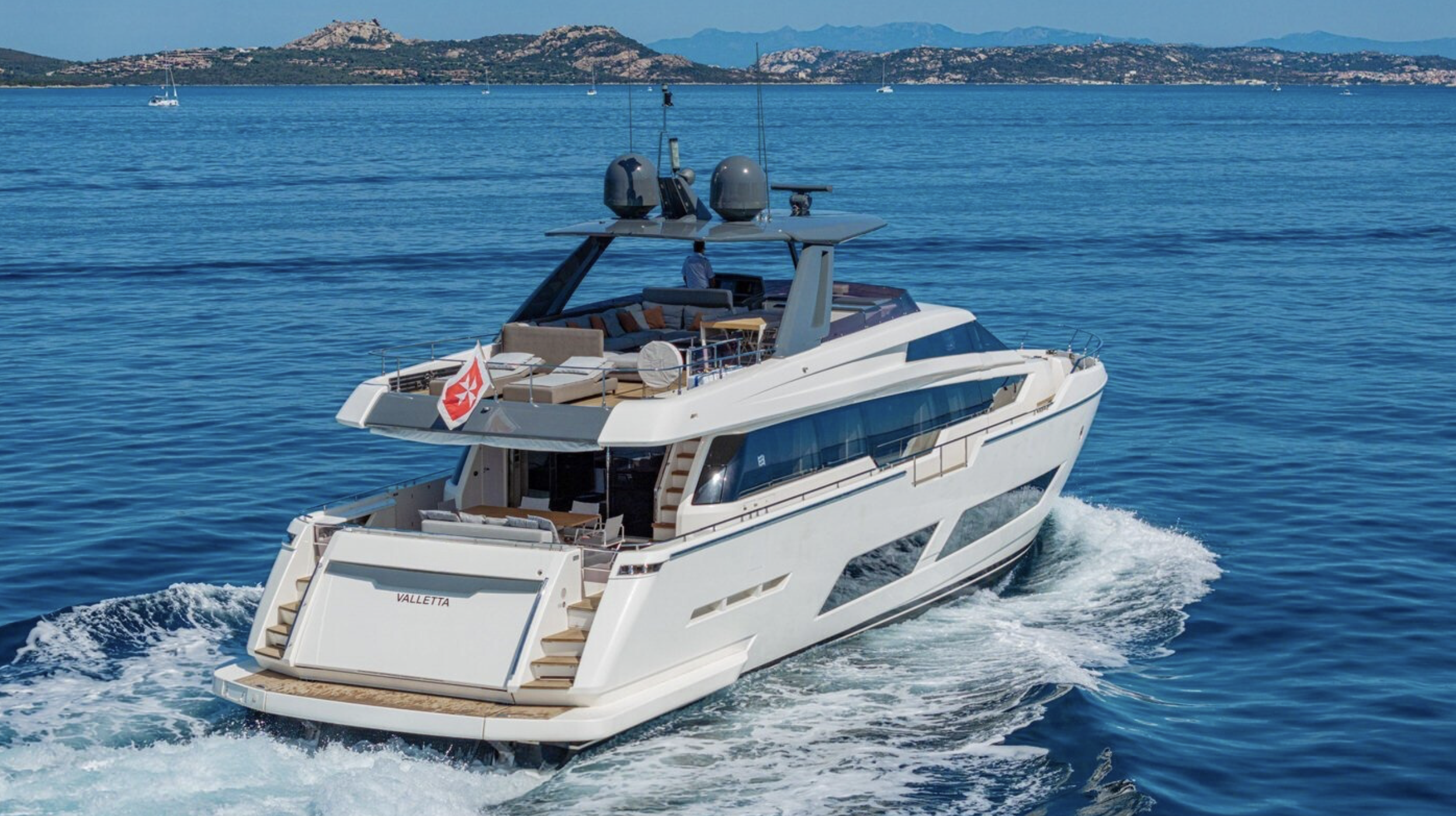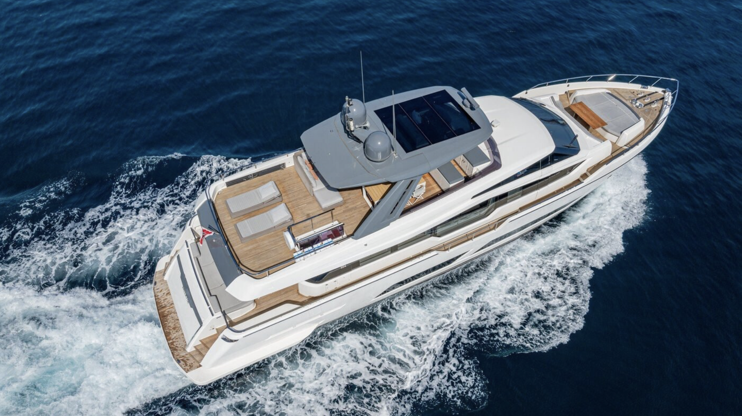 Questo flybridge di grande fascino ha una lunghezza fuori tutto di 26,14 metri ed è dotato di due motori MAN V12 da 1900 cavalli ciascuno, che garantiscono una velocità di crociera di 27 nodi e una punta massima di 31 nodi. Le brillanti prestazioni si combinano a una navigazione fluida e silenziosa anche grazie alla qualità costruttiva e all'ottimizzazione della carena.