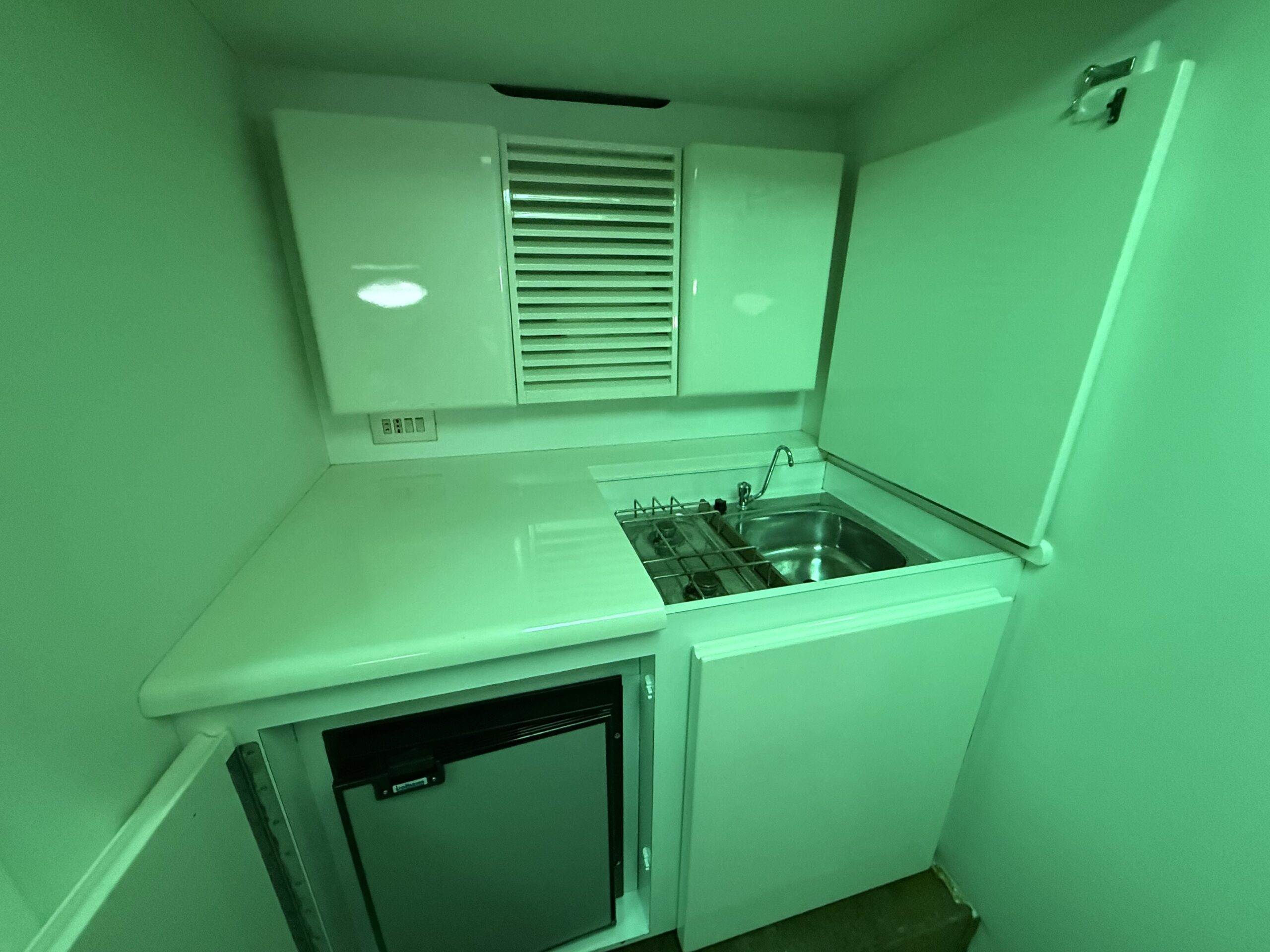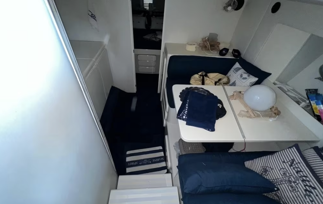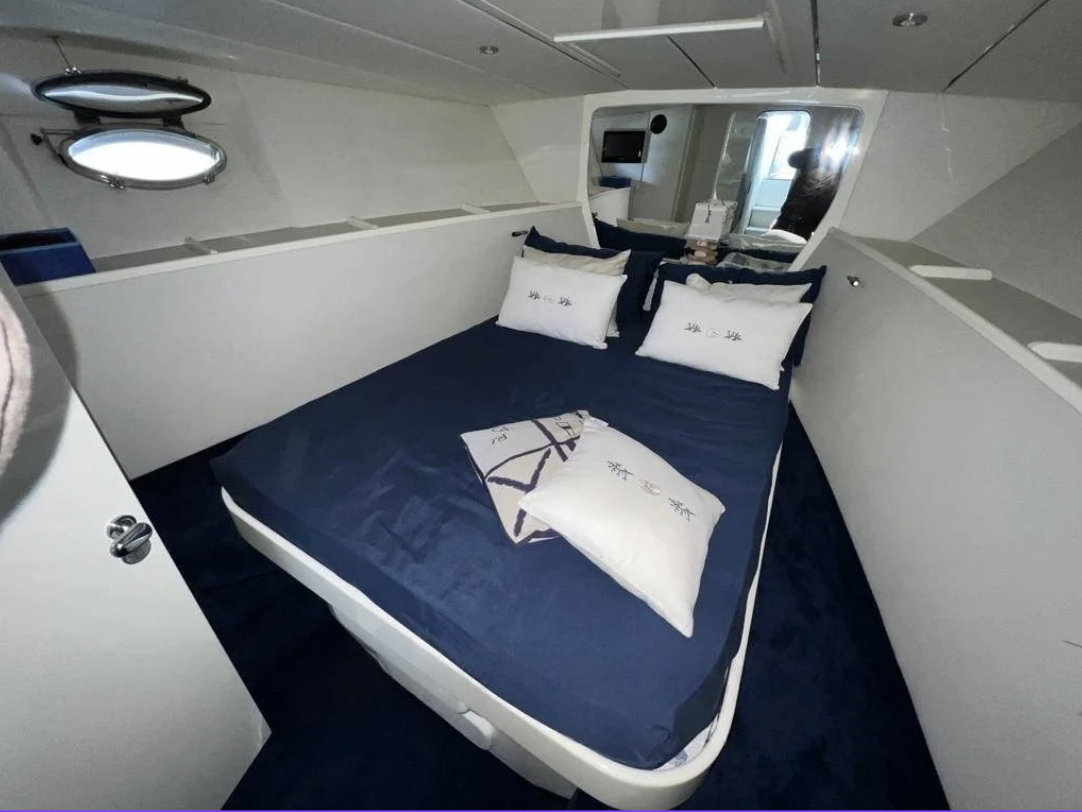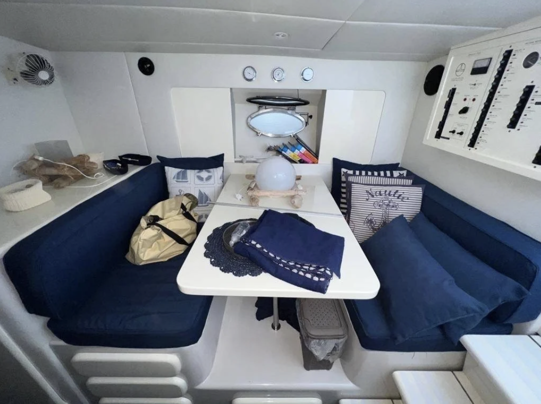 Gli spazi interni sono curati e accoglienti: una cabina matrimoniale, un bagno con servizi completi e una dinette trasformabile in letto doppio permettono di ospitare comodamente fino a quattro persone. Gli ambienti sono impreziositi da finiture di qualità e da un design sobrio, tipicamente italiano.