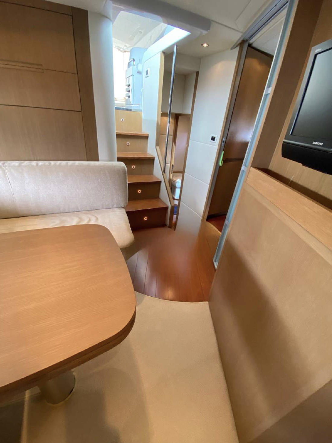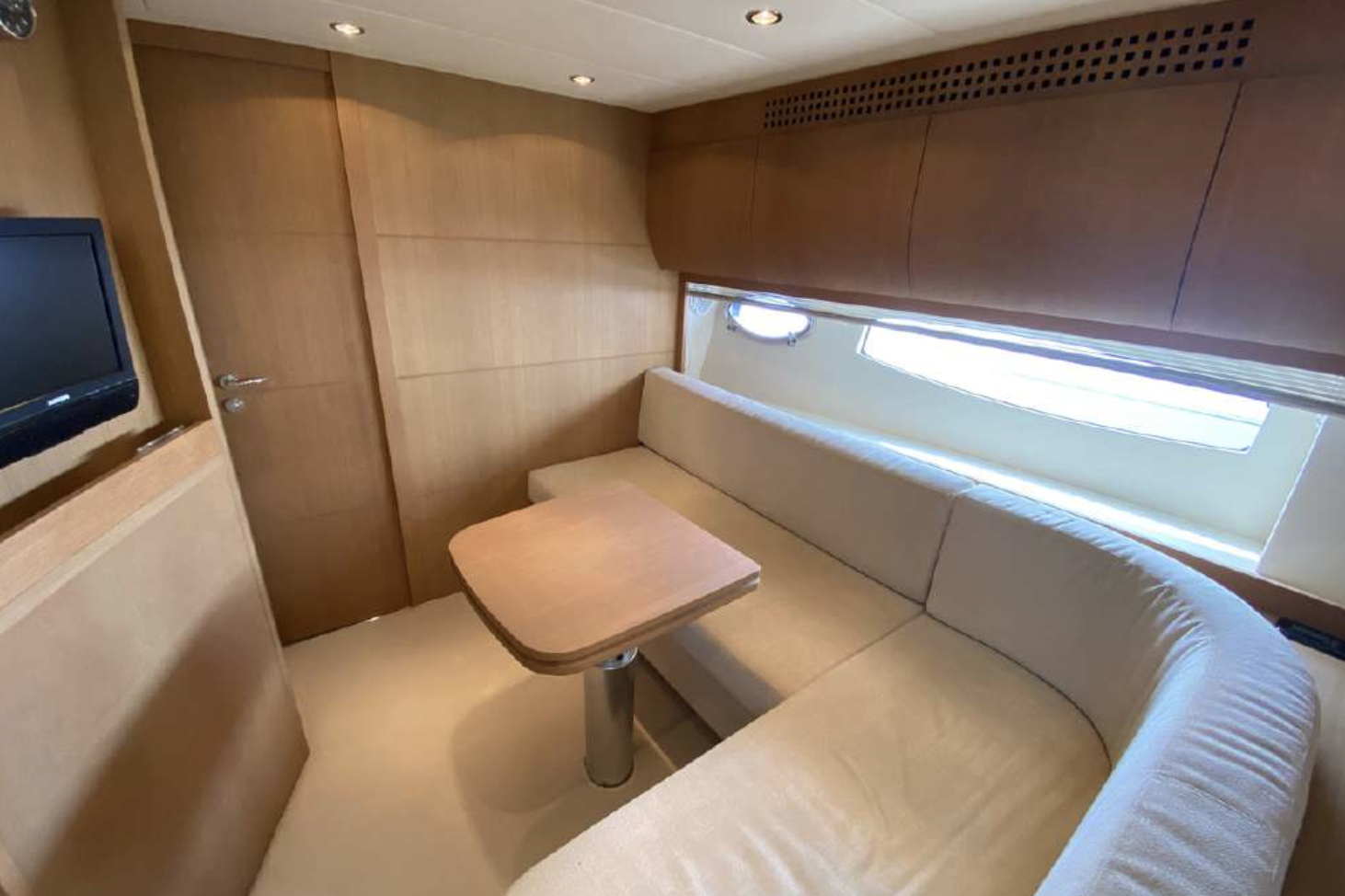 Gli spazi esterni sono progettati per il massimo relax e convivialità: ampi prendisole a prua e a poppa invitano a godersi il sole, mentre il pozzetto accoglie con comodi divani e un tavolo estendibile, perfetto per pranzi e momenti di socialità. La plancia di comando è affiancata da un divano per il co-pilota, creando uno spazio funzionale e accogliente.