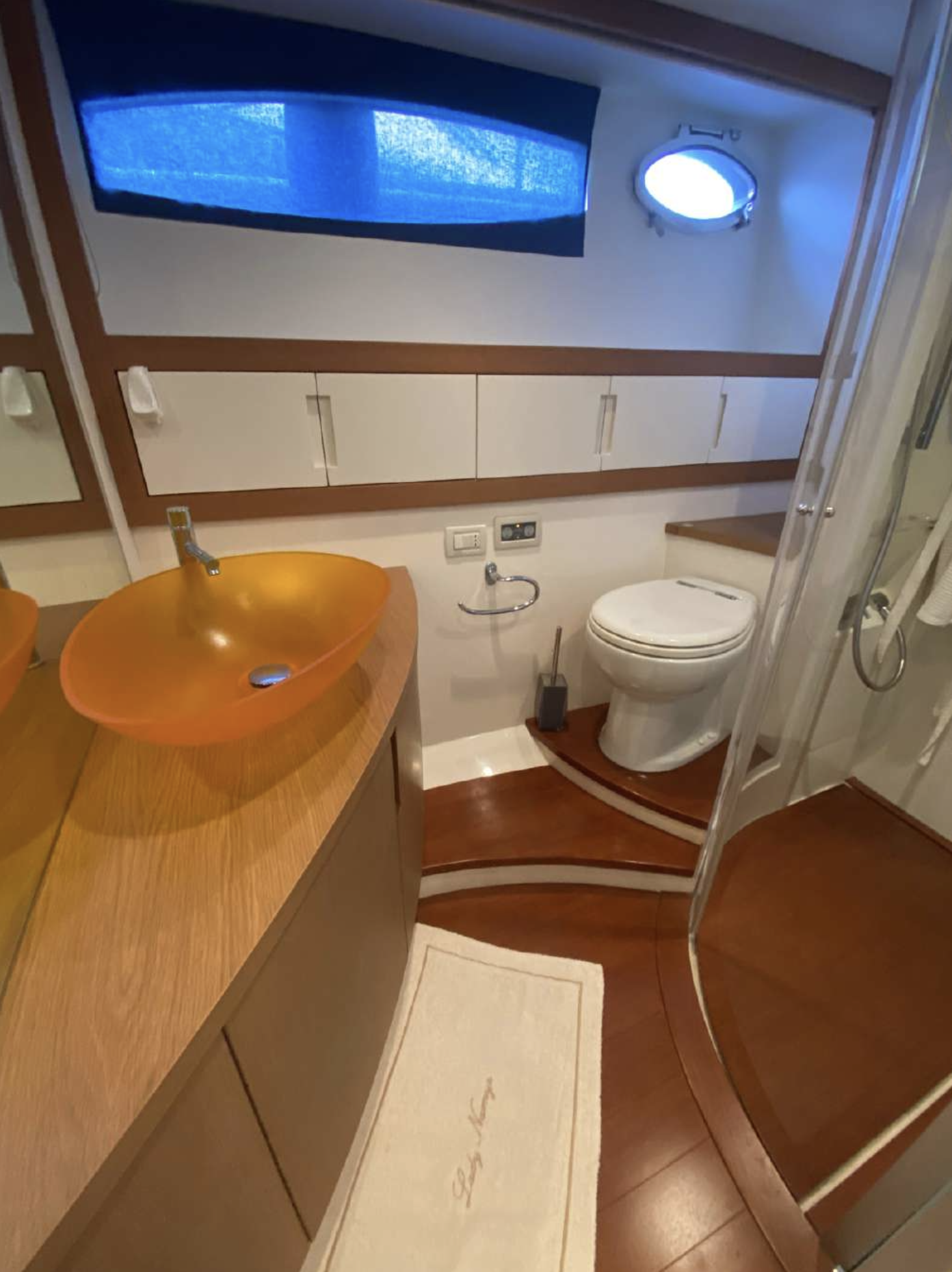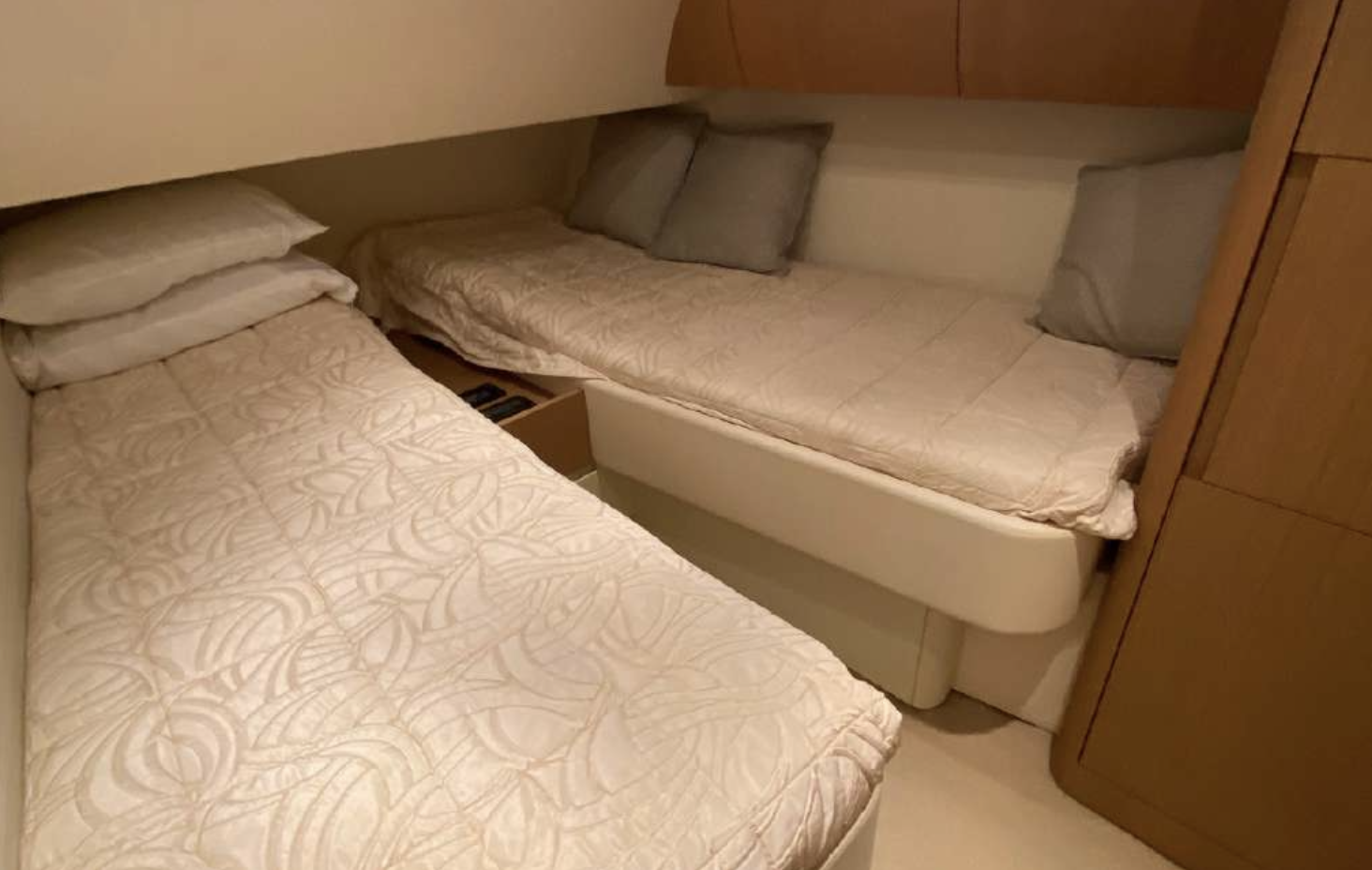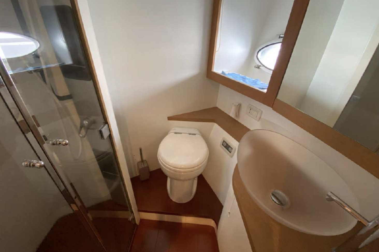 La zona ospiti dispone di 3 cabine e 3 bagni. Una cabina armatoriale centrale a tutto baglio, con bagno privato e ampi spazi per riporre effetti personali, pensata per garantire il massimo comfort e privacy. A prua, la cabina VIP matrimoniale dispone anch’essa di bagno privato, mentre la cabina ospiti offre letti in piano e un bagno condiviso, utilizzabile anche come bagno diurno.