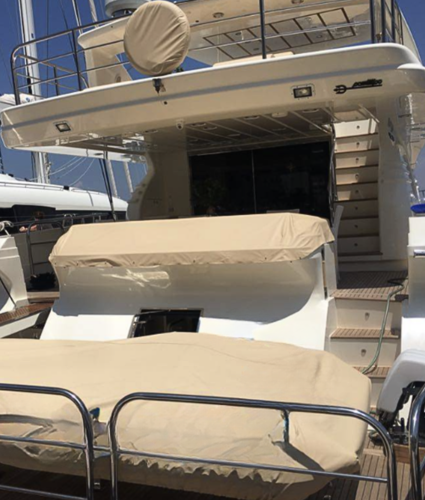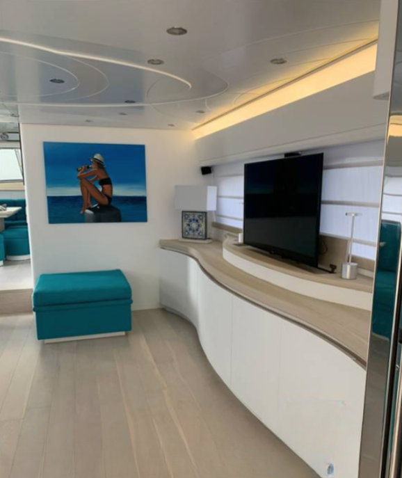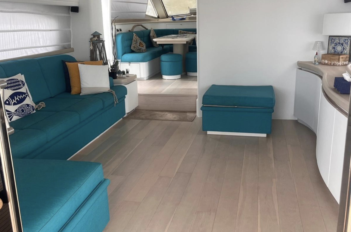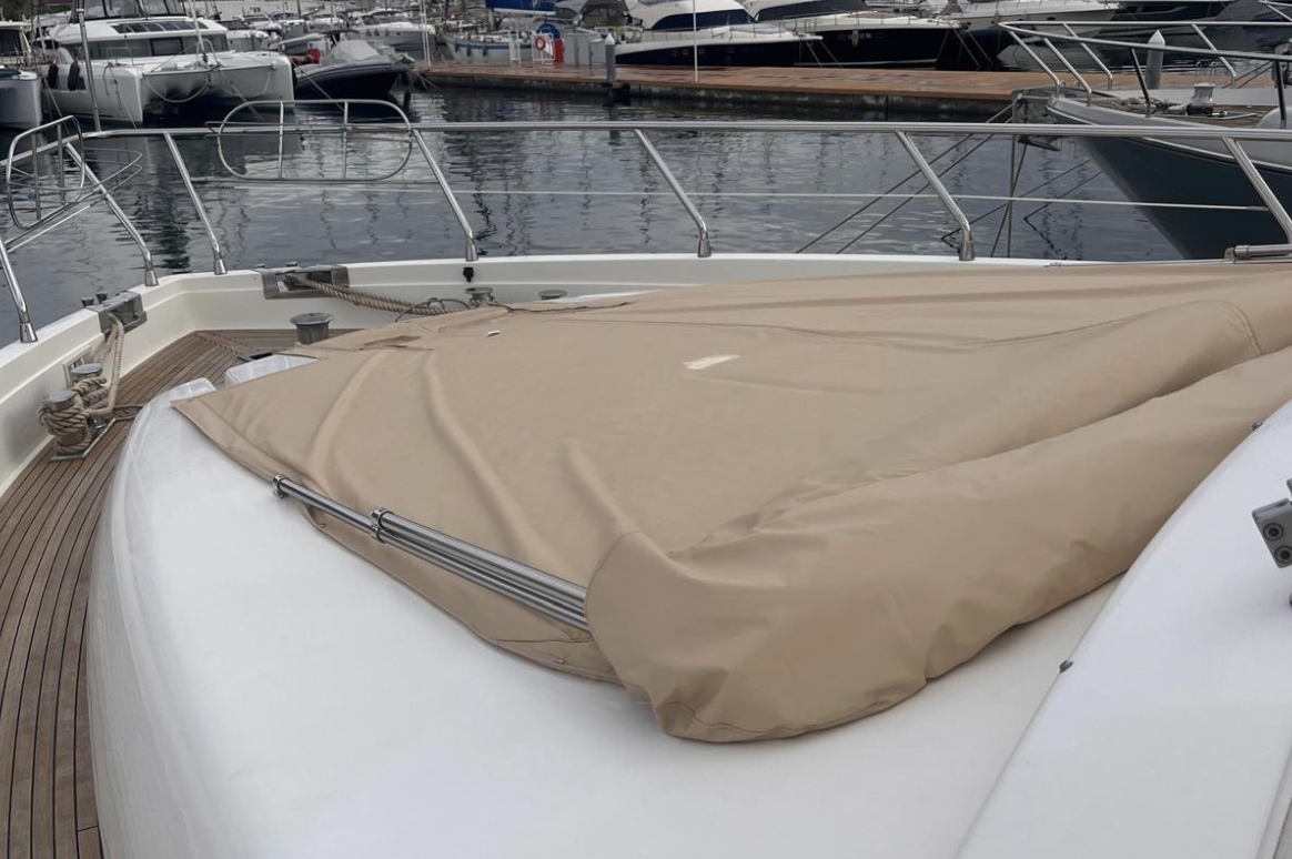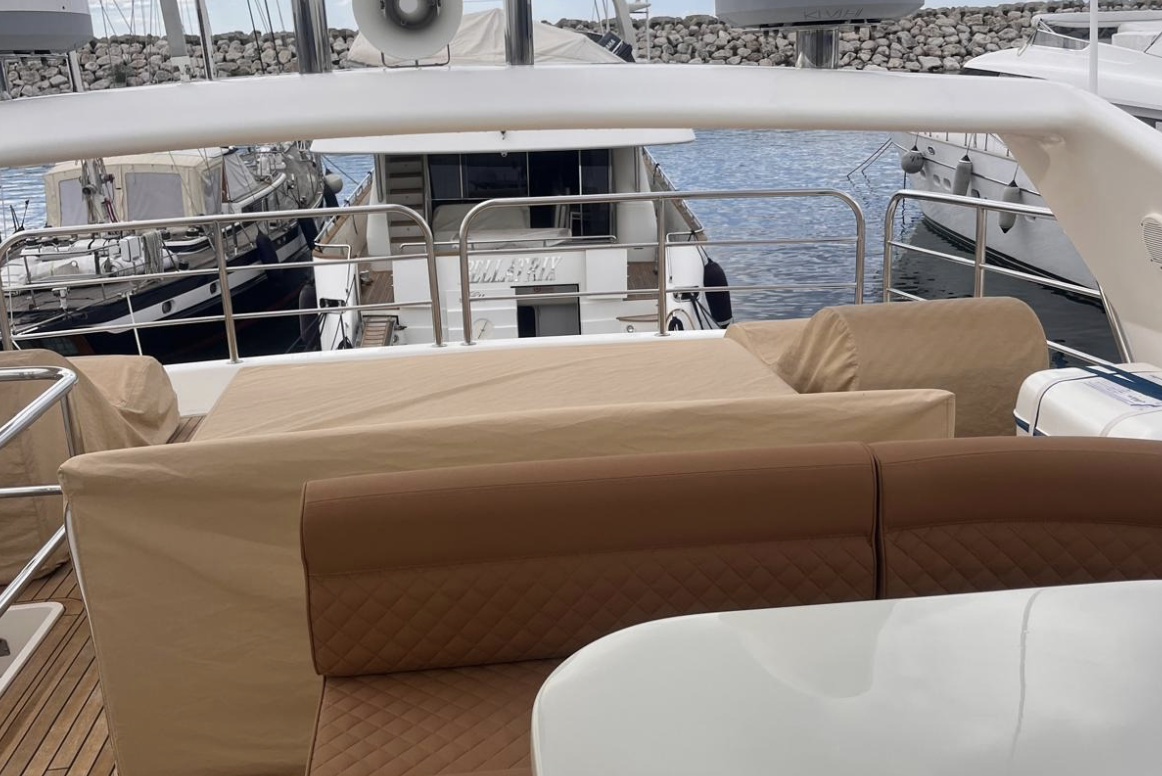 L'imbarcazione, mantenuta in condizioni eccellenti e sottoposta ad un importante refitting generale, accoglie gli ospiti in ampi spazi esterni pensati per il relax e la convivialità. Il flybridge, con tetto rigido e roll-bar, ospita un grande divano a "U" con tavolo da pranzo, mobile attrezzato con frigorifero, lavandino e BBQ. A prua si trova un ampio prendisole con cuscineria, mentre a poppa il pozzetto in teak offre un elegante spazio all'aperto con tavolo, divano, quattro poltrone e tendalino privacy.