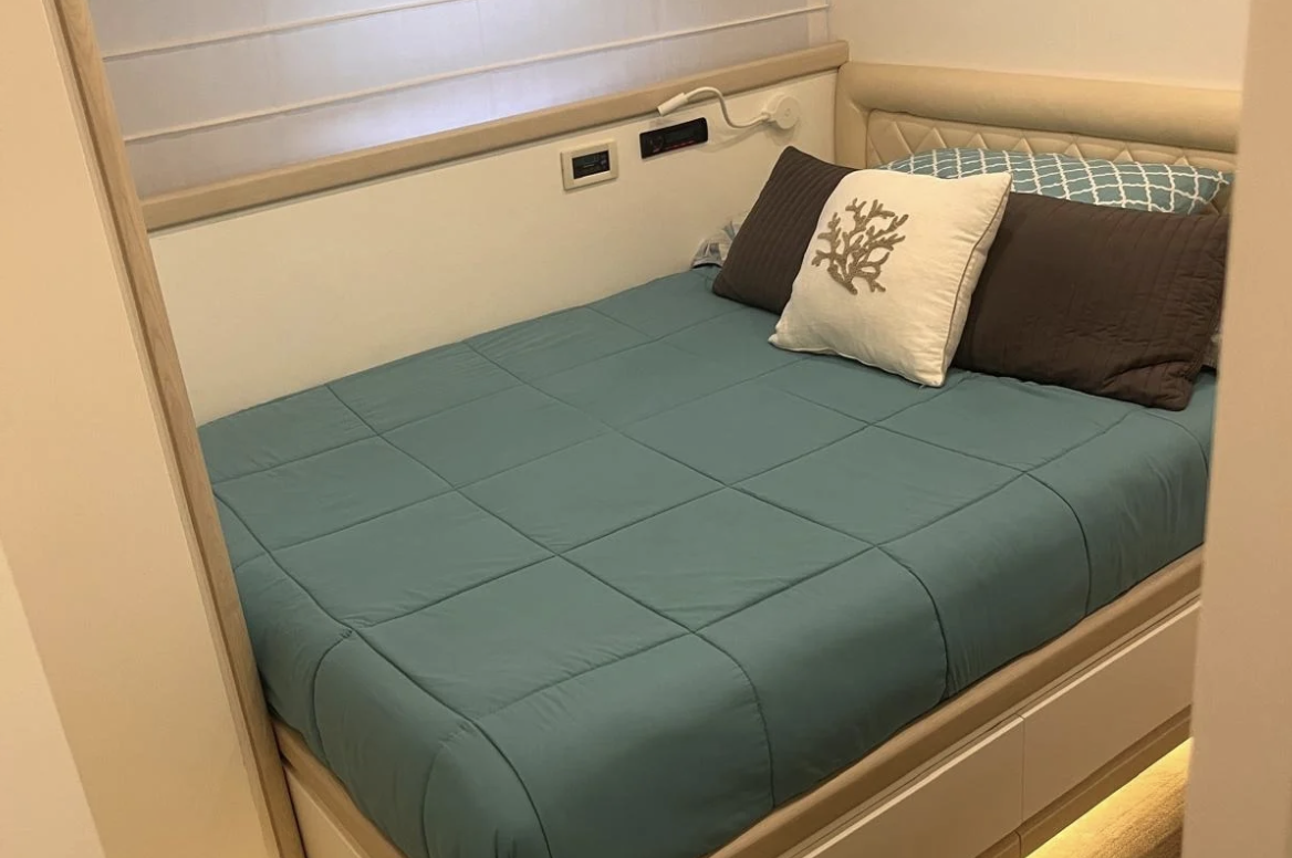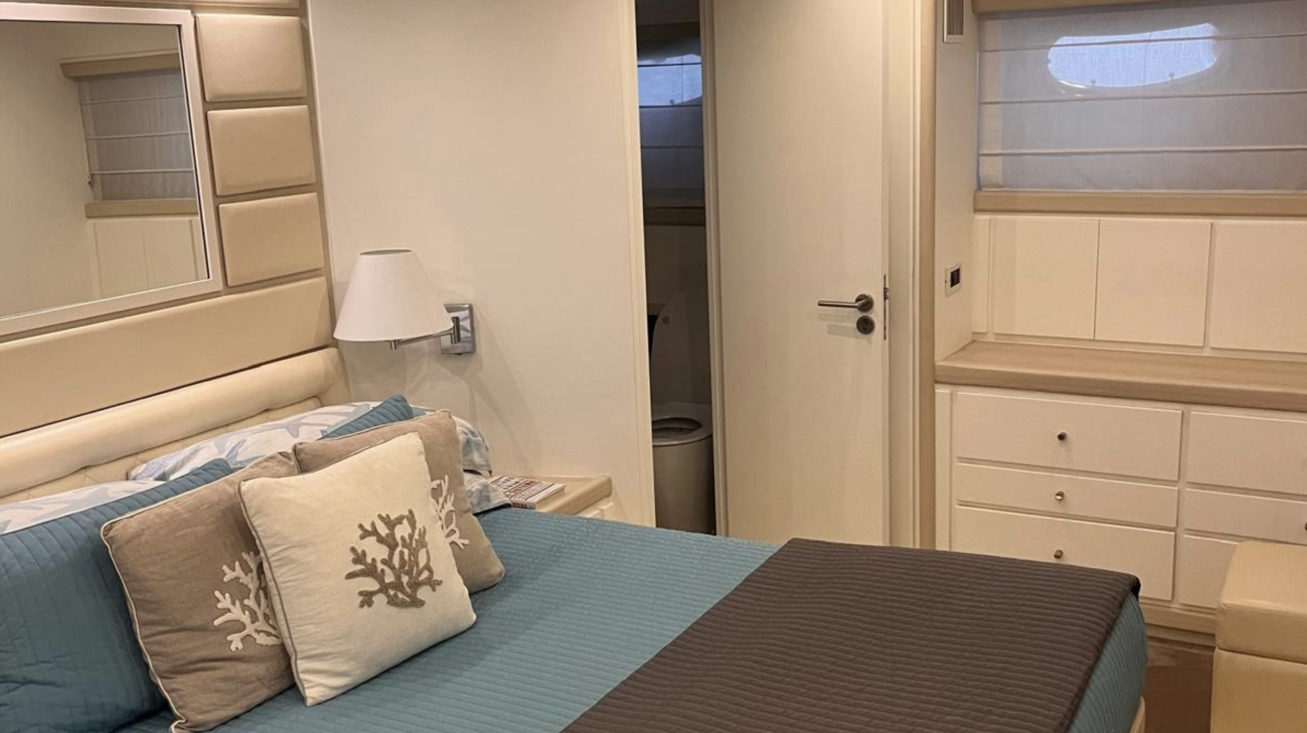 La zona ospiti comprende 4 cabine: una cabina armatoriale a centro barca con bagno privato, una cabina VIP a prua, due cabine ospiti ciascuna con servizi dedicati, oltre a due cabine equipaggio con ingresso indipendente.